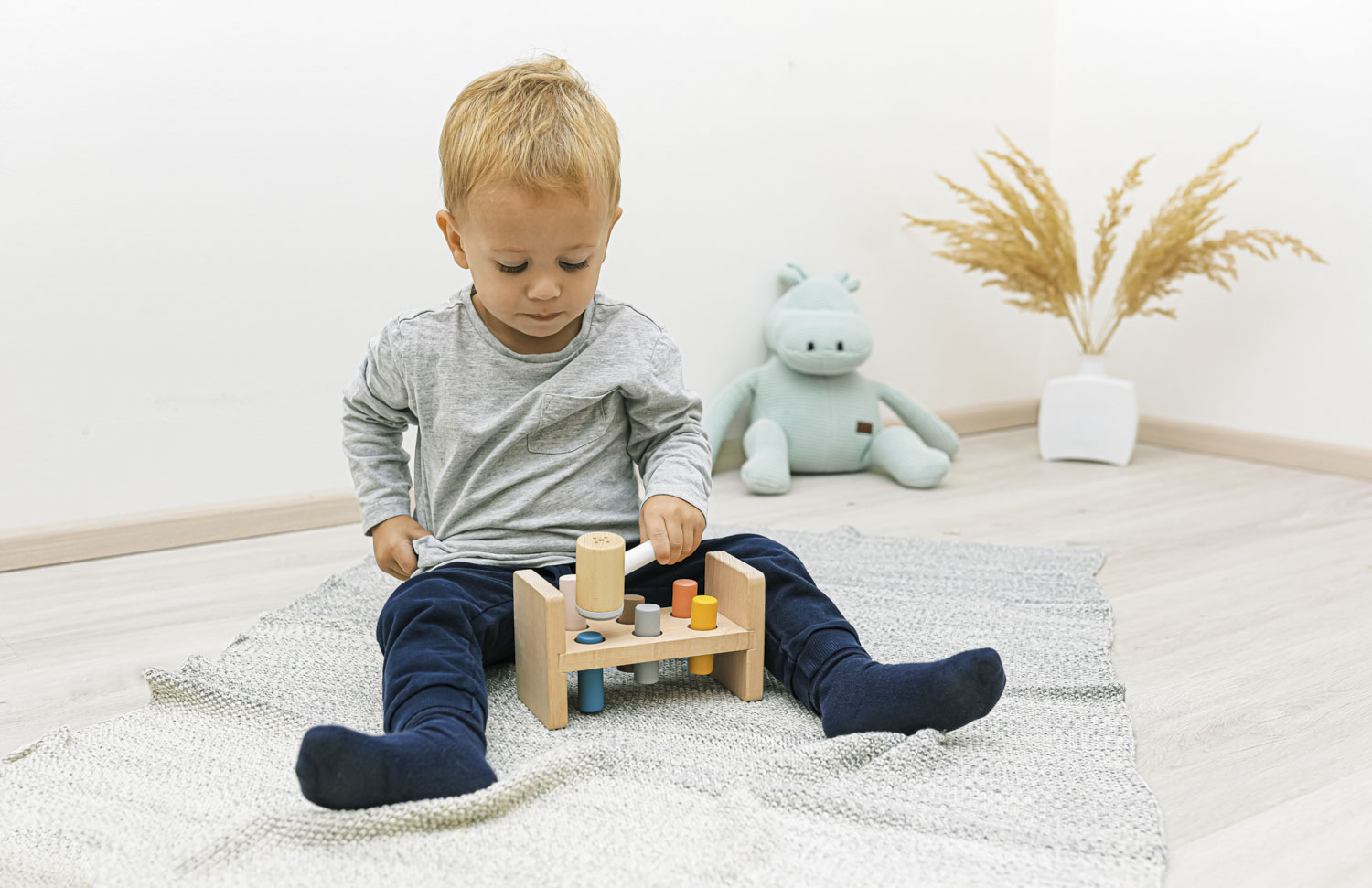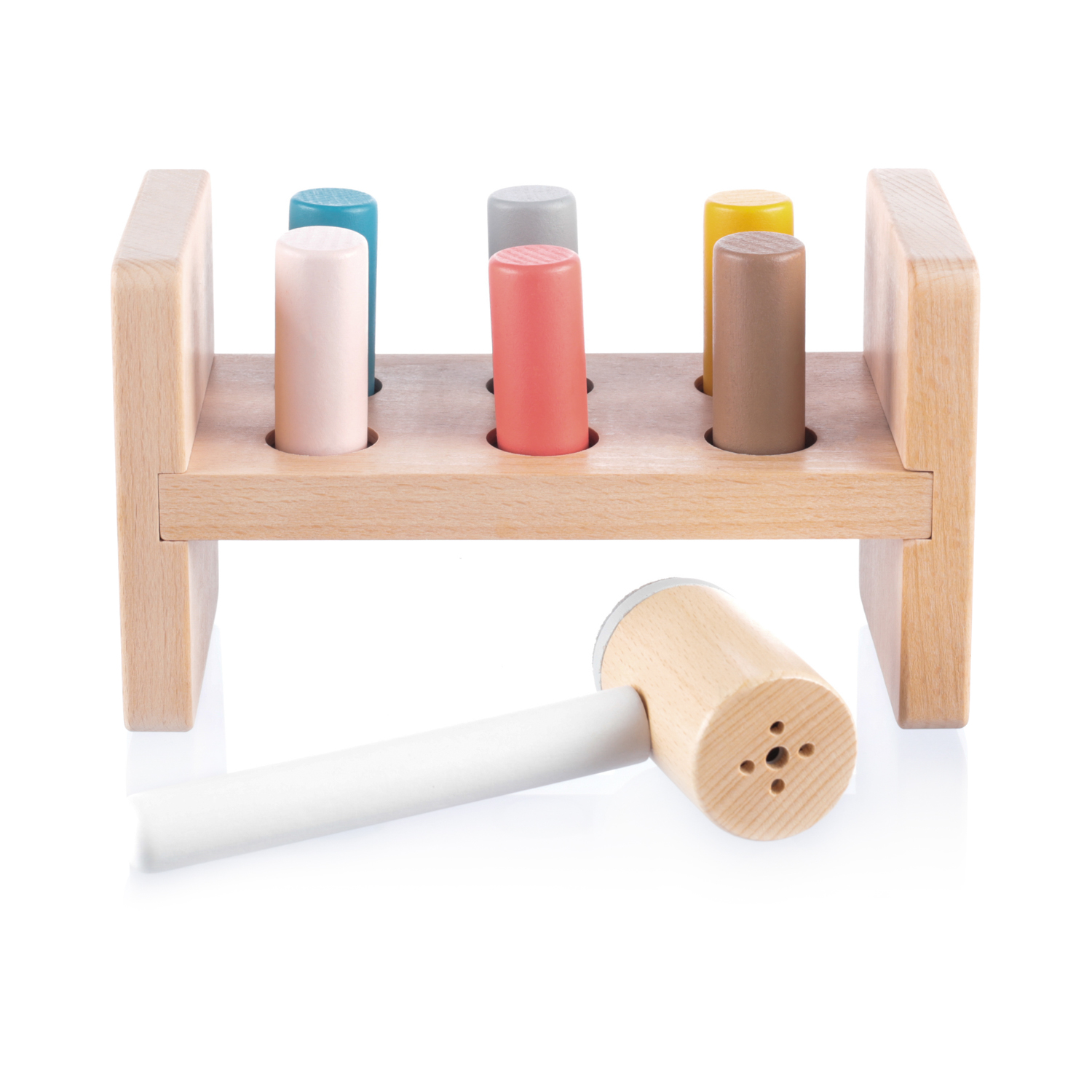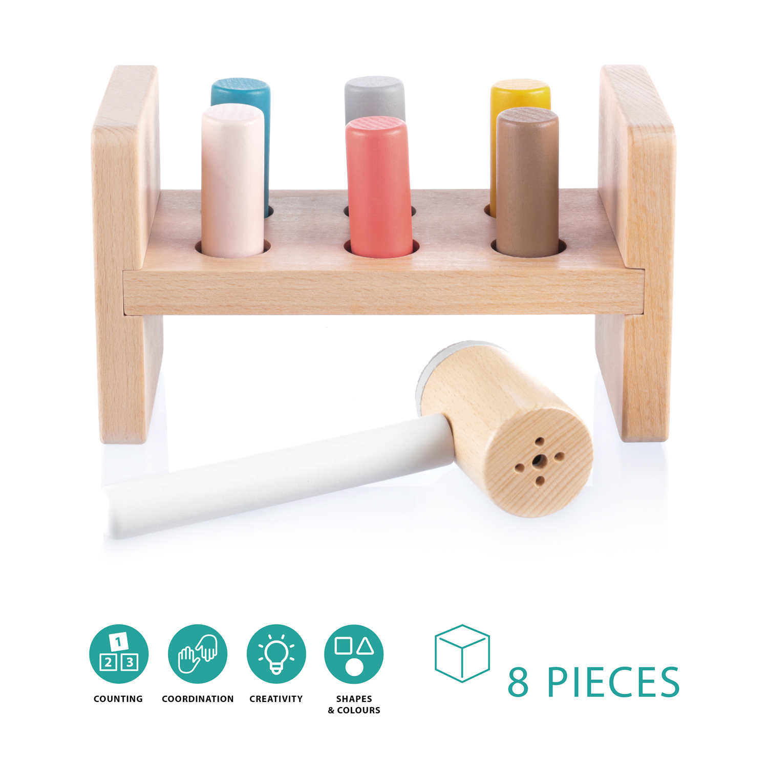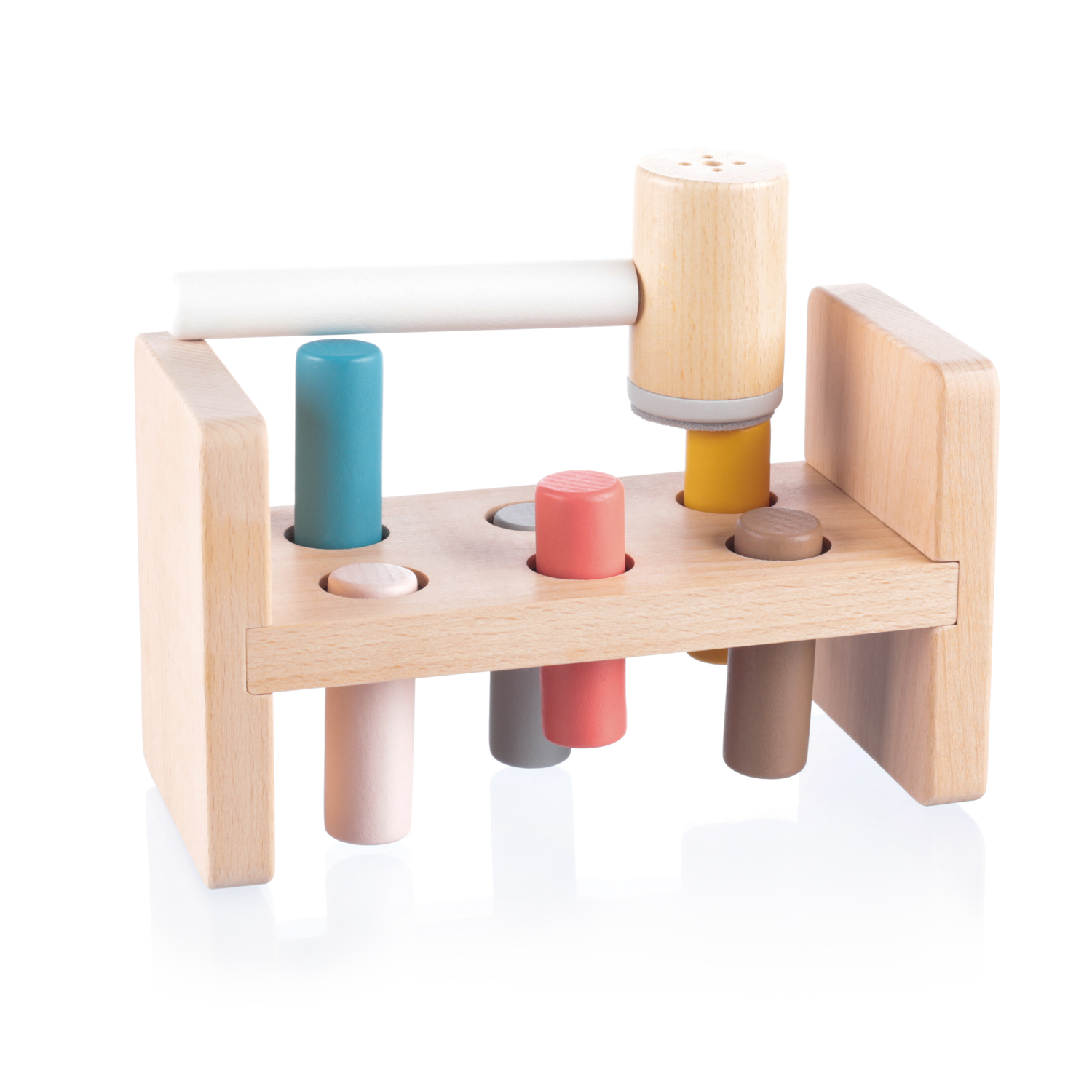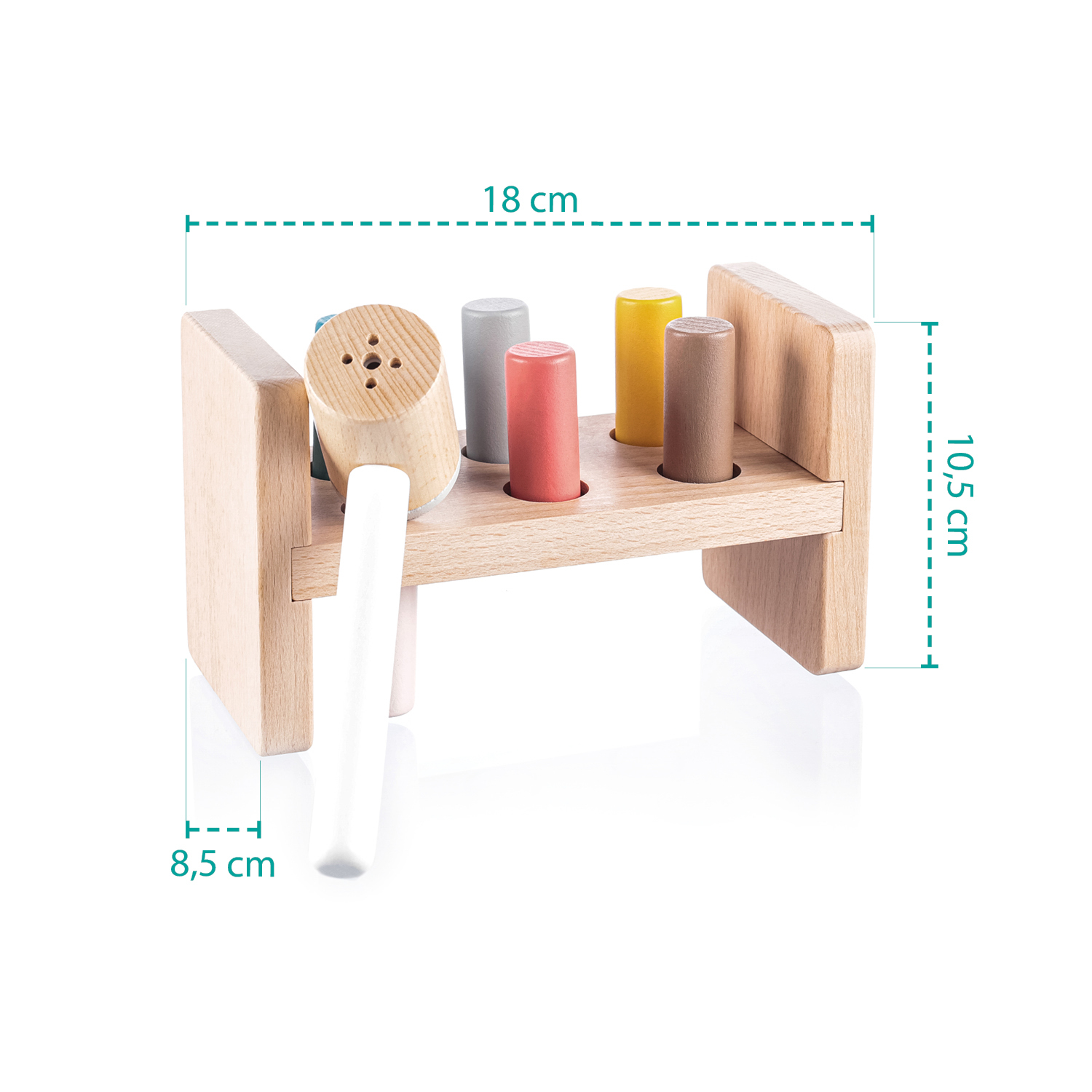 • Obsahuje stôl, 6 kolíkov a kladivo, ktoré vydáva zvuk• Rozvíja koordináciu, motorické zručnosti a rozpoznávanie farieb• Vyrobené z kvalitného dreva a farieb na vodnej báze