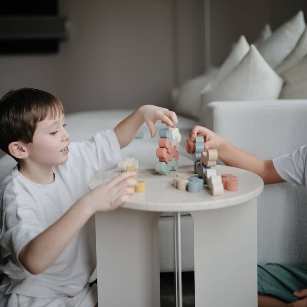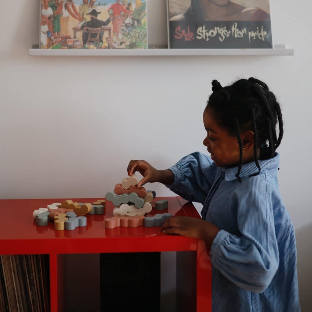 Zoznámte deti so svetom kreativity a koordinácie pomocou drevených balančných kociek Mushie.