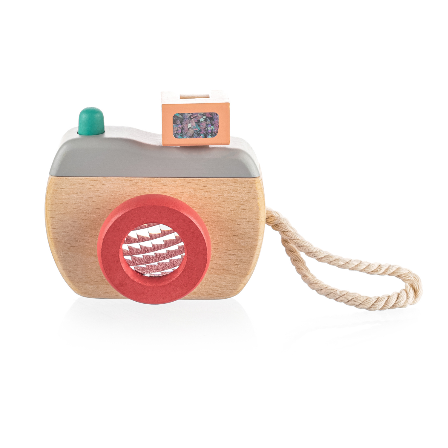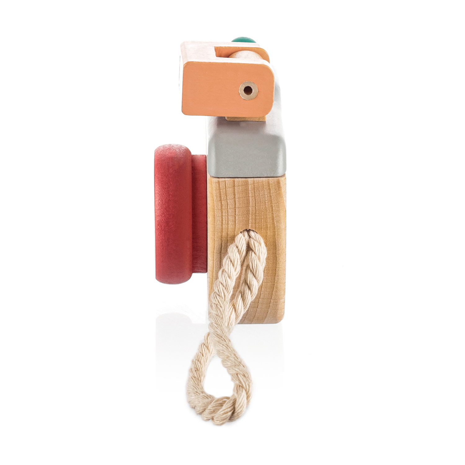 Kvalitný a krásne spracovaný drevený fotoaparát poteší každého malého fotografa. Hračka je ľahká a má kompaktné rozmery, vďaka ktorým sa pohodlne drží v ruke. Na jednoduché prenášanie a manipuláciu je fotoaparát vybavený pevným popruhom.