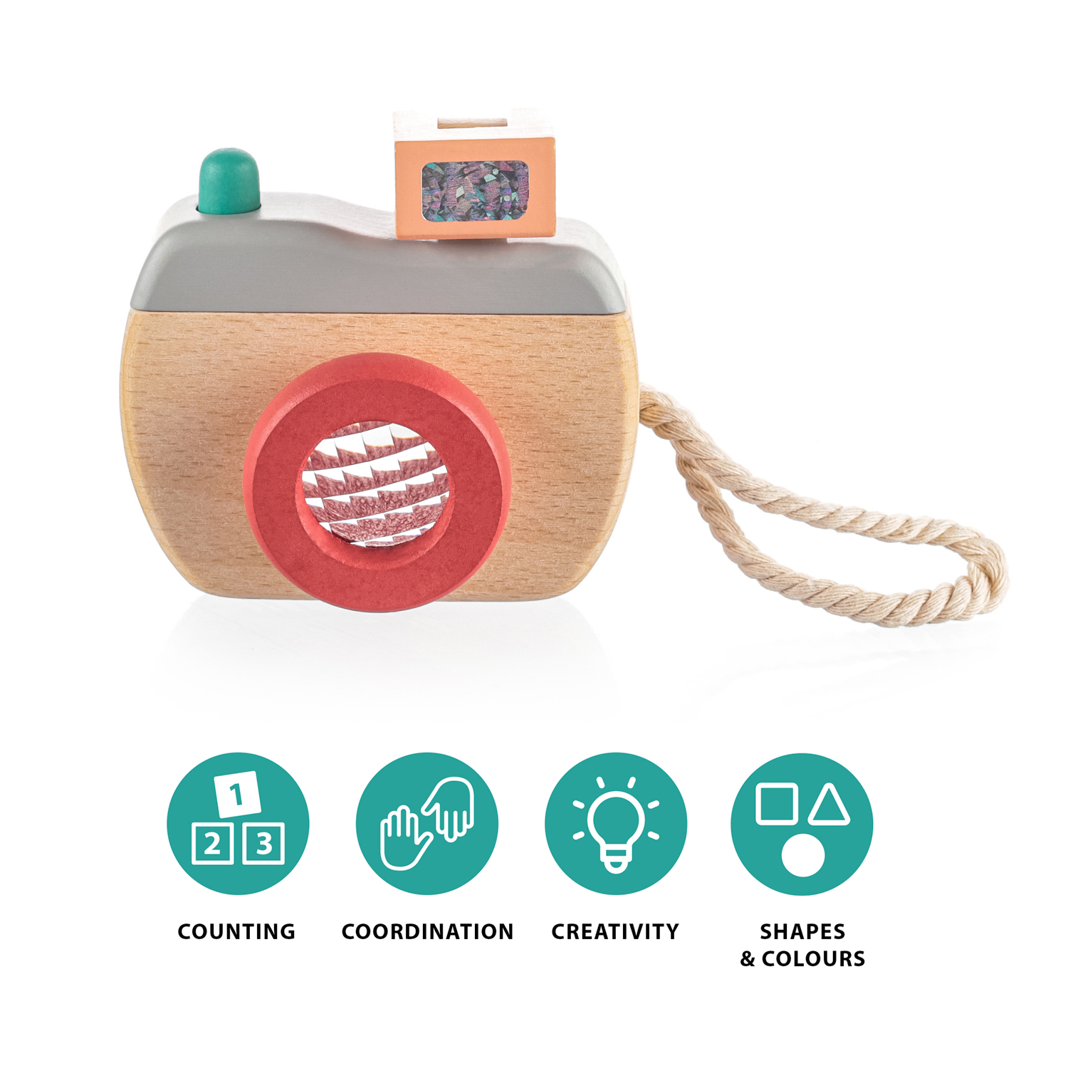 Drevený fotoaparát pre začínajúcich malých fotografov. Vhodné pre deti od 16 mesiacov.