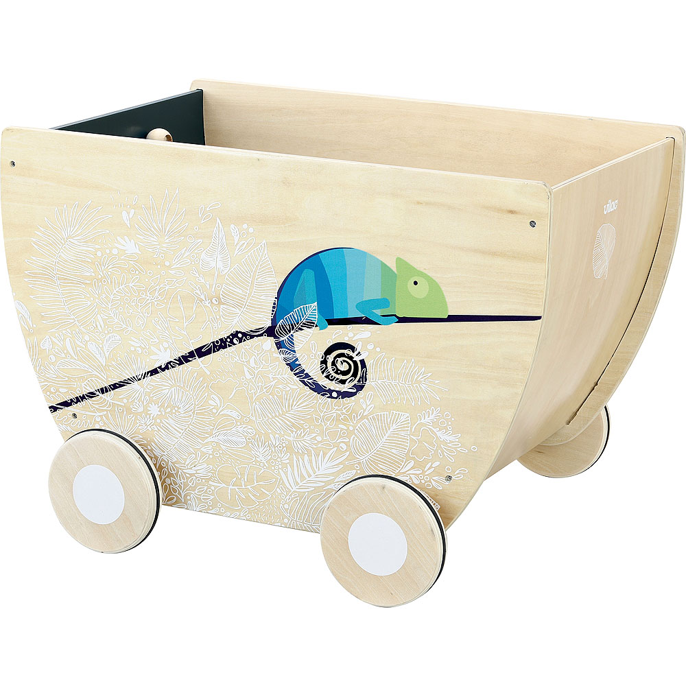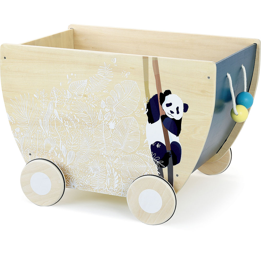 Krásny drevený vozík s pogumovanými kolieskami. Je vyrobený z farebného a prírodného dreva, prírodné časti majú biele zdobenie a farebnú ilustráciu pandy a chameleóna. Je ideálny pre uloženie detských hračiek. Zoberte prosím na vedomie, že tento vozík nebol navrhnutý tak, aby uniesol váhu dieťaťa. Hlavné vlastnosti: pogumované kolieska pre tichý chod na tvrdých podlaháchúložný priestor na hračky