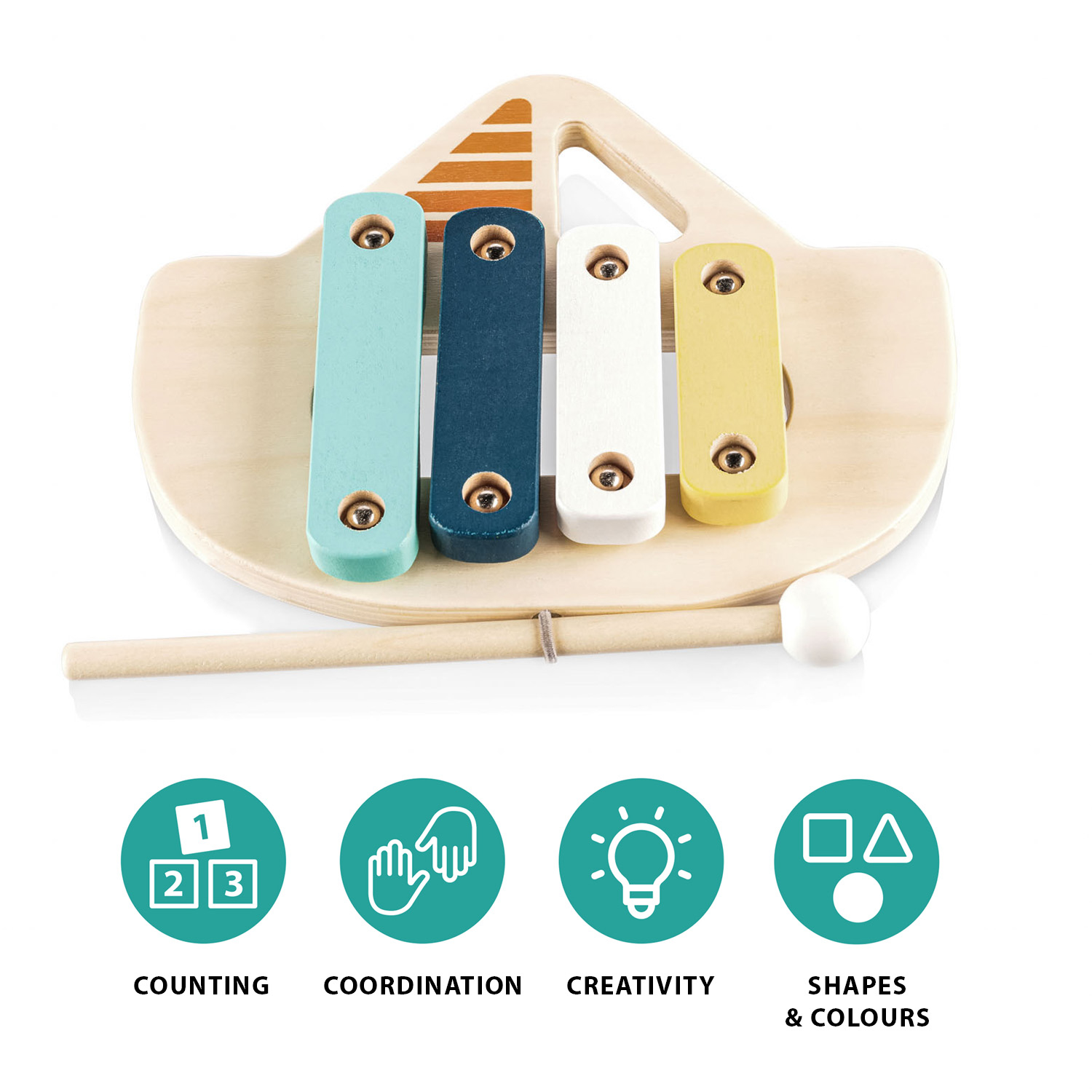 • Tvar lode• 4 tóny• Rukoväť na jednoduché prenášanie• Pevná gumička na pripevnenie paličky• Vyrobené z kvalitného dreva• Rozvíja detskú motoriku, hudobný sluch, zmysel pre rytmus a kreativitu