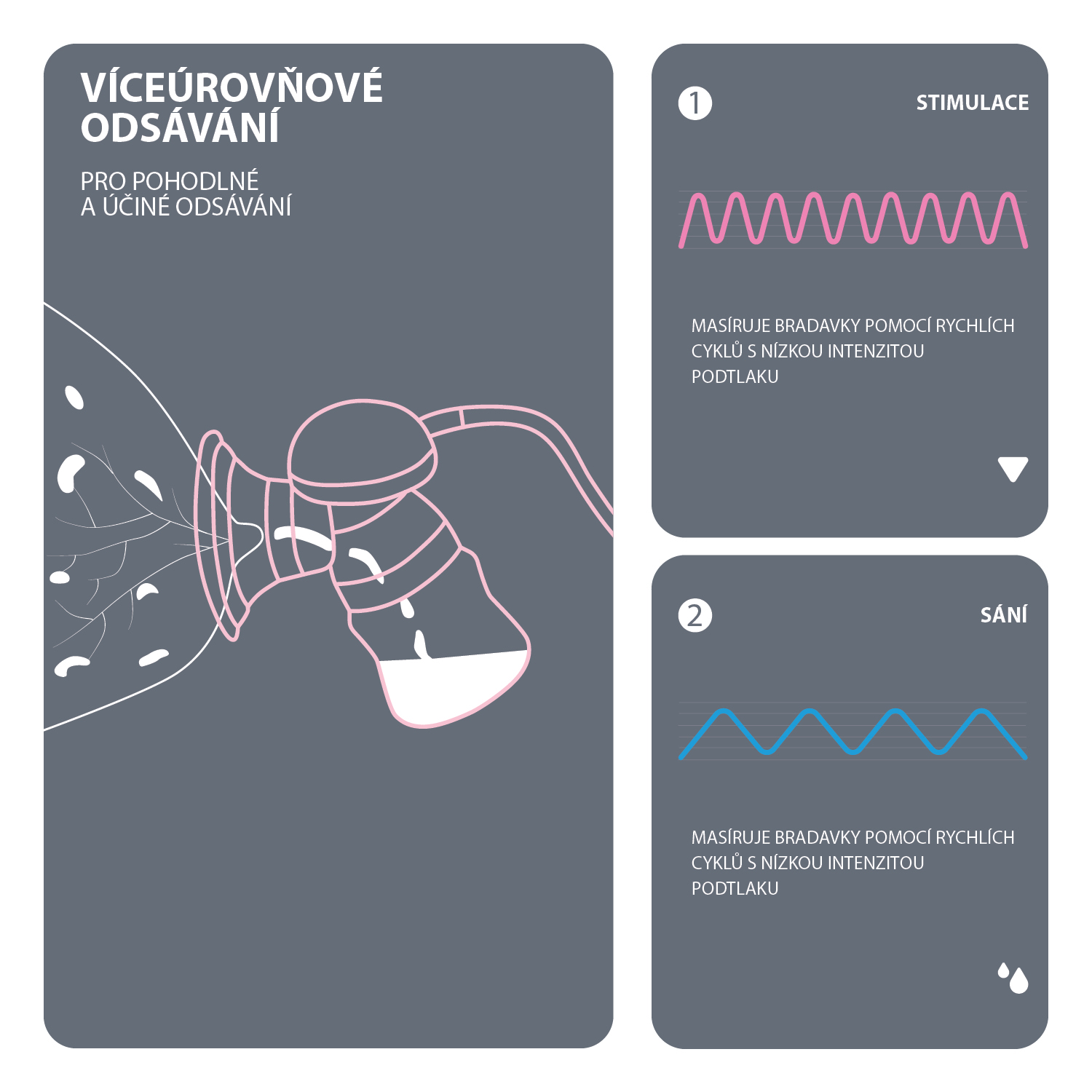 Odsávačka má dva režimy - stimuláciu a sania. Pri každom režime je možné regulovať silu podtlaku, u stimulácia 2 stupne, u odsávania 3 stupne intenzity. Každá mamička si tak môže nastaviť silu, ktorá jej bude vyhovovať. Odsávačka je navrhnutá tak, aby odsávanie bolo bezbolestné a pohodlné. Napájanie motorovej jednotky zaisťuje kábel s micro USB portom. Odsávačku je teda možné napájať s akýmkoľvek zariadením, ktoré má USB port. Konštrukcia a rozmery odsávačky umožňujú optimálne využitie ako doma, tak na cestách. Membránová konštrukcia zabraňuje miešanie vzduchu a mlieka, bráni spätnému toku mlieka a zabraňuje tak jeho kontaminácii. Led diódy signalizujú aktuálne nastavenie odsávačky.Súčasťou balenia je návod, odsávačka, motorová jednotka, napájací kábel, držiak na fľaštičku, fľaštička, cumlík a redukcia na fľaštičku s úzkym hrdlom. Odsávačka je kompatibilný s fľaštičkami AVENT.Zopa 3D technológia odsávaniaUnikátna technológia, ktorá dokonale napodobňuje prirodzené satie dieťaťa. Zaručí maximálnu efektivitu a bezbolestné odsávanie.
