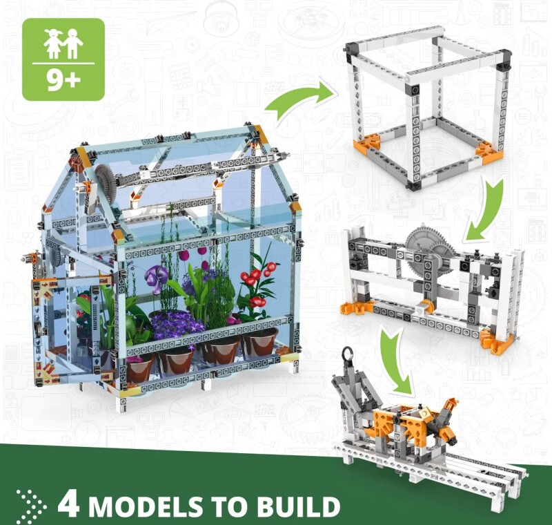 Postavte si tento úžasný, plne funkčný model skleníka a uvidíte, ako sa vaše semená oplodňujú a rastú! Máte záujem stať sa mladým poľnohospodárom? Ovládajte podmienky vo vnútri skleníka a sledujte, ako sú vaše rastliny ovplyvnené teplotou, vlhkosťou a úrovňou svetla. Postarajte sa o svoje rastliny a zabezpečte im správne vetranie prostredníctvom pohyblivých častí skleníka. Získajte informácie o fotosyntéze a životnom cykle fazule.