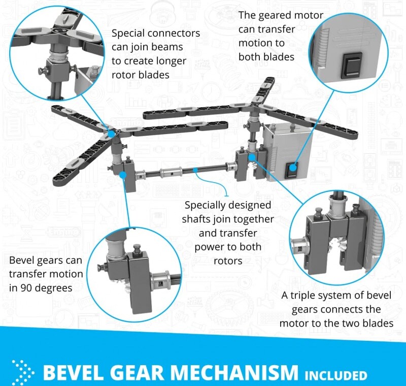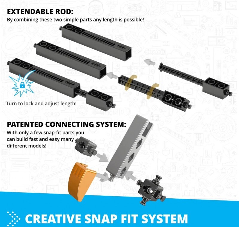Voda a vzduch sú dva najdôležitejšie prvky pre život a oba sú kategorizované ako tekutiny. Pohyb vzduchu určuje teplotu v našich miestnostiach. Potrubia dodávajú vodu do našich domovov. Priemyselné a stavebné stroje využívajú hydrauliku na ľahké zdvíhanie ťažkých predmetov. Lietadlá a lode menia smer pomocou aerodynamiky a hydrodynamiky. Premýšľali ste niekedy nad tým, prečo predmety klesajú vo vode, zatiaľ čo iné plávajú? Ako prúdi krv v našom tele? Ako fungujú vodné nádrže? S touto sadou si môžeš postaviť 6 rôznych modelov, vrátane člna a ponorky, ako aj rôznych experimentálnych súprav, aby si sa naučil všetko o dynamike tekutín! Súčasťou sú tlačené návody na stavbu pre 4 modely a ďalšie 2 modely sú dostupné online a prostredníctvom bezplatnej aplikácie kidCAD pre inteligentné zariadenia. Poznámka: Plastové fľaše a poháre na obrázkoch nie sú súčasťou balenia.