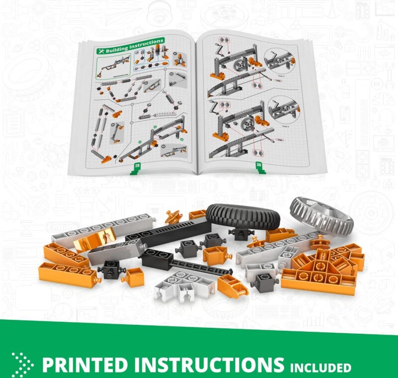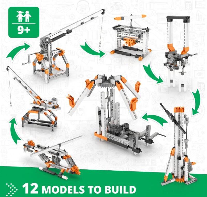 Zistite, ako môžu prevody jednoducho znížiť alebo zvýšiť rýchlosť, zmeniť silu alebo preniesť pohyb z jednej polohy do druhej. Zistite, ako sa závitkové prevodovky používajú na výrazné zníženie rýchlosti otáčania a ako môžu skrutky premeniť rotačný pohyb na lineárny a zároveň výrazne zvýšiť silu. Postav si 12 funkčných modelov ako je experimentálny žeriav, prevodovka, kolotoč, helikoptéra, skrutkový lis a žeriav s otočným ramenom. Jednoduché návody na zostavenie všetkých modelov nájdete buď online, alebo v priloženej brožúre. Brožúra poskytuje podrobné vysvetlenia rôznych použitých vedeckých princípov a zahŕňa inovatívne experimentálne aktivity pre praktické učenie. K dispozícii je aj sekcia Kvíz, v ktorej môžete otestovať svoje novonadobudnuté vedomosti!