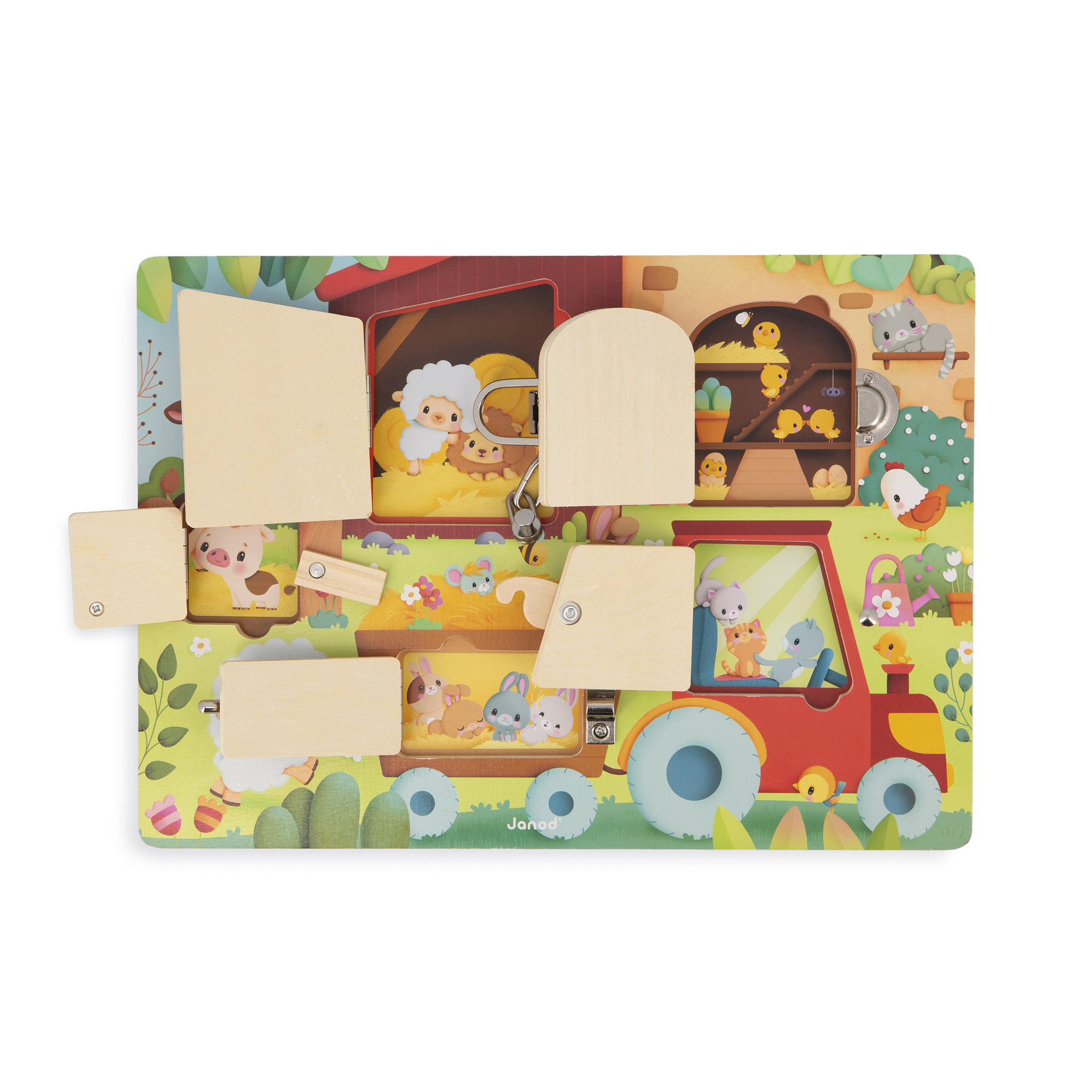 Klop, klop, klop! Kto sa skrýva za dverami stodoly? Táto pekná zámková tabuľa ilustruje každodenný život hospodárskych zvierat a ich mláďat. Má 5 dvierok s rôznymi systémami otvárania: drevený hák, drevená západka, retiazkový zámok, prepínacia západka a gombíkový zámok. Každé dvierka majú iné číslo a prekvapenie! Číslo sa rovná počtu mláďat zvierat ukrytých za dvierkami. Ideálne na strávenie zábavy a zábavného času na farme! Rozvíja obratnosť a zároveň sa učí o číslach a zvieratách. Drevená hračka FSCTM. Pre deti od 3 rokov.
