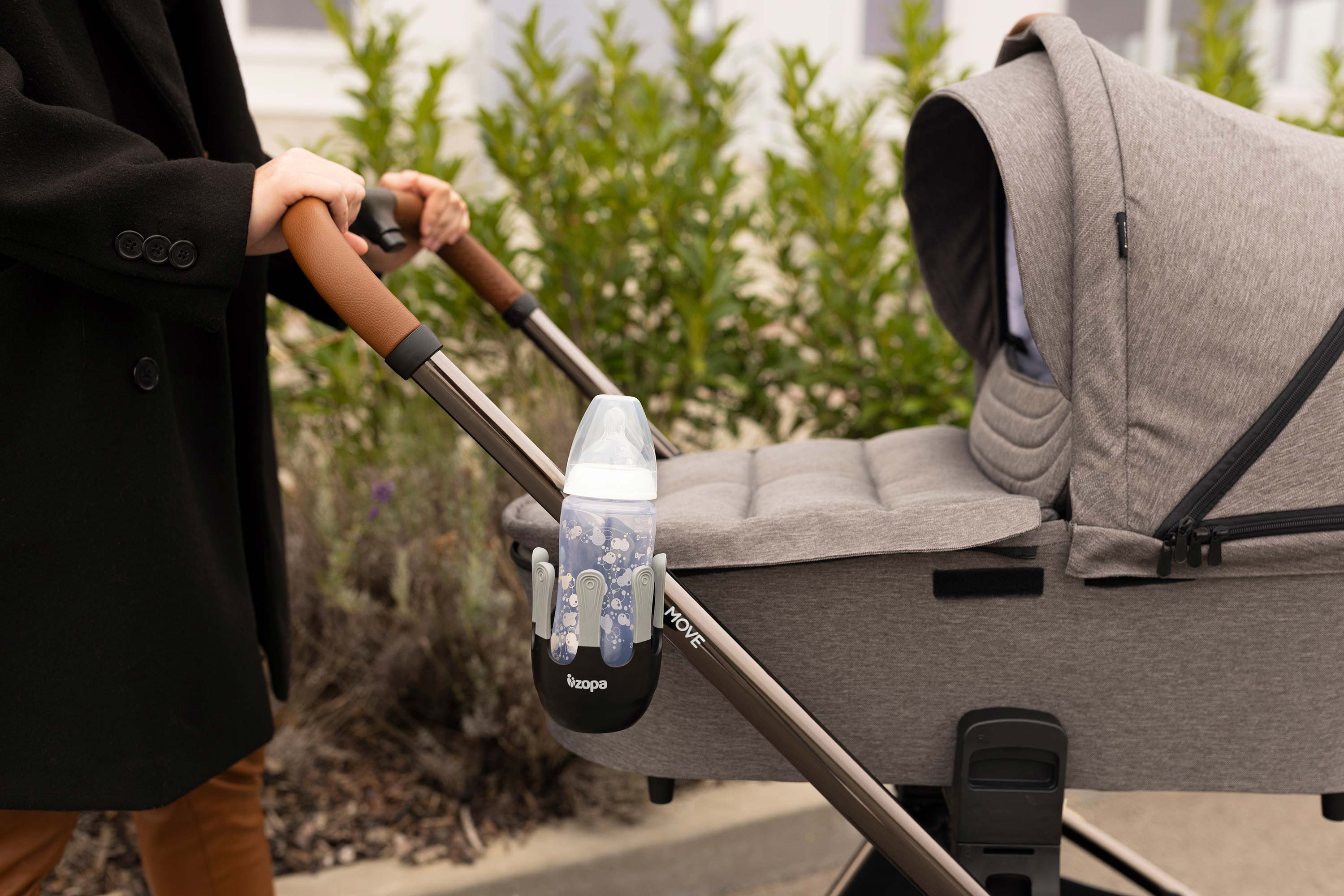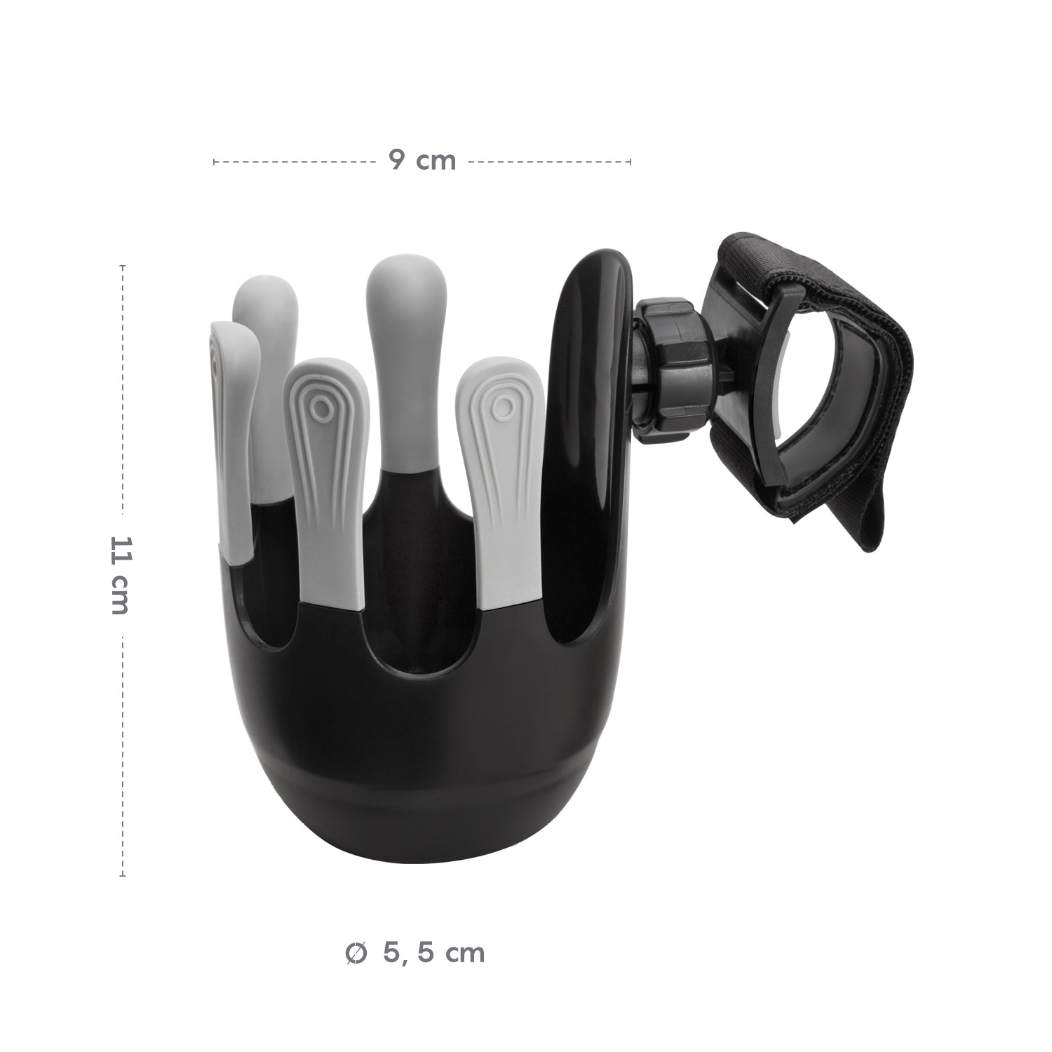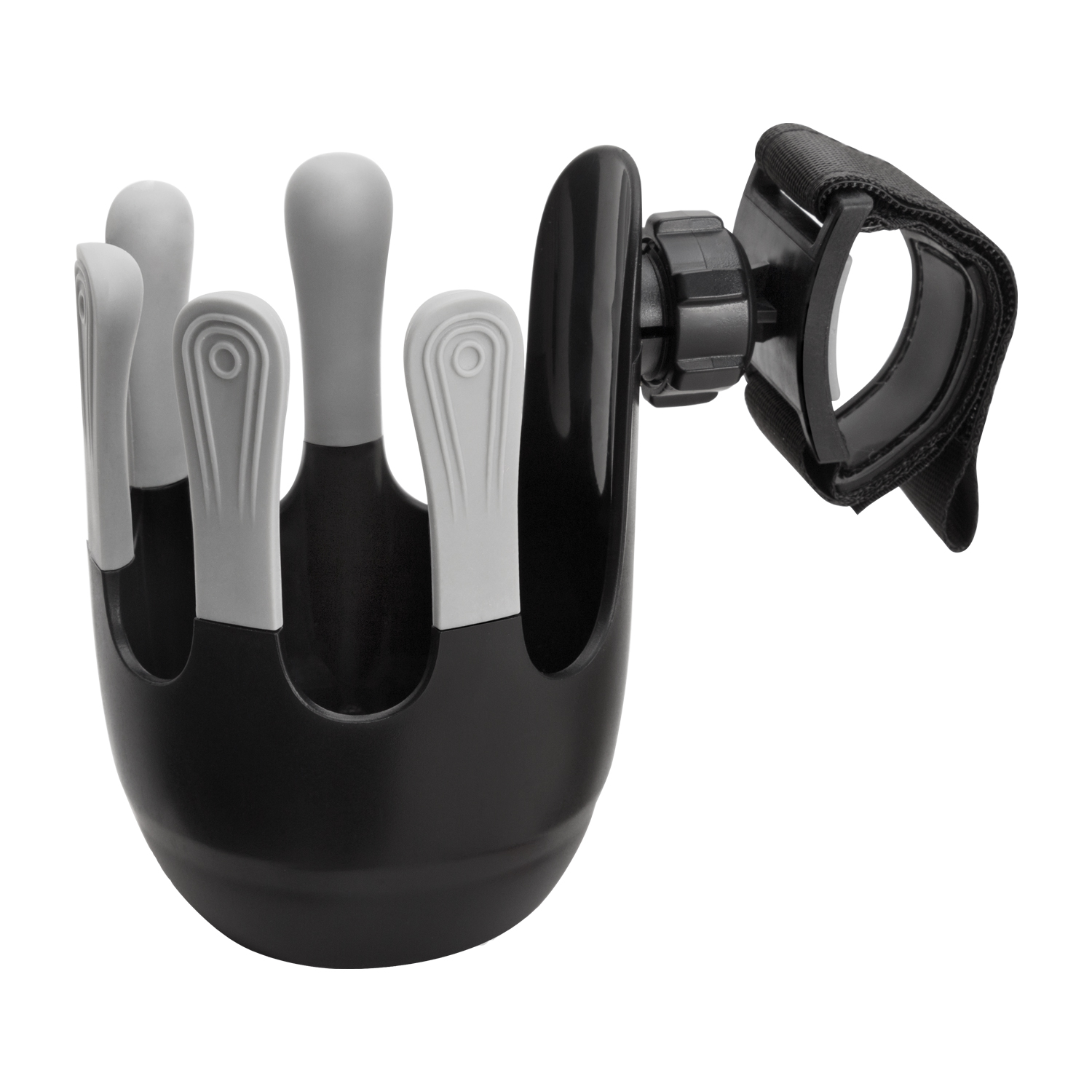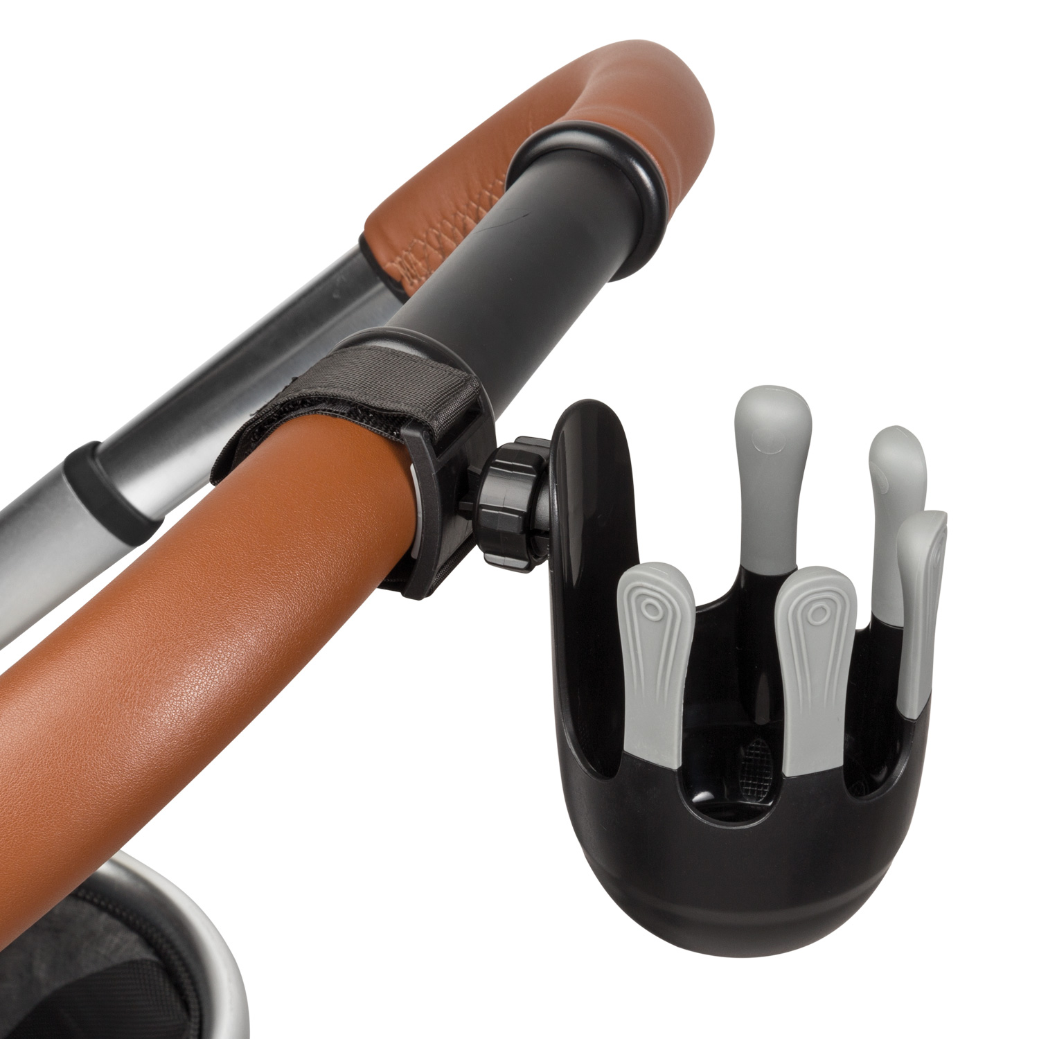 Flexibilný držiak na nápoje je navrhnutý tak, aby sa doň zmestili detské fľaše, šálky na kávu a väčšie fľaše na vodu s priemerom do 8,5 cm. 360° otočný systém možno vďaka jednoduchej inštalácii na suchý zips pripevniť na rukoväť takmer každého kočíka. Jedinečný, moderne vyzerajúci systém piatich prstov zaisťuje lepšiu stabilitu pohára alebo fľaše a zabraňuje náhodnému vyliatiu.