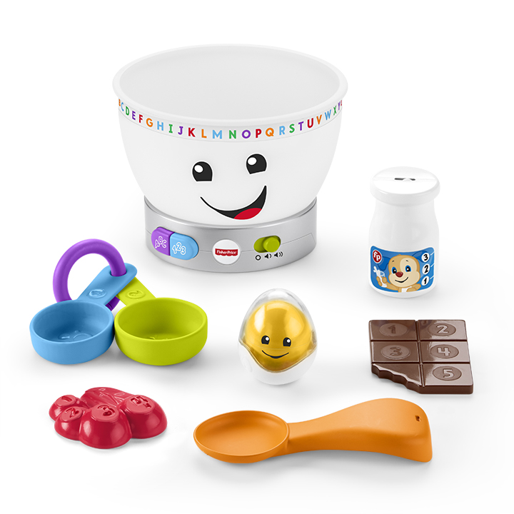 Pripravte sa na zábavné a náučné chvíľky s touto pohybom aktivovanou, "magickou" Fisher-Price® Spievajúci miskou! Tým, že budú vaši malí drobčekovia pridávať a odoberať z misky ingrediencie, budú sa rozsvecovať farebné svetielka a prehrávať veselá hudba a zvuky. Miska má rozžiarenú tváričku a tiež dve farebné tlačidlá! Tlačidlá učia abecedu, farby, čísla a oveľa viac pomocou pesničiek, fráz a zvukov. Miska obsahuje 7 ingrediencií: rachotiace vajíčko, maslo z mäkkého materiálu, mlieko, ktoré je možné realisticky nalievať, klopkajúce odmerky, hryzátko v tvare čokolády, čerešničky z rôznych materiálov a lyžičku na miešanie. Pridávanie a odoberanie ingrediencií odmeňuje dieťatko zábavnými farebnými efektmi, rozžiarenou tváričkou a pesničkami.