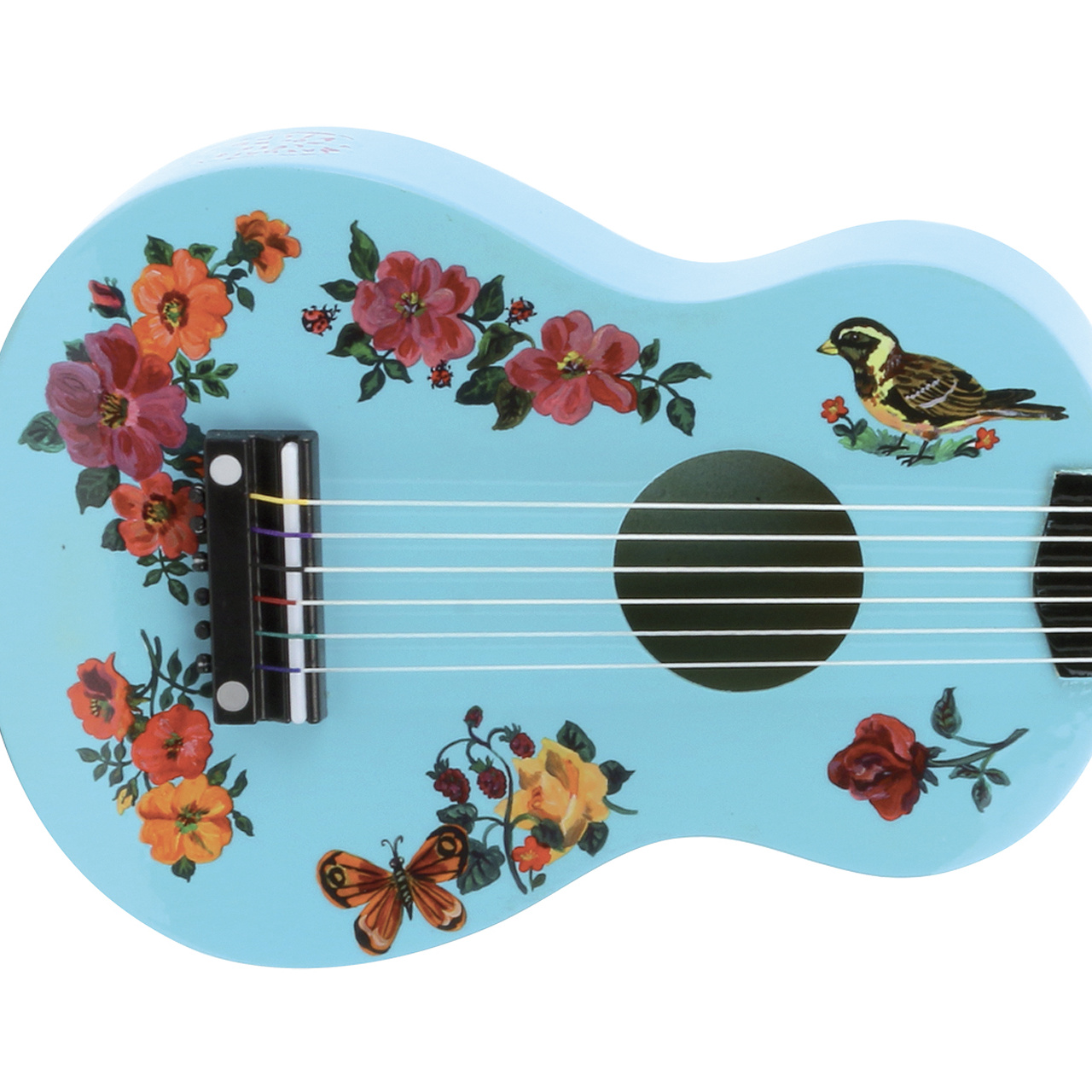 Klasická drevená akustická gitara so šiestimi strunami, v tyrkysovej farbe a s ilustráciami Nathalie Lété. Gitara má natiahnuté nylonové struny, ktoré je možné pomocou kolíkov ladiť. Dodávané s trsátkom a jednou náhradnou strunou. Túto hračku nemožno pokladať za hudobný nástroj. Hlavné vlastnosti: gitara, trsátko a náhradná strunadizajn Nathalie Leté Nathalie Lété je francúzska návrhárka žijúca a pôsobiaca v Paríži. Za hlavné zdroje svojej inšpirácie označuje ľudové aj populárne umenie krajín pôvodu svojich rodičov, Číny a Nemecka. Zaujímajú ju však tiež staré rytiny kvetín a zvierat či historické hračky z celého sveta. Jej práce vynikajú farbami a poetikou, sú označované za naivné, s presahom k art brut. Využíva a mieša rôzne techniky aj médiá, čo sa odráža na rozsahu spoluprác s mnohými rôznymi výrobcami. Jej podpis dnes nesú knihy, odevy, úžitková aj dekoračná keramika, bytové doplnky a samozrejme hračky.