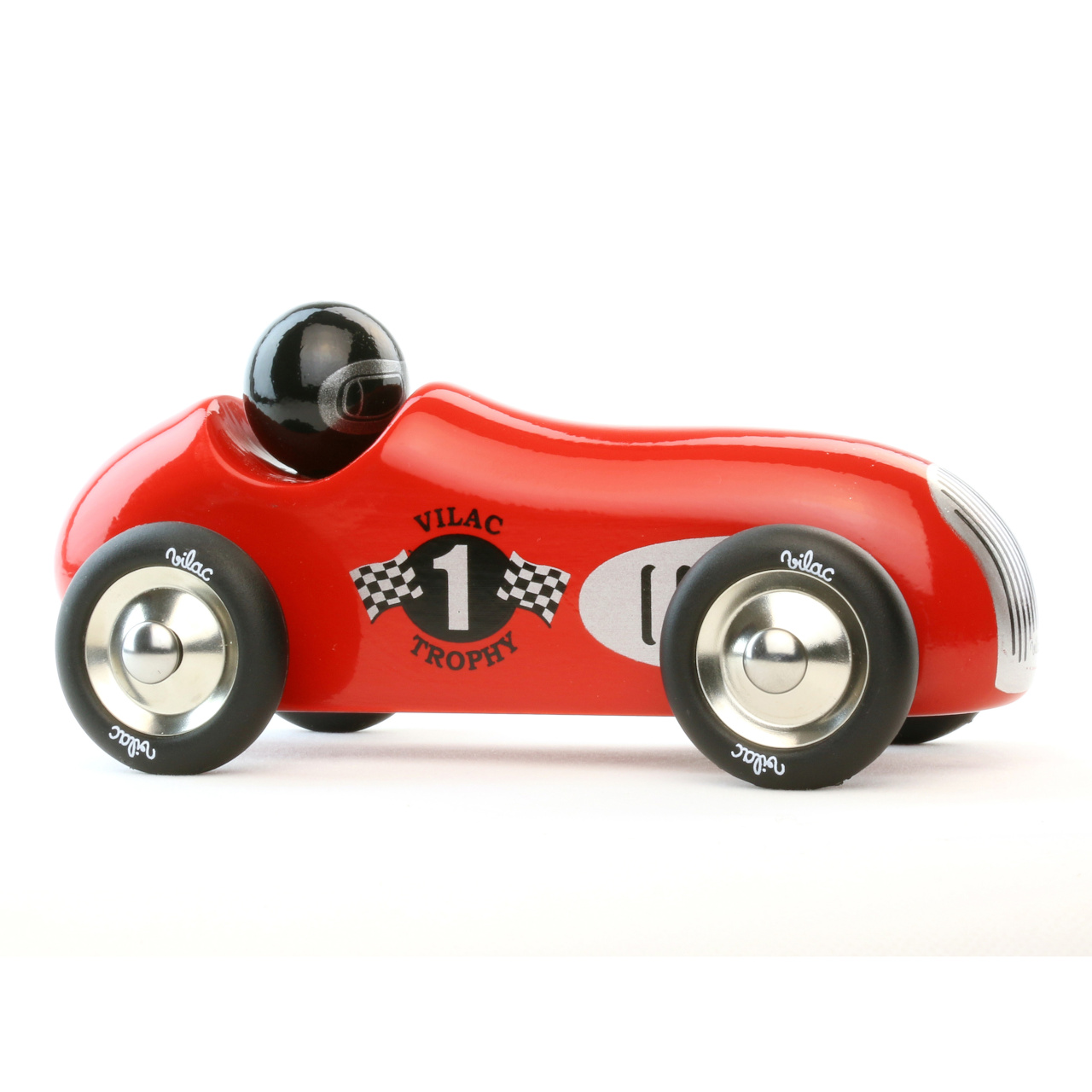 Červené vintage závodné auto vyrobené z lakovaného dreva s kovovými pogumovanými kolesami. Je vhodné ako na hranie tak ako dekorácia do izieb detí či dospelých. Vyrobené vo Francúzsku. Hlavné vlastnosti: vyrobené vo Francúzskuvhodné aj ako dekorácia