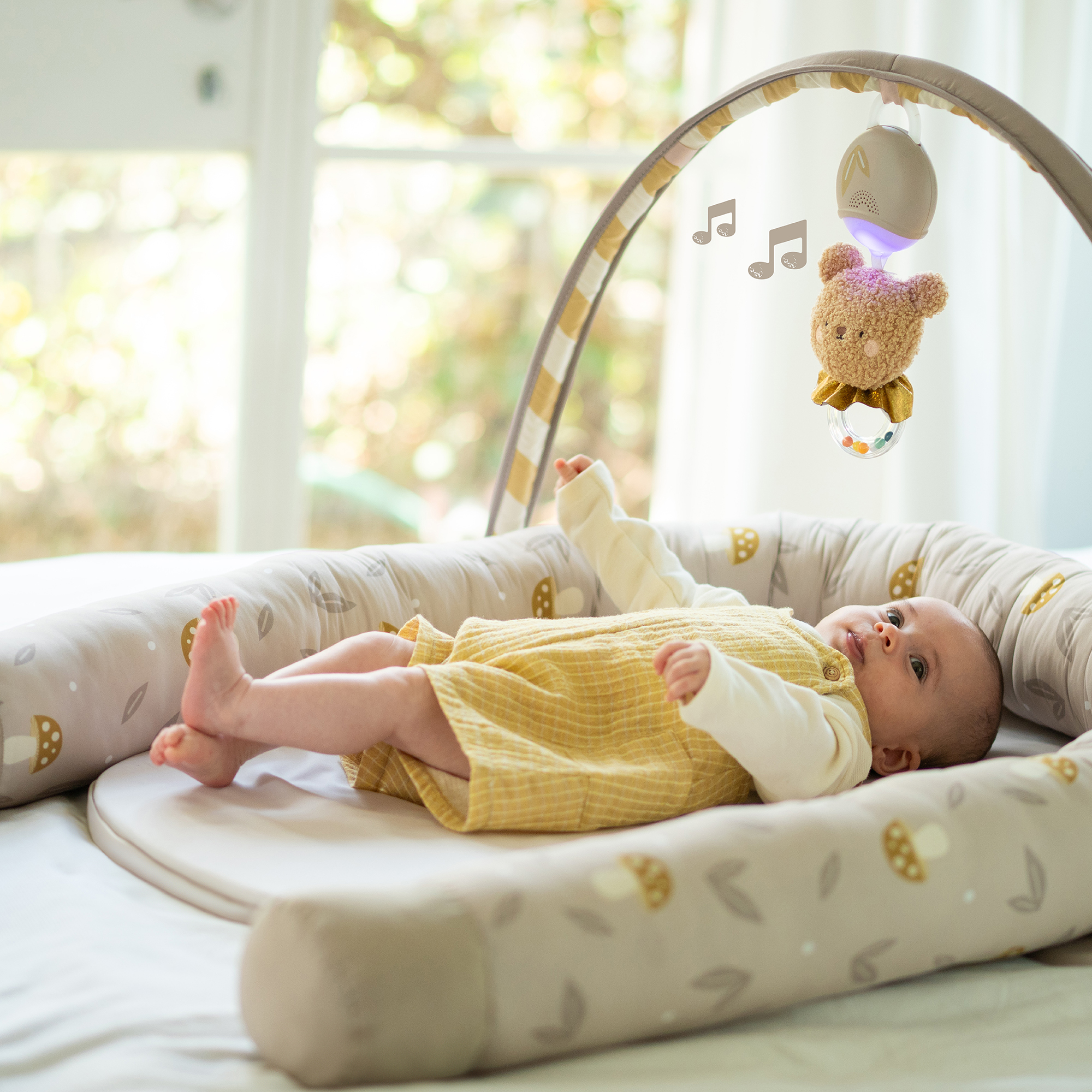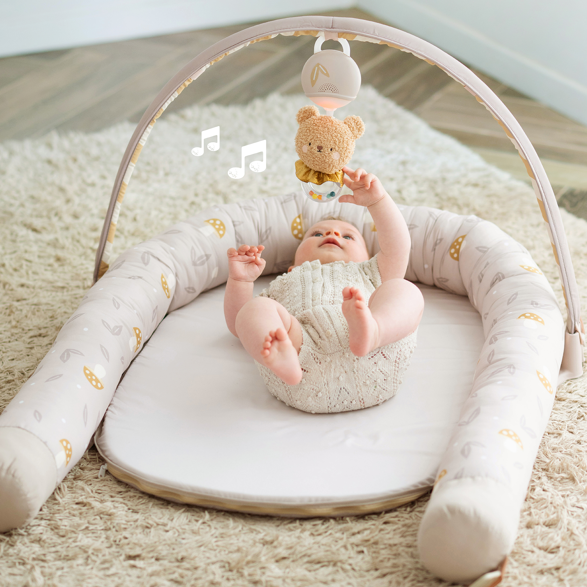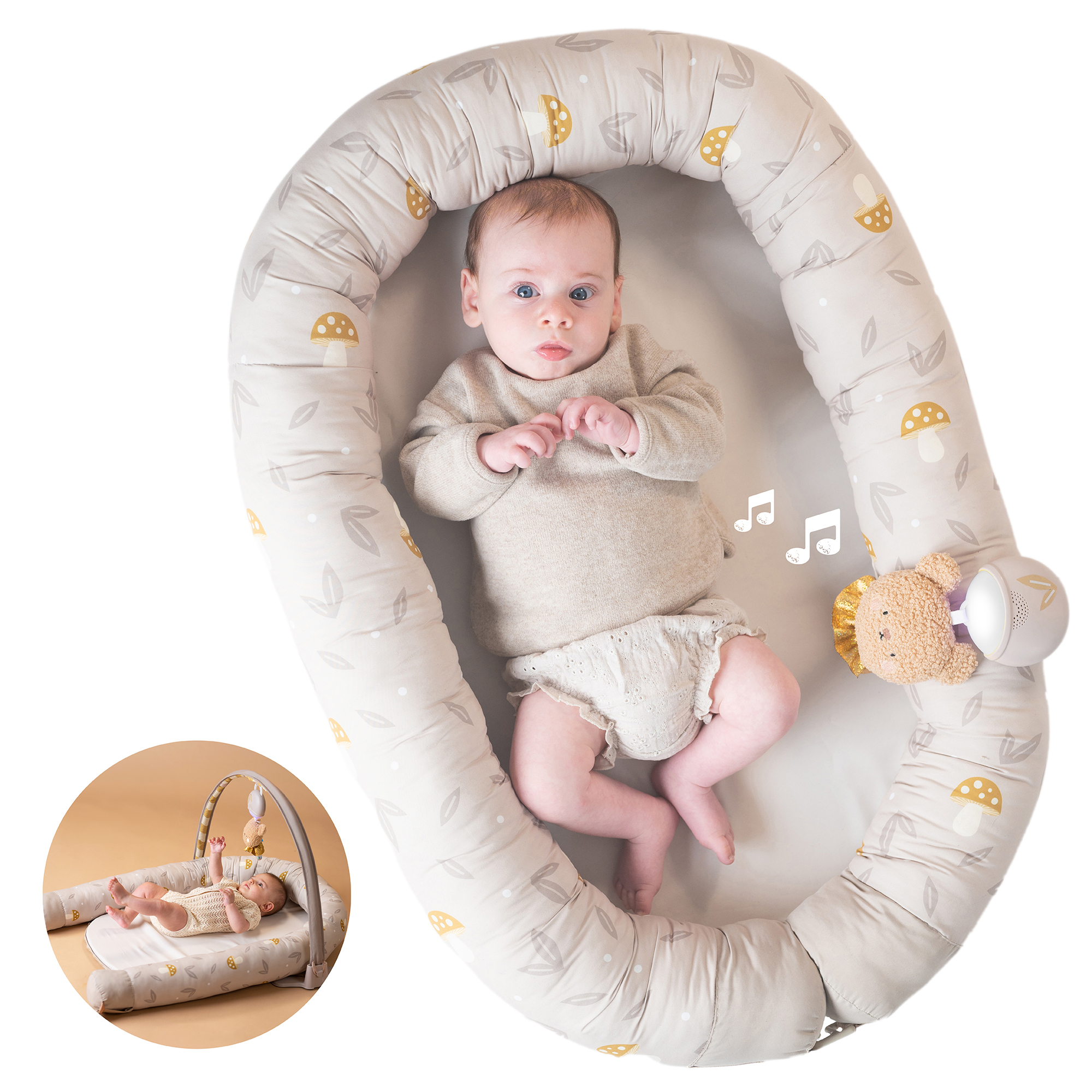 Hniezdo pre bábätko Taf Toys je praktický doplnok, ktorý rastie spolu s dieťaťom. V prvých týždňoch slúži ako mäkké, bezpečne obopínajúce hniezdo, v ktorom sa novorodenec lepšie upokojí a odpočíva. Od troch mesiacov veku dieťaťa je možné hniezdo rozložiť a využiť ako pohodlný priestor na hranie. Súčasťou odnímateľnej hrazdy je plyšový medvedík so svetielkami a 22 minútami upokojujúcich melódií, ktoré pomáhajú bábätko zabaviť aj upokojiť. Hudobný medvedík je použiteľný aj samostatne.