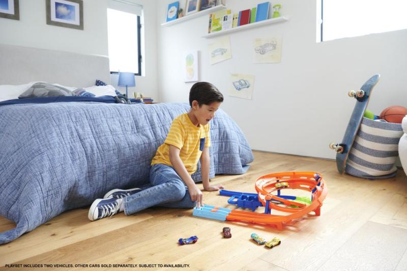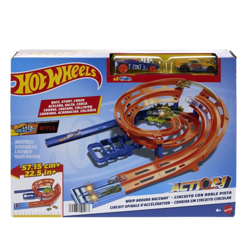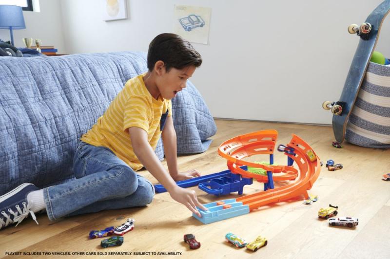 Pretekajte s dvoma autíčkami Hot Wheels® na tratiach vedľa seba, prekonávajte skok cez priepasť a vy...zobraziť viac