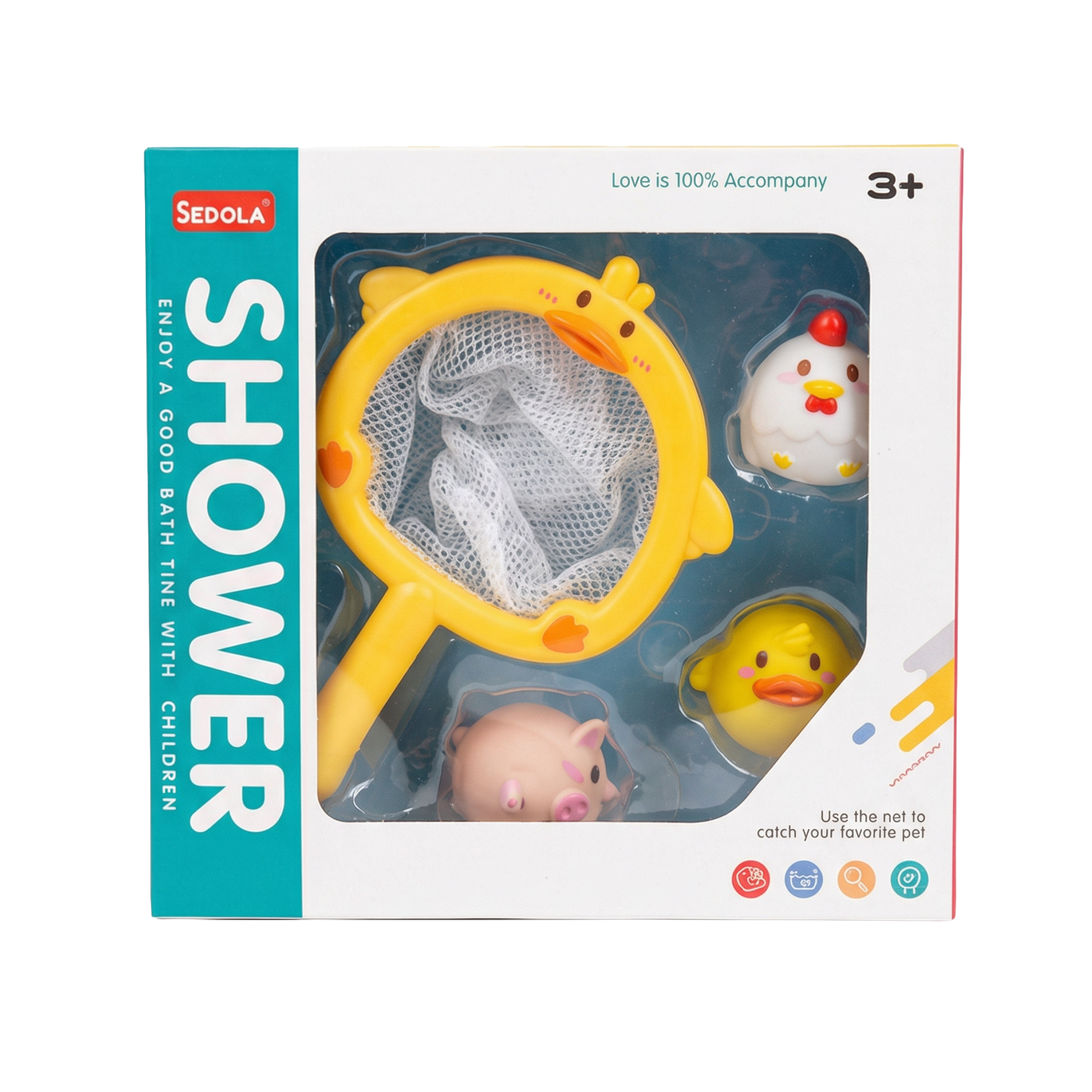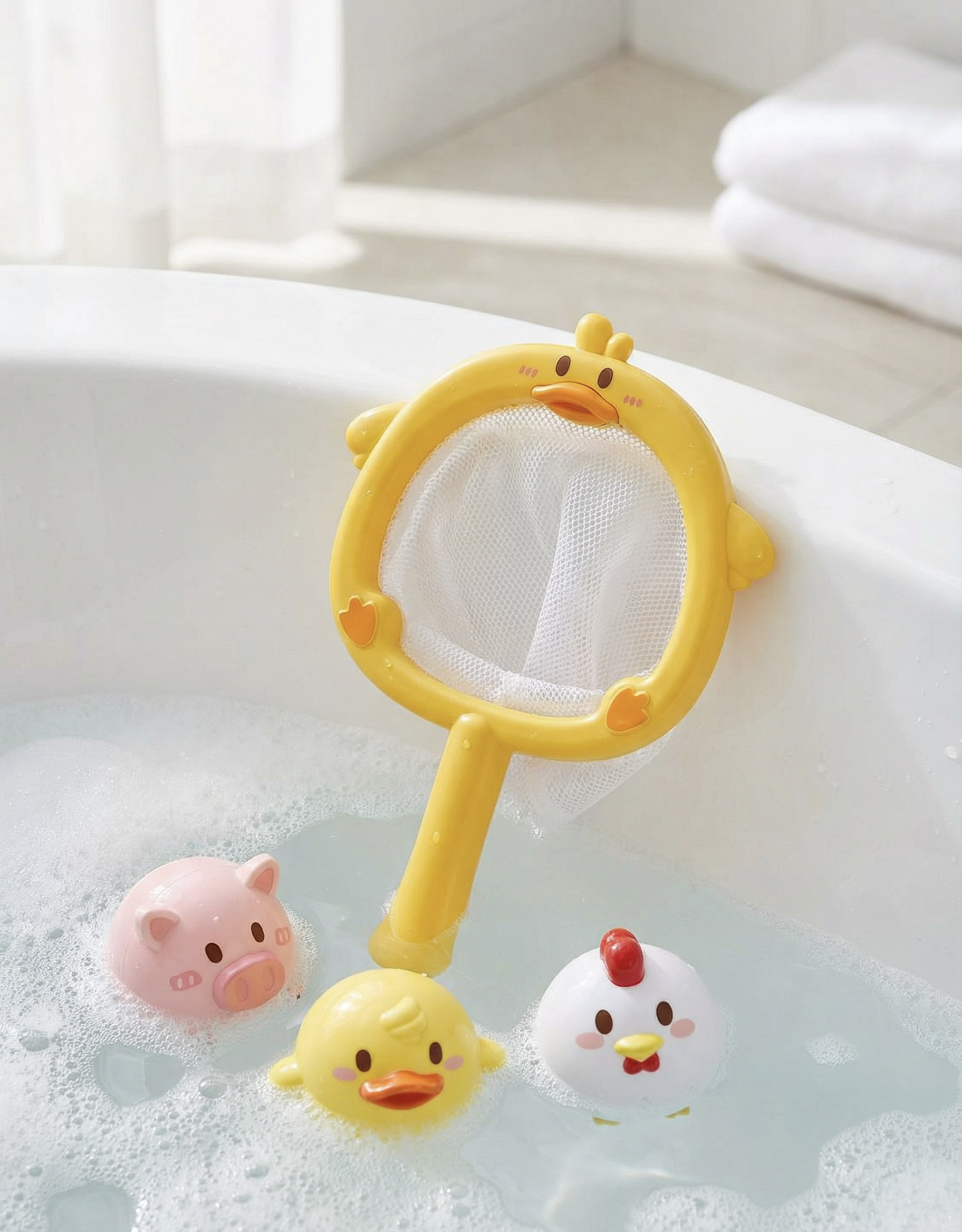 Hračky na potápanie a podberák Farma premenia každé kúpanie na veselú hru so zvieratkami z farmy. V sete nájdete farebný plastový podberák v tvare kačičky a tri plávajúce hračky – kuriatko, kačičku a prasiatko – ideálne na chytanie, potápanie a vymýšľanie vlastných príbehov vo vani alebo bazéne.