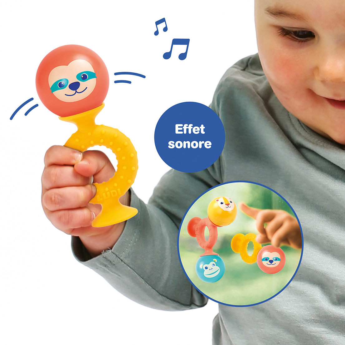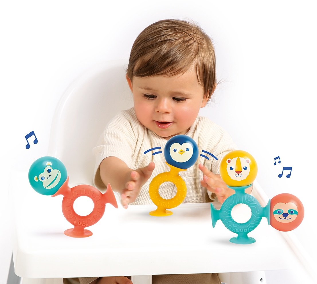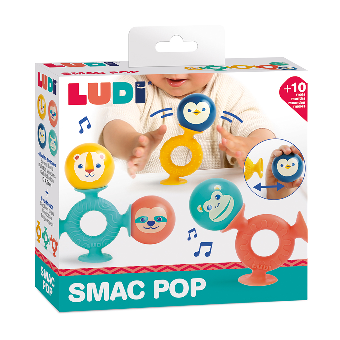 Sada hrkálok s prísavkami Smack Pop je originálna hračka pre deti od 10 mesiacov, ktorá kombinuje farebné chrastiace guličky a silikónové krúžky s prísavkami. Dieťa môže jednotlivé diely spájať a vytvárať vlastné kombinácie – na jedálenskom pulte, na stole aj vo vani. Prísavky držia pevne na hladkých povrchoch, takže hračka zostáva na mieste a dieťa sa môže sústrediť na objavovanie. Pri zatrasení guličky s motívmi zvieratiek vydávajú zábavné zvuky, ktoré podporujú zmyslové vnímanie a udržujú pozornosť. Hračka pomáha rozvíjať jemnú motoriku aj tvorivosť dieťaťa.