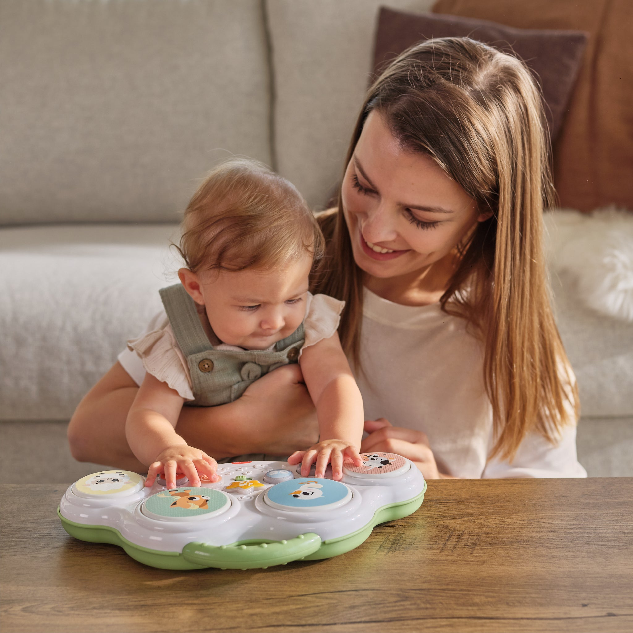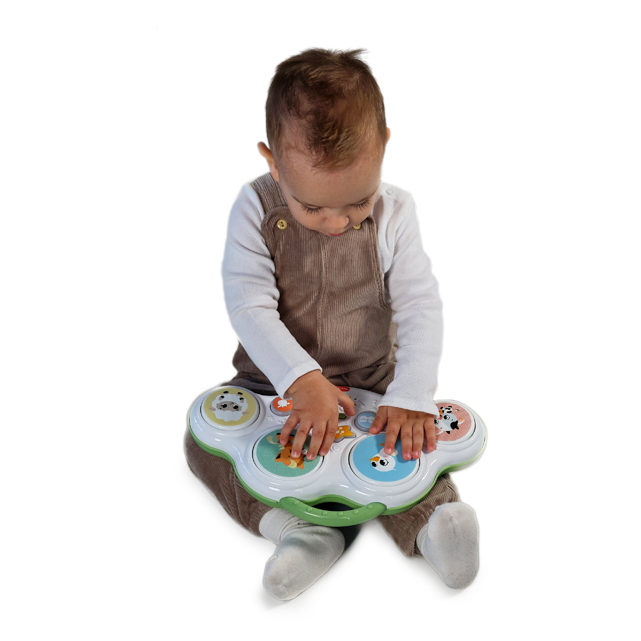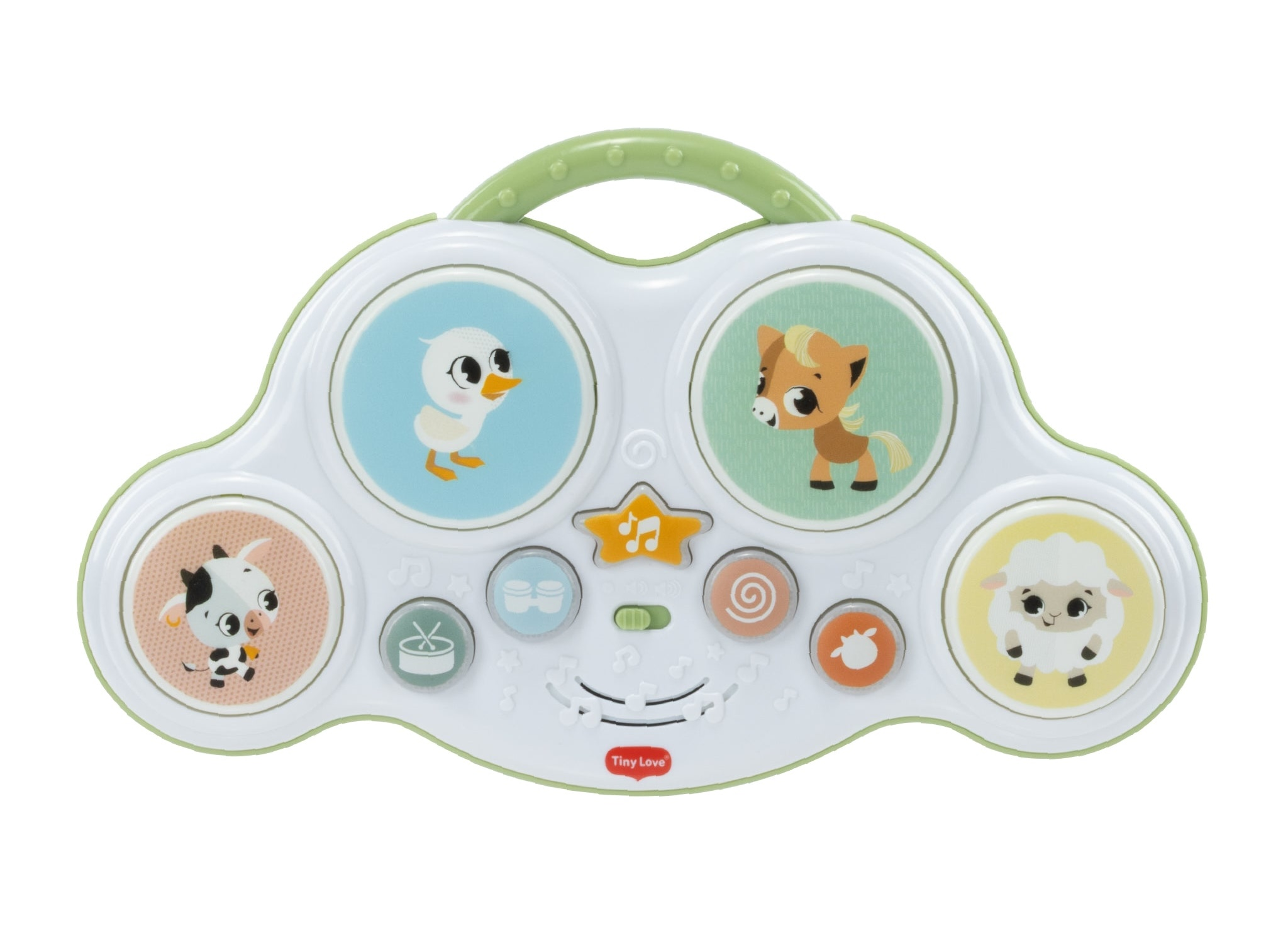 Hudobný pult s bubienkami Tiny Love Farmers Funday deťmi zábavnou formou motivuje k objavovaniu zvukov, rytmu aj zvieratiek. Štyri bubienkové plochy a svetelné tlačidlá spúšťajú bubnové rytmy, vtipné zvuky i farmárske zvieracie efekty, takže hra dieťa dlho udrží v pozornosti. Skvele sa hodí aj na hru na brušku – pomáha predlžovať dobu hrania na brušku, čo podporuje posilňovanie a prípravu na ďalšie motorické míľniky. Zároveň je to ideálna hračka pre spoločné chvíle rodičov s dieťaťom – môžete spolu napodobňovať zvuky, skúšať rytmy a pomenovávať zvieratká.