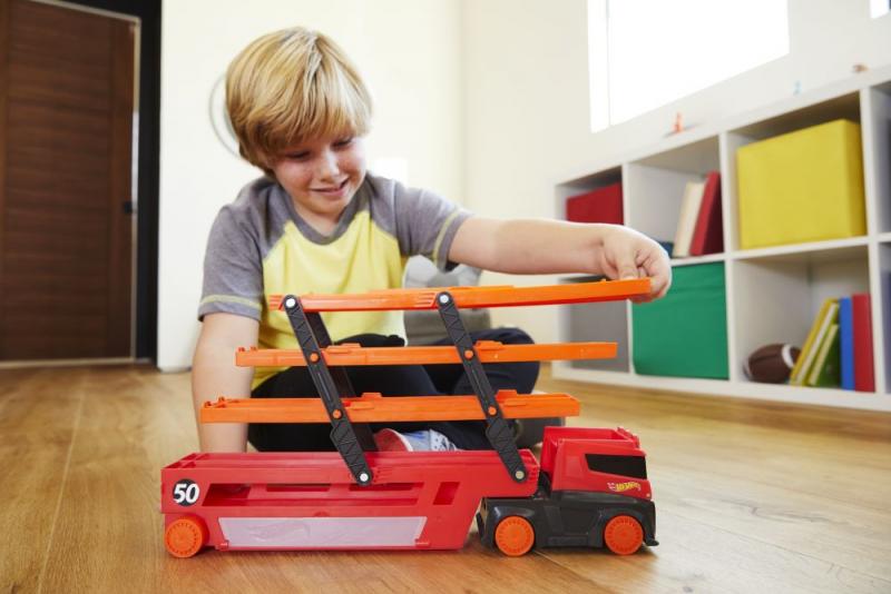 Hot Wheels® Mega Hauler je veľká súprava pre veľké dobrodružstvá. Na tento masívny nákladiak môžeš naložiť až 50 áut v šiestich rozšíriteľných úrovniach - a to je len začiatok! V zadnej časti ťahača je nájazdová rampa, ktorá sa dá pripojiť k setom Hot Wheels ™ City. Môžeš taktiež otvoriť kabínu a zaparkovať do nej ďalšie dve autá alebo otvor rovno celý priehľadný bočný panel. Deti si tak svojich miláčikov môžu uložiť na ich špeciálne miesta. Pripoj Mega Hauler k oranžodráhe Hot Wheels® a vyjdi s autami priamo na trať! Uži si veľa zábavy a rozprávanie napínavých príbehov!