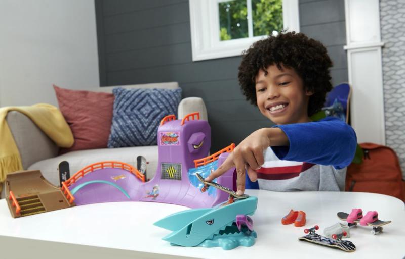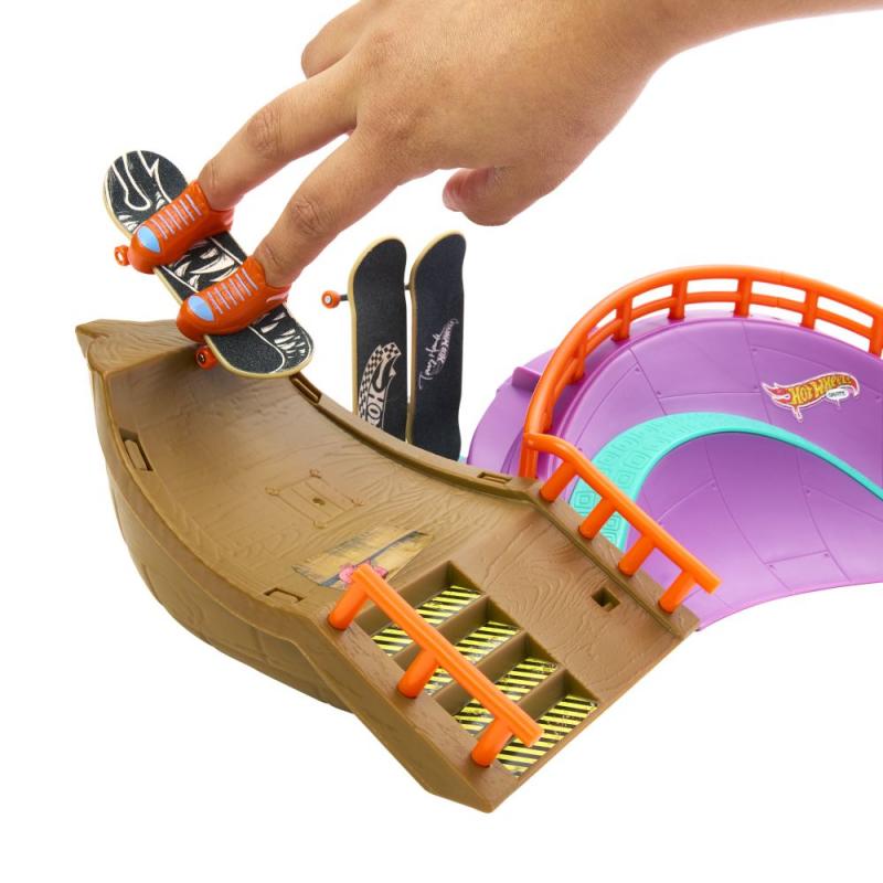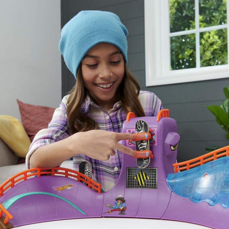 Rozbehnite to štýlovo na skate sade Hot Wheels Skate™ Octopark. Zoskočte z obrie hlavy chobotnice a pustite sa do epickej jazdy na fingerboarde, ktorá obsahuje grind raily, vertikálne quarterpipes a prekvapenie v podobe žraločieho chrbta. Súčasťou balenia je jeden exkluzívny, kompletne zostavený fingerboard a pár odnímateľných skate topánok. Do úložného priestoru na zadnej strane sa zmestia ďalšie tri dosky a päť párov topánok (ďalšie dosky a topánky sa predávajú samostatne.) Farby a prevedenia sa môžu líšiť. Obsahuje 1 sadu Hot Wheels Skate Octopark Skate Set s 1 exkluzívnym fingerboardom a 1 párom skate topánok.