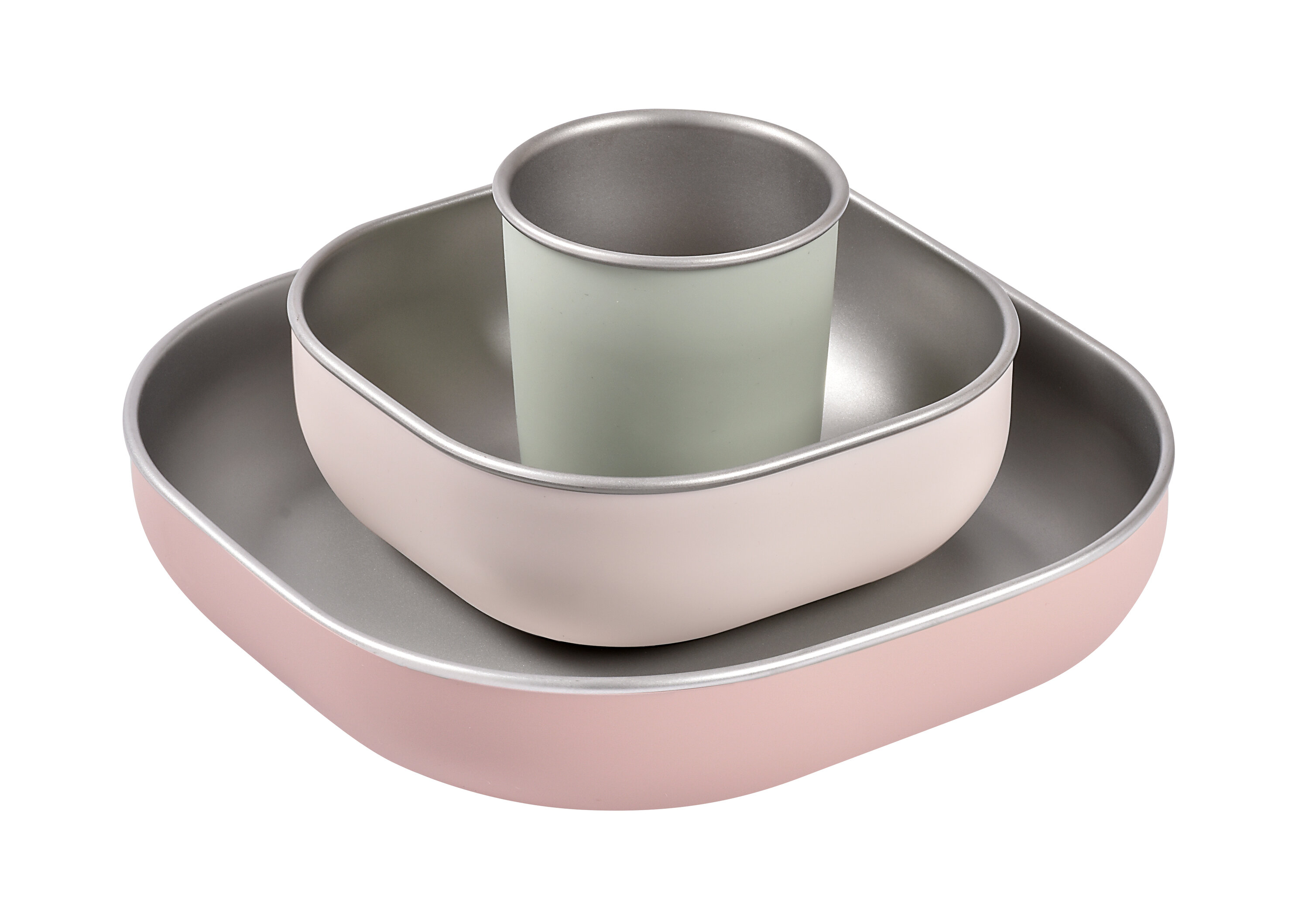 Jídelní sadu inovativního nerezového nádobí se silikonovou povrchovou vrstvou tvoří talíř, miska a kelímek. Ergonomický tvar s vysokými stranami a zaoblenými rohy jsou ideální pro učení dětí samostatnému stolování. Silikonový povrch nádobí pomáhá, aby nádobí neklouzalo na stole ani v ruce.