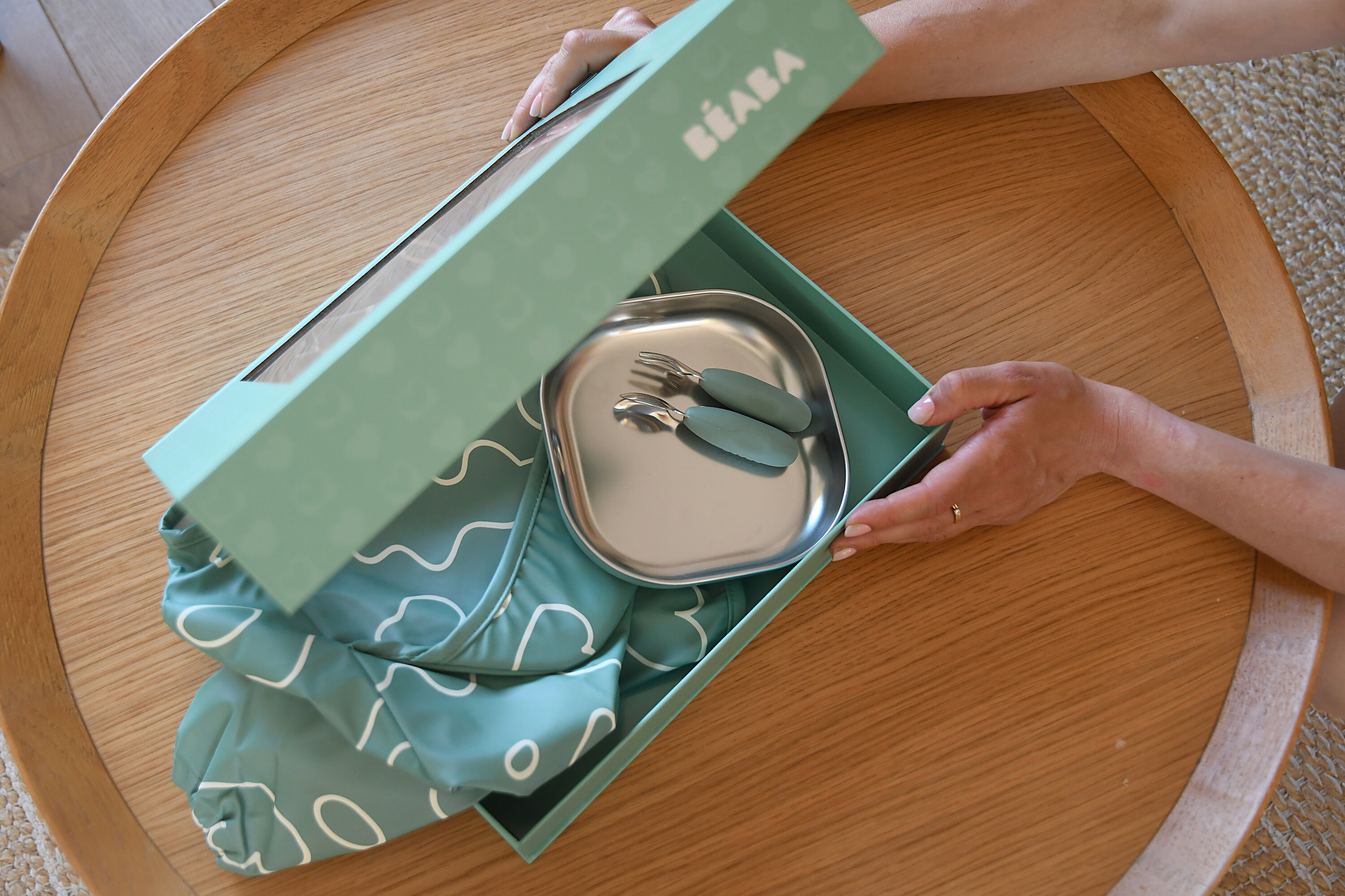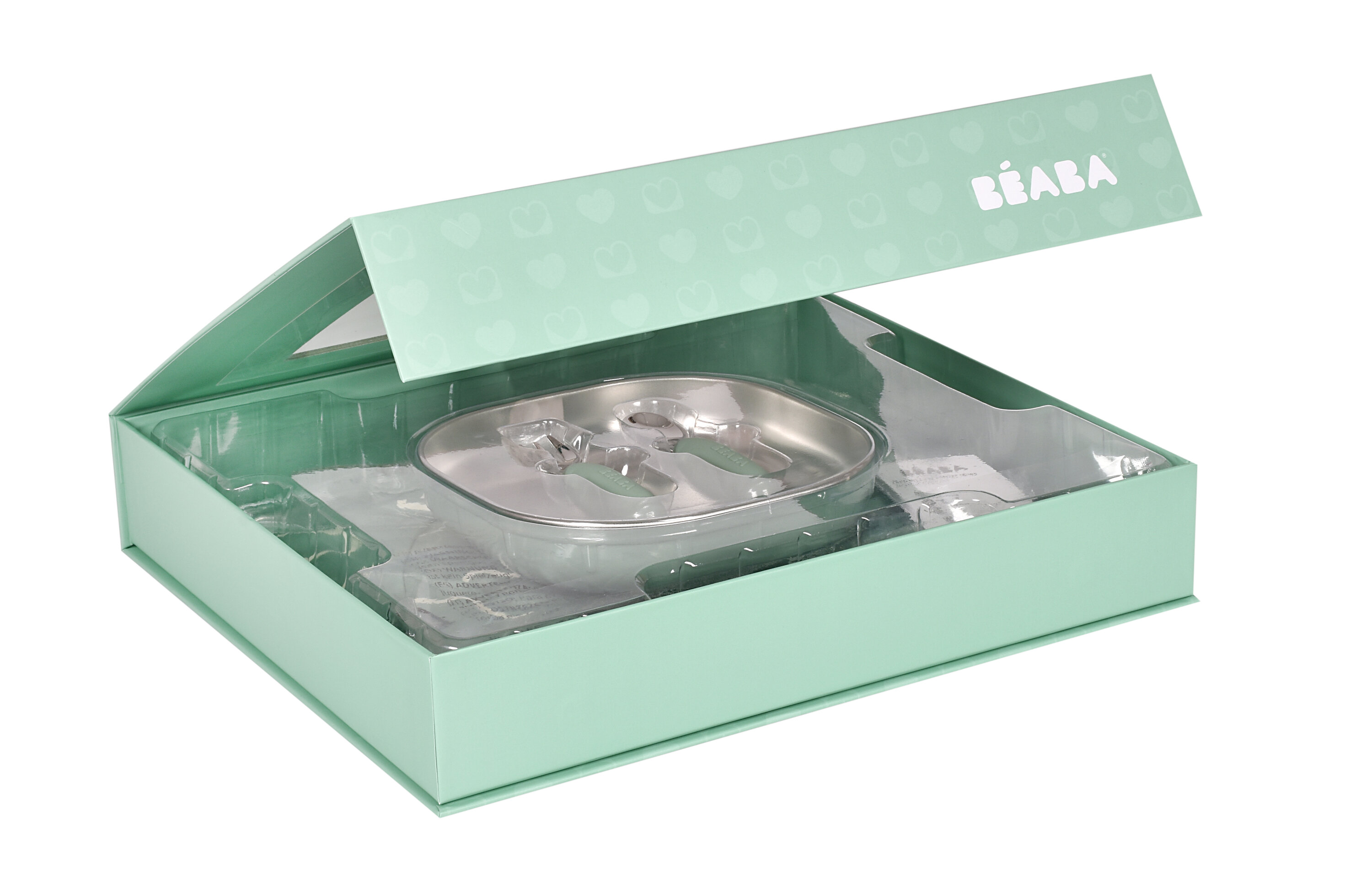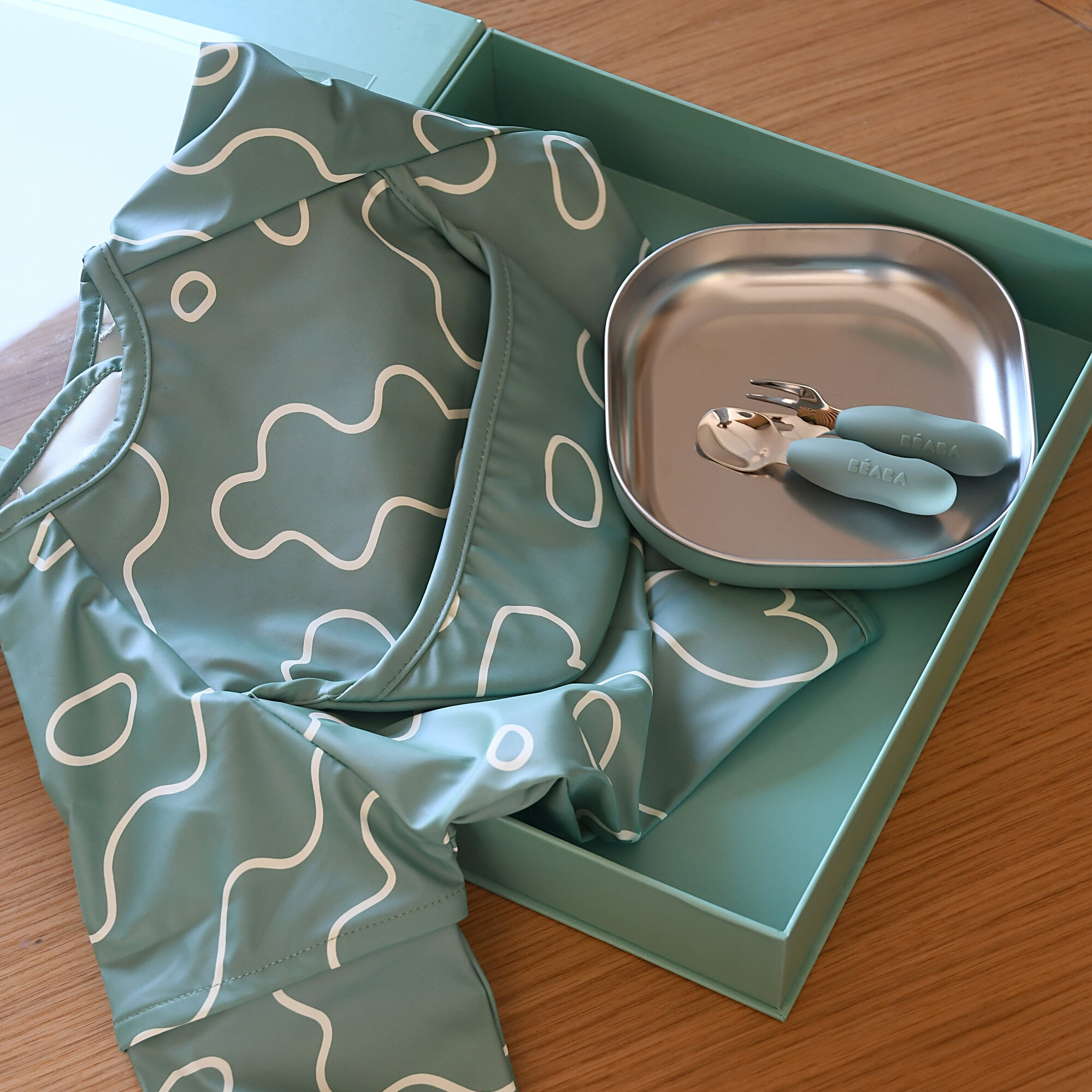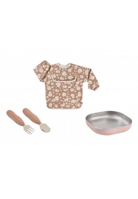 Jedálenskú sadu pre najmenších tvorí nerezový tanier so silikónovou povrchovou vrstvou, ergonomická tréningová lyžička a vidlička a podbradník s odopínacími rukávmi a vreckom na omrvinky. Krásnu krabičku, v ktorej je sada zabalená môžete používať aj ako krabičku na drobnosti.