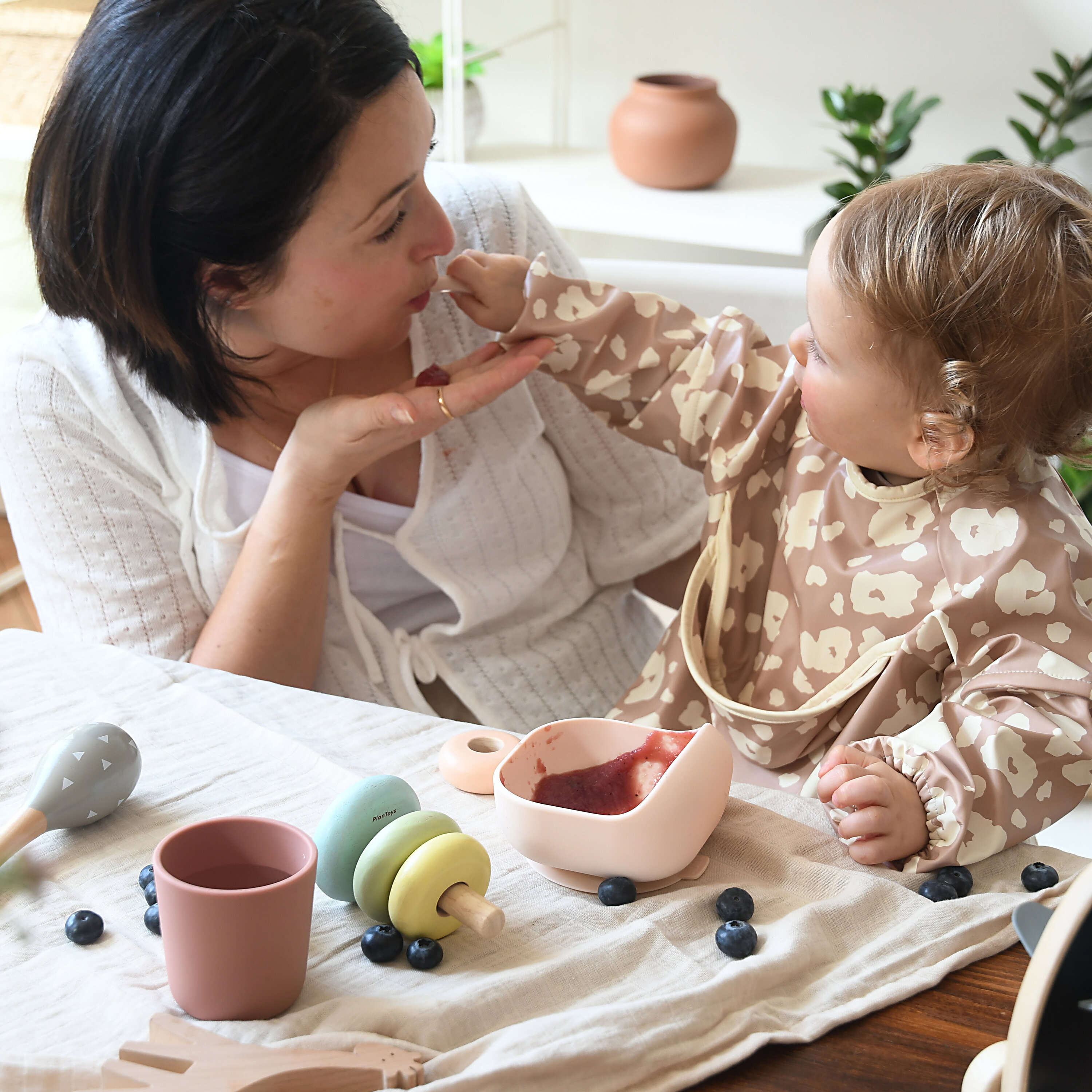 Sada talíře, misky, kelímku na pití a lžičky z vysoce kvalitního silikonu je ideální pro první samostatné krmení. Přísavka u misky a talíře umožňuje uchycení ke stolu nebo pultu jídelní židličky. Ergonomický tvar usnadňuje nabírání příkrmu.