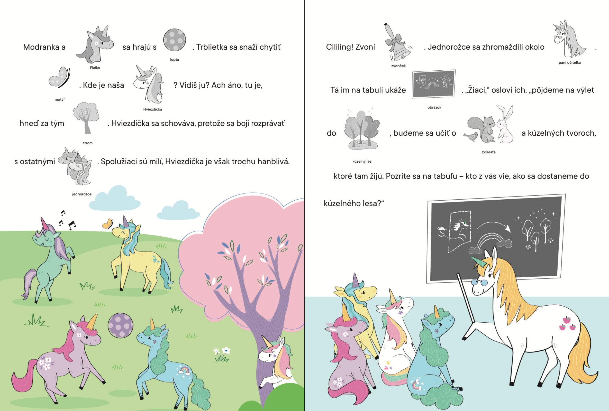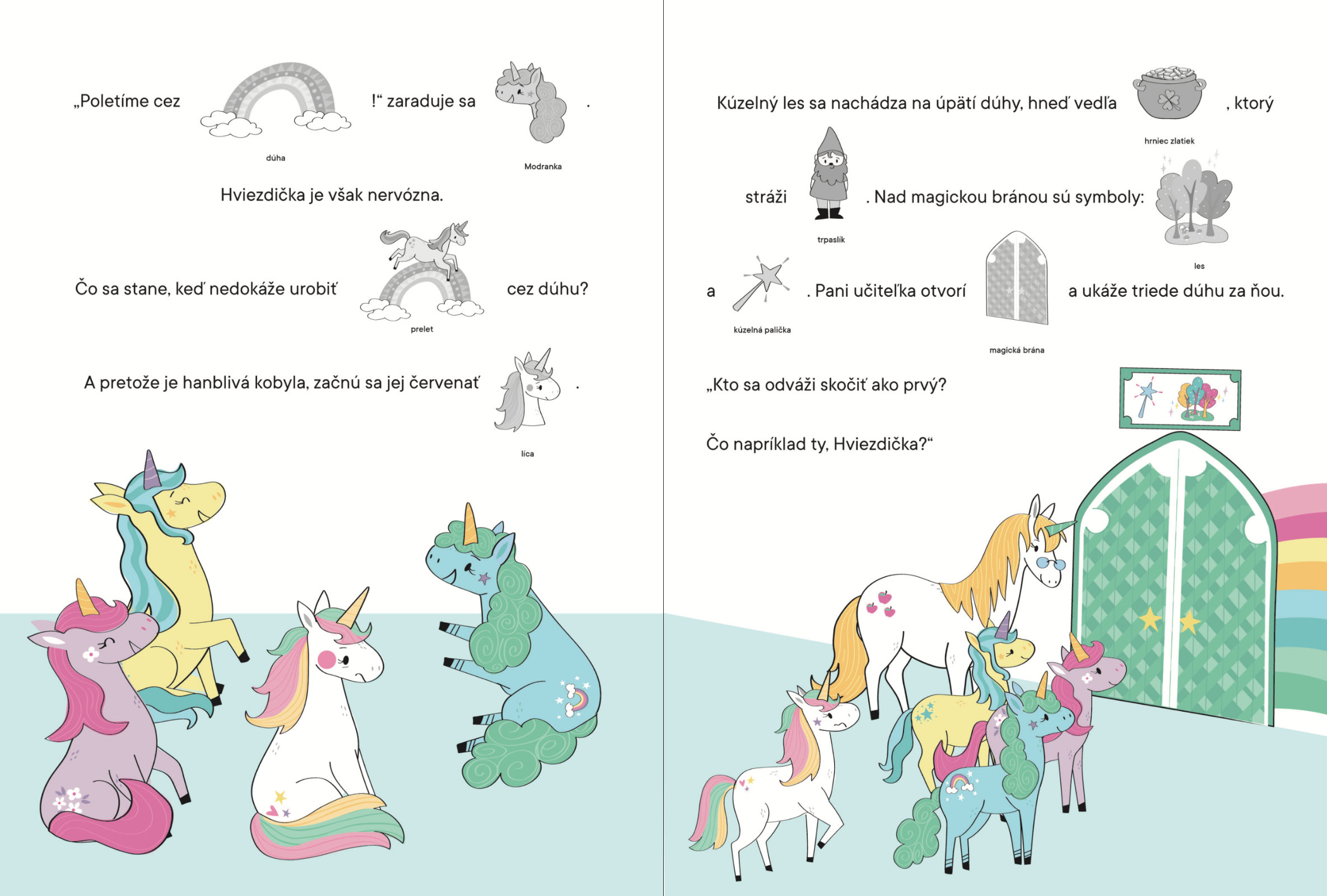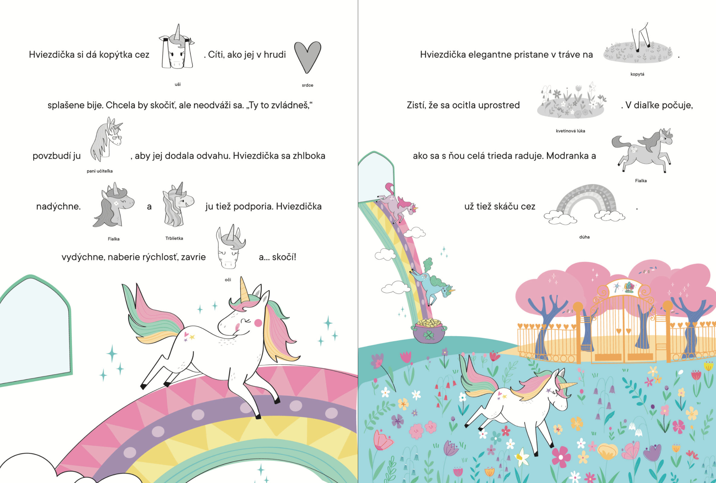 Obrázkové čítanie so samolepkami! Hviezdička je malá kobylka jednorožca, ktorá je trošku hanblivá. Jej spolužiaci sú milí, ale ona sa aj napriek tomu stále bojí s nimi hrať. Keď pani učiteľka oznámi triede výlet do kúzelného lesa, Hviezdičke sčervenajú líca obavami. Dokáže preletieť dúhu? Prekoná svoju hanblivosť? Alebo bude musieť pomôcť niekomu inému a nájsť odvahu v sebe? Sleduj s nami jej príbeh plný priateľstva, odhodlania a kúzelných prekvapení! Máte radi jednorožce? Vezmi si nálepky, doplň ich na správne miesta a prečítaj si rozprávku o Hviezdičke spolu s rodičmi. Táto hravá, interaktívna kniha podporuje rozvoj reči, sebavedomia i fantázie. Čaká ťa čarovné čítanie so samolepkami v hlavnej úlohe!Počet strán: 16 + 8 samol.
