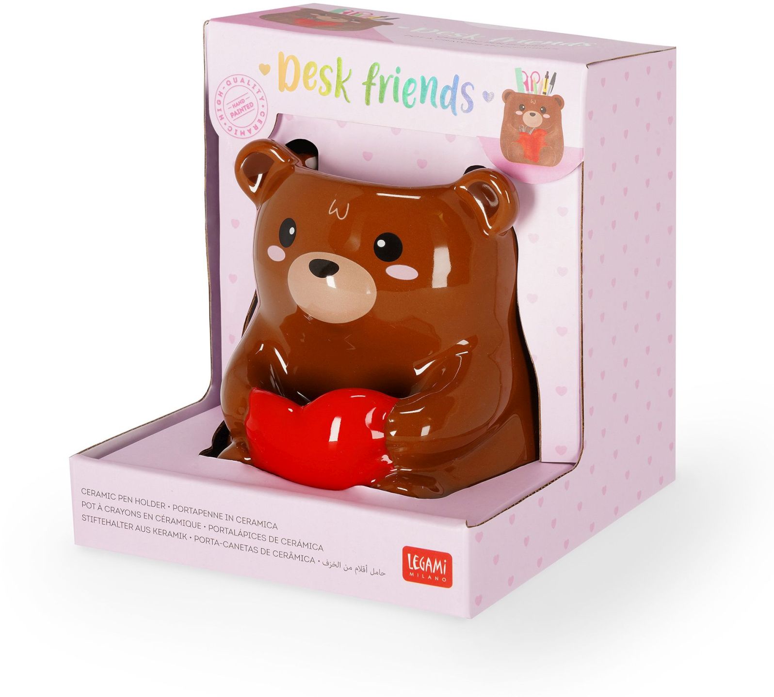 Na lásku by sa nemalo zabúdať – a najlepšie je mať ju každý deň na očiach. Keramický stojan na ceruzky Legami Desk Friends v motíve medvedíka je roztomilý, ručne maľovaný „spoločník“ na stôl, ktorý udrží vaše písacie potreby pekne pokope a zároveň pripomenie, že na vás niekto myslí.