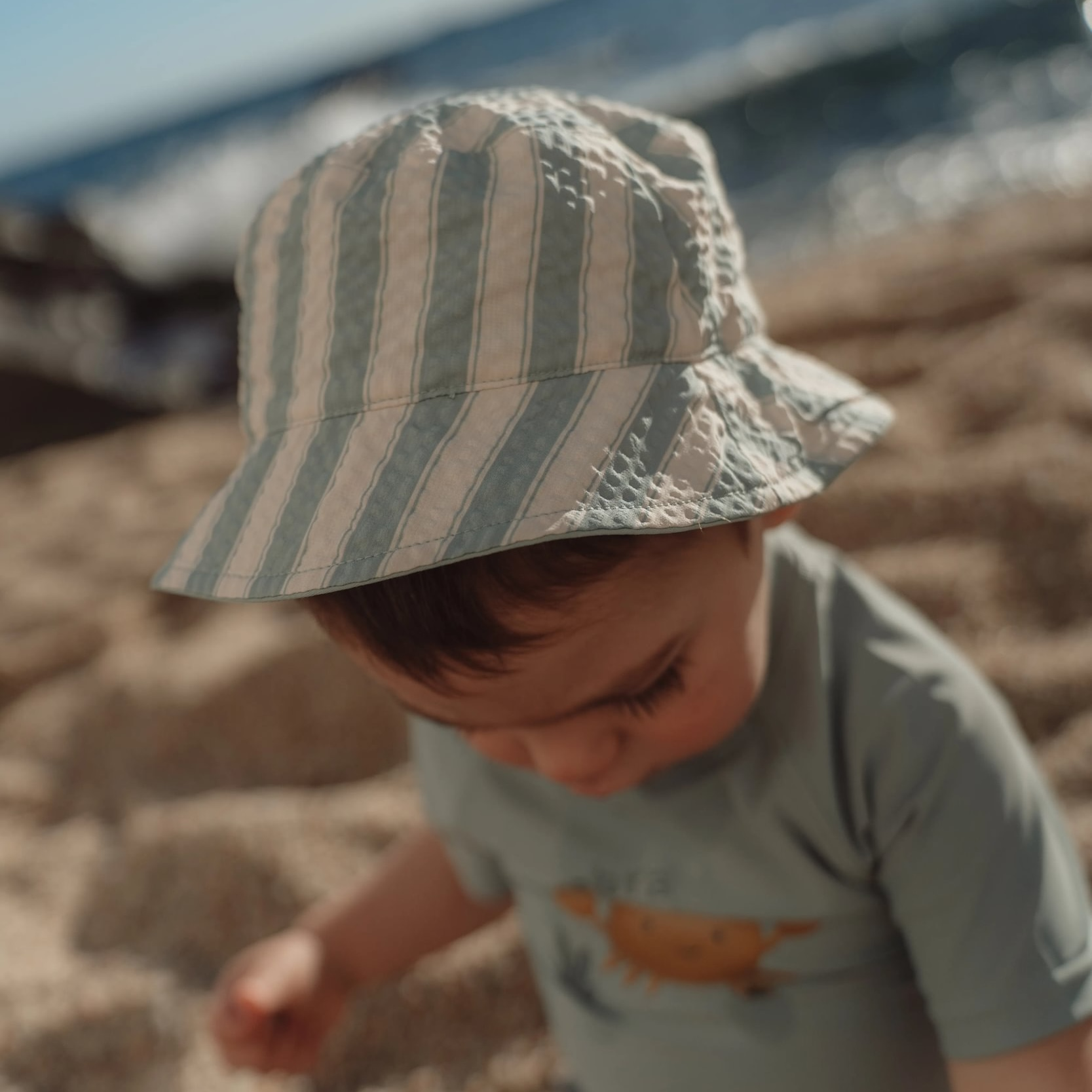 Obojstranný klobúčik s krásnou potlačou chráni vaše dieťa pred slnkom pri kúpaní pri mori aj doma na záhrade. Či už vaše deti milujú skákanie vo vlnách, kúpanie v bazéne alebo si rady stavajú hrady z piesku, s touto čiapočkou si môžu bezstarostne užívať celý deň. Obojstranné prevedenie ponúka na výber dva designy - jednofarebný s potlačou a pruhovaný.