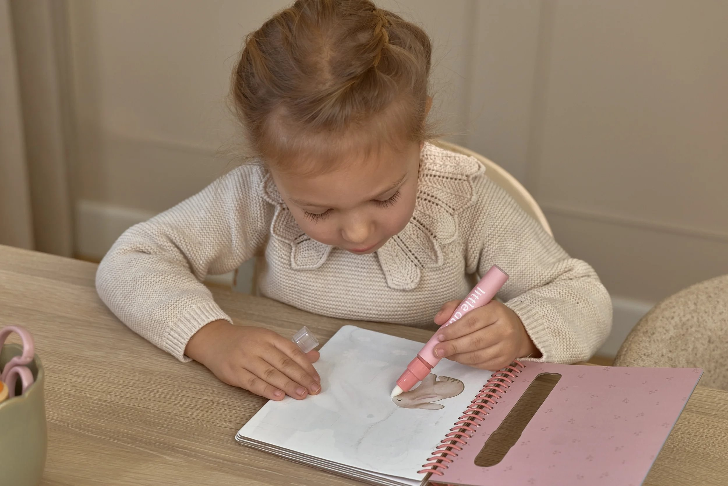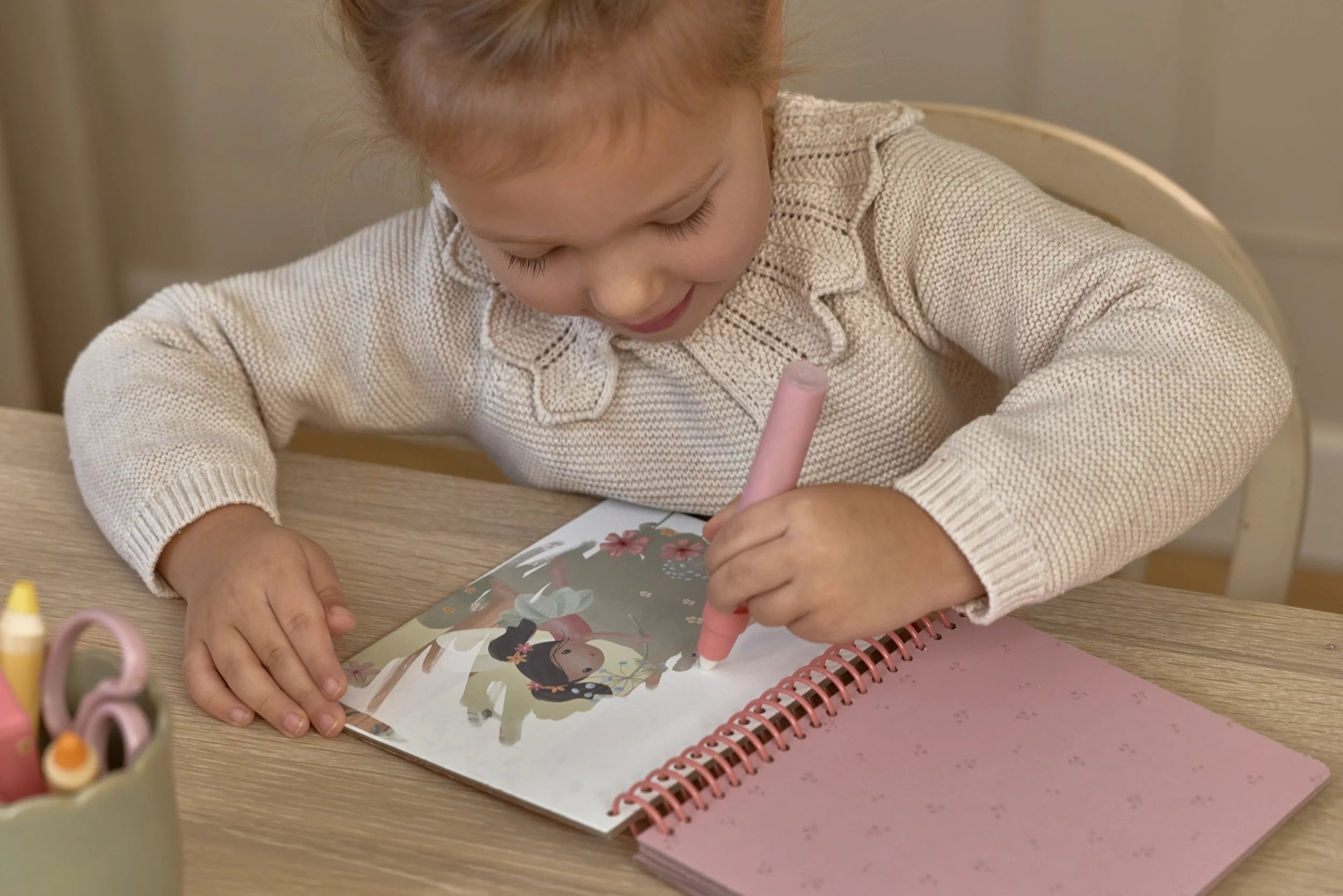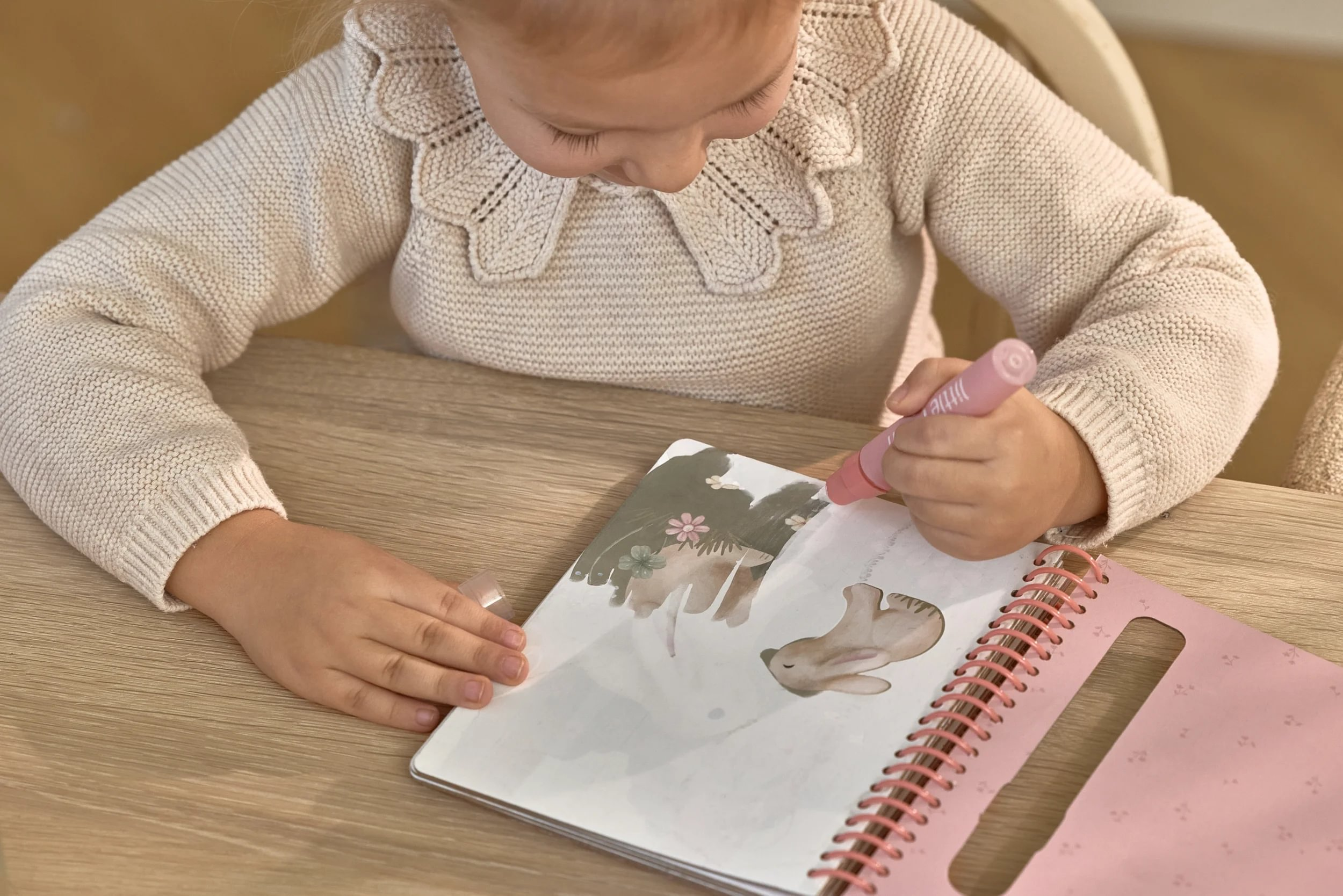 Knižka s piatimi ilustrovanými stránkami je opakovane použiteľná. Vďaka krúžkovej väzbe z pevného kartónu drží otvorená na pohodlné maľovanie.