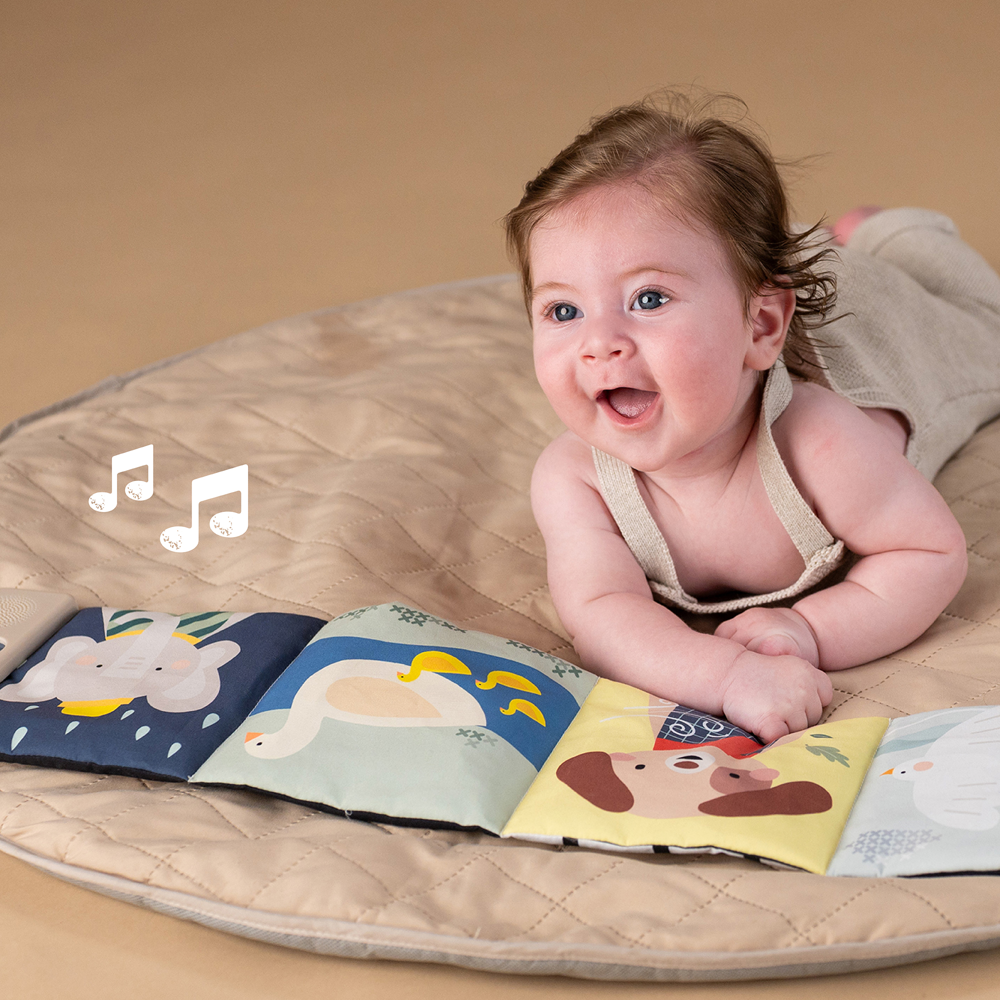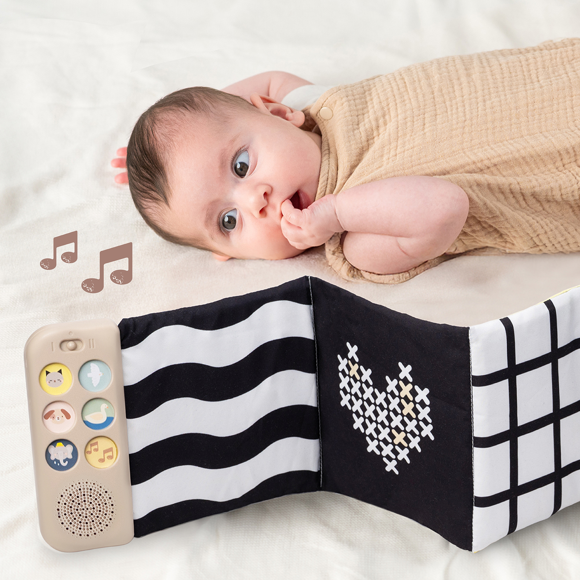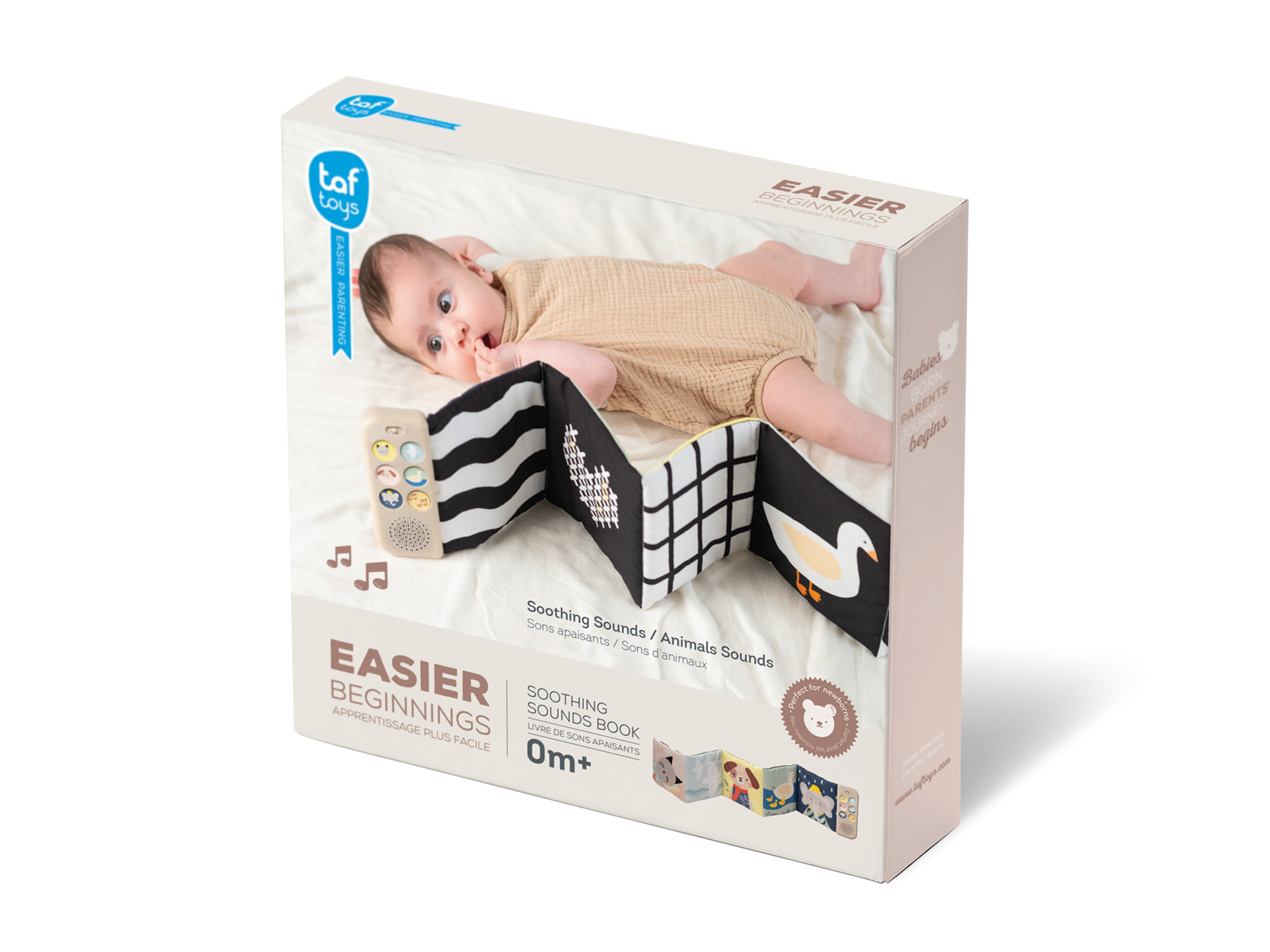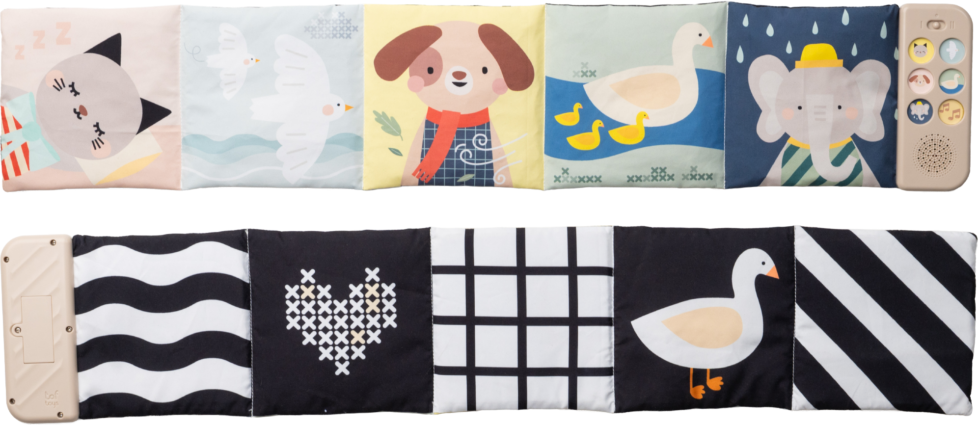 Obojstranná textilná knižka Taf Toys pomôže zabaviť a upokojiť bábätko už od narodenia. Knižka samostatne stojí a je tak ideálna na hranie na brušku. Vďaka klipom ju ľahko umiestnite aj do kočíka na zabavenie dieťaťa na cestách.