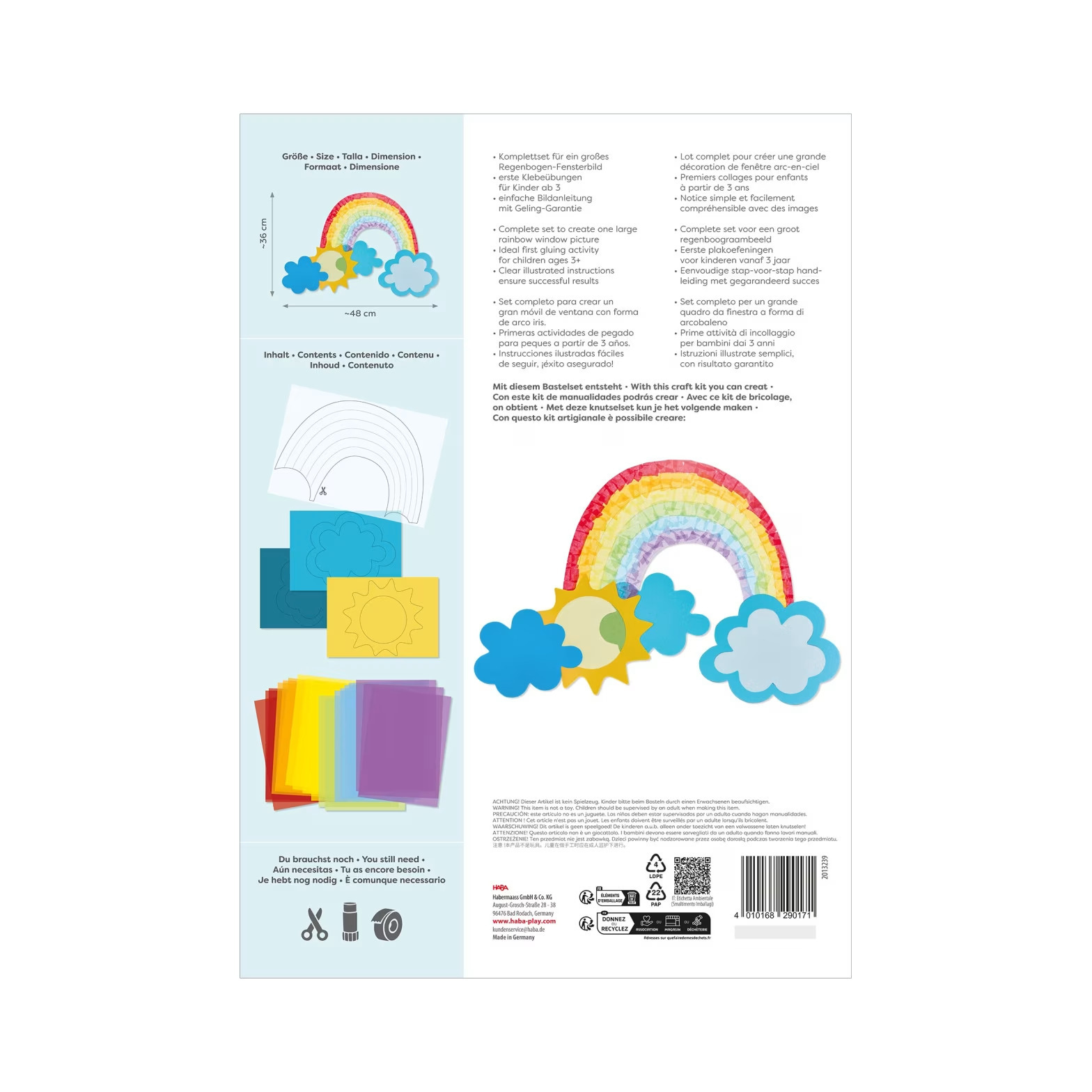 Dúha – kreatívna sada pre malých tvorcov umožní deťom vytvoriť jeden veľký dúhový okenný obrázok, ktorý bude krášliť ich izbičku farebnými odleskami svetla. Ide o prvé lepenie špeciálne navrhnuté pre najmenších. Sada je určená pre deti od 3 rokov a vďaka jednoduchému obrázkového návodu so zárukou úspechu zvládne celý postup každé dieťa samostatne. Práca s drobnými dielmi prirodzene rozvíja jemnú motoriku a koncentráciu.