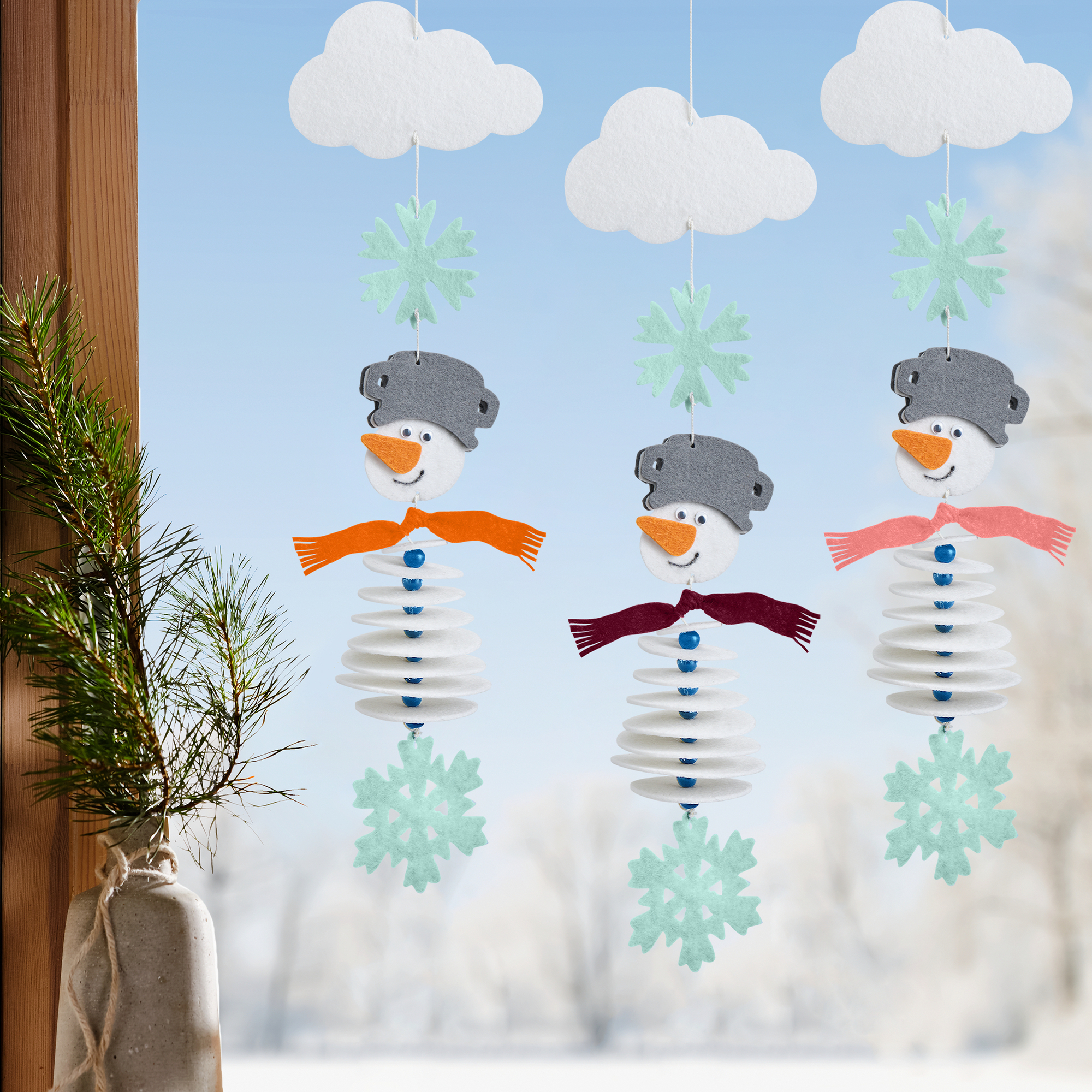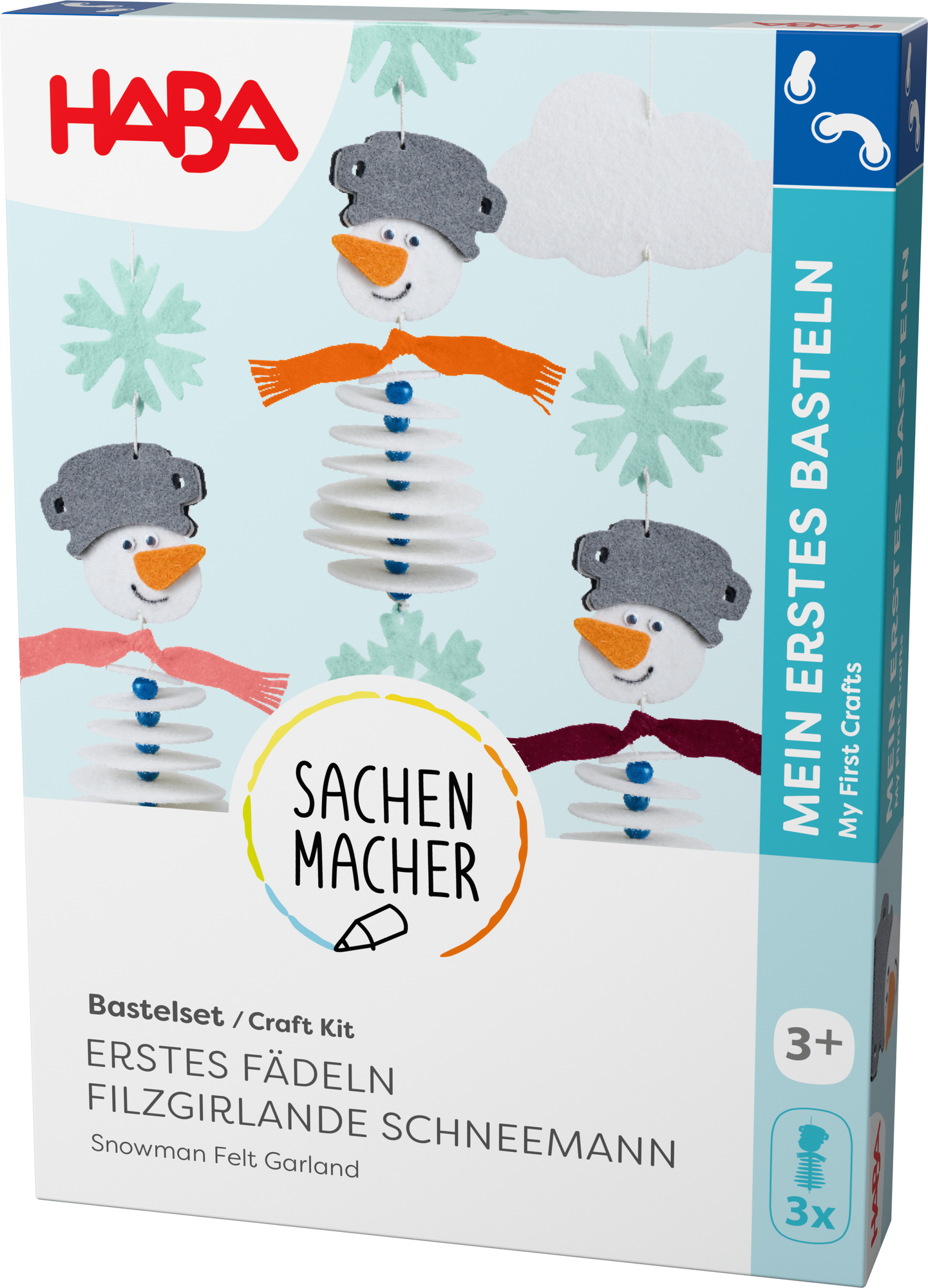 Naša kreatívna sada Prvé navliekanie plstená girlanda Snehuliak je ideálna na prvé pokusy s navliekaním pre deti od 3 rokov. Podporuje jemnú motoriku a koncentráciu a obsahuje jednoduchú obrázkovú inštrukciu s vysokou pravdepodobnosťou úspechu. V sade nájdete všetko potrebné pre vytvorenie troch čarovných plstených girland so snehuliakmi – plstené dieliky ľahko uchopiteľné aj pre malé deti. Hotové dekorácie dodajú domovu zimnú atmosféru a ideálne sa hodia na zavesenie na okno, dvere či stenu. Obsah: 3 snehuliaci (každý z 7 kruhov, hlava, mrkva, 2 klipovacie očká, šál, 7 drevených korálok), 3 obláčiky, 6 snehových vločiek, 3 m nite na navliekanie, plastová ihla a návod na použitie.