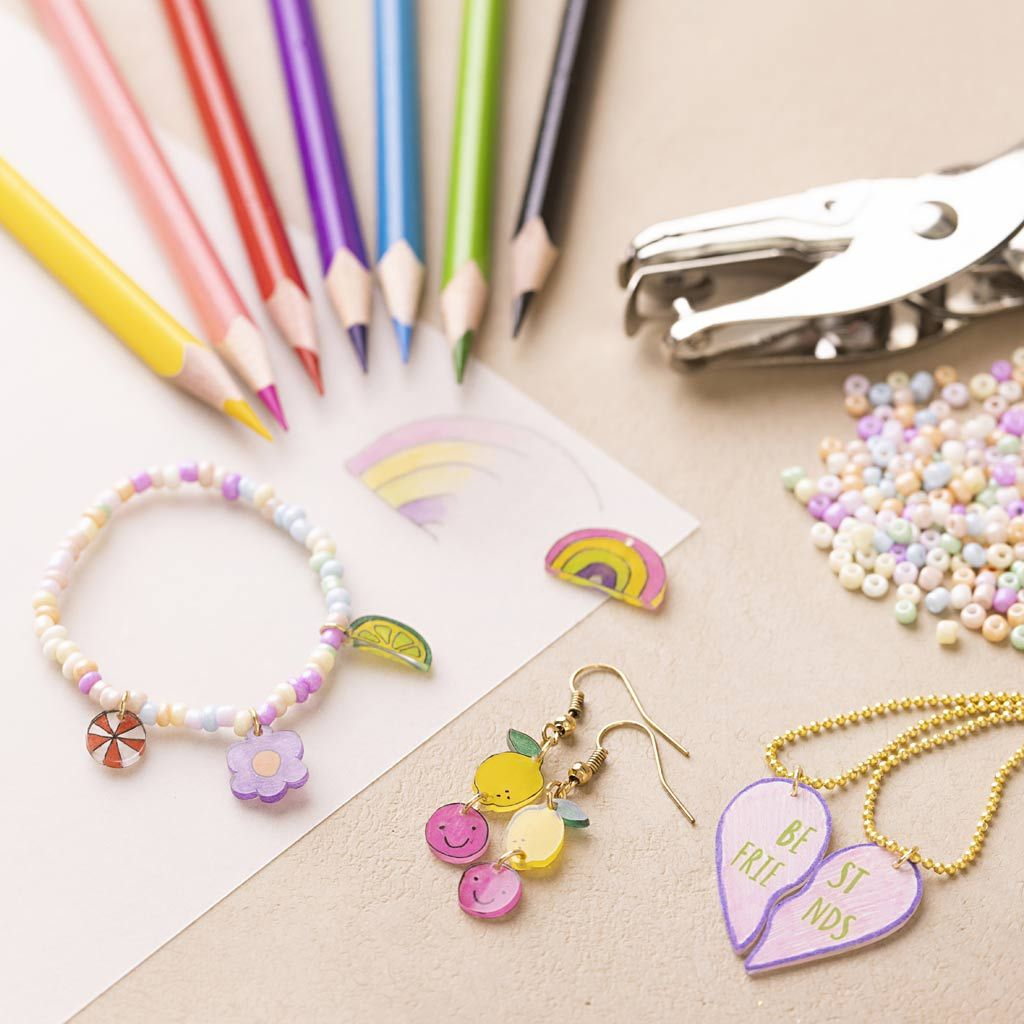 Originálna kreatívna sada na výrobu šperkov zo zmršťovacej fólie. Zábavná sada deťom umožní vyfarbiť motívy na zmršťovaciu fóliu, nechať ich v rúre zmenšiť a premeniť ich na originálne prívesky na náhrdelníky, náušnice aj náramky. Zmršťovanie je samo o sebe kúzelný zážitok - a výsledkom sú pevné, farebné a jedinečné šperky. Všetko potrebné je v balení vrátane návodu, ktorý nájdete na krabičke alebo online po naskenovaní QR kódu.