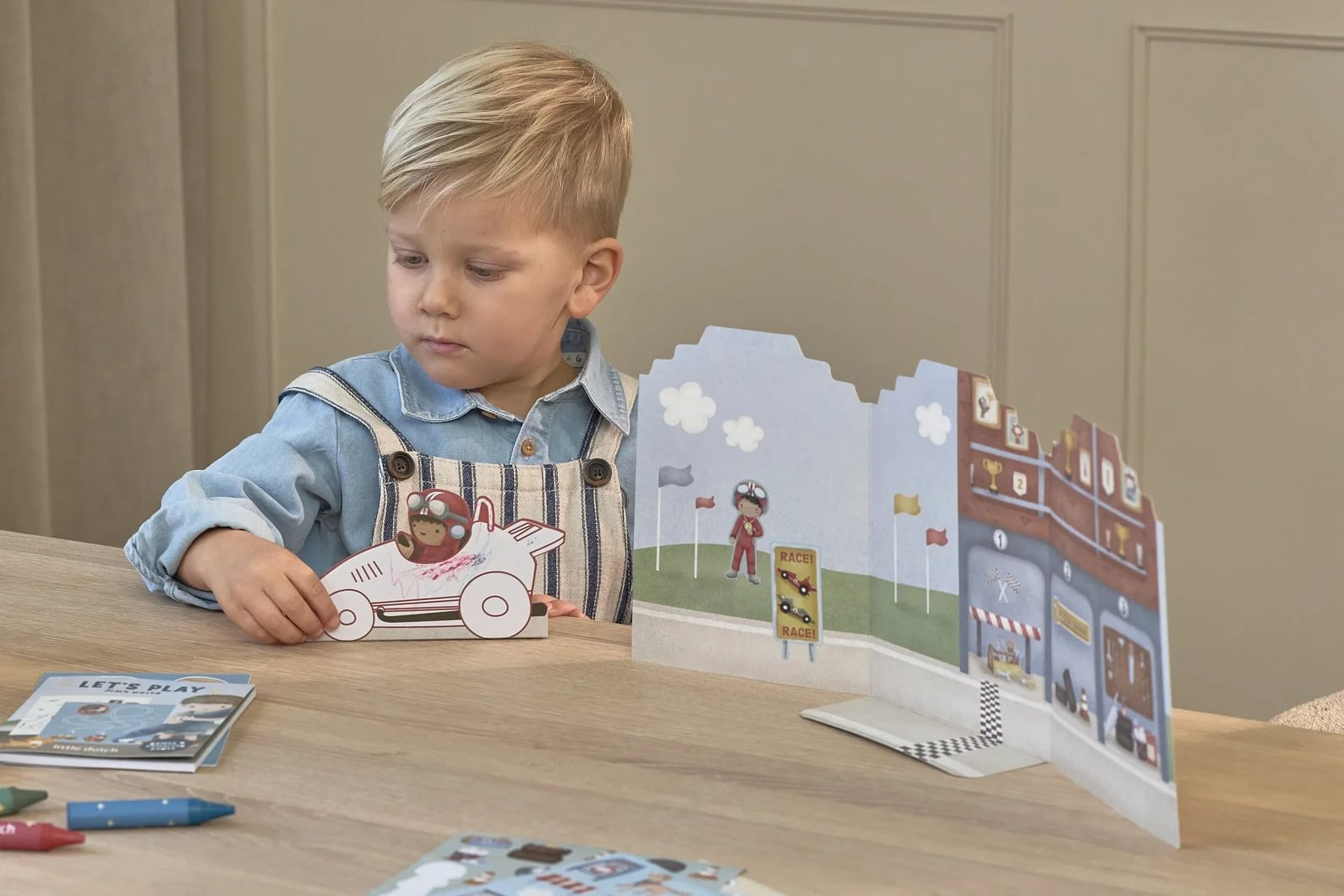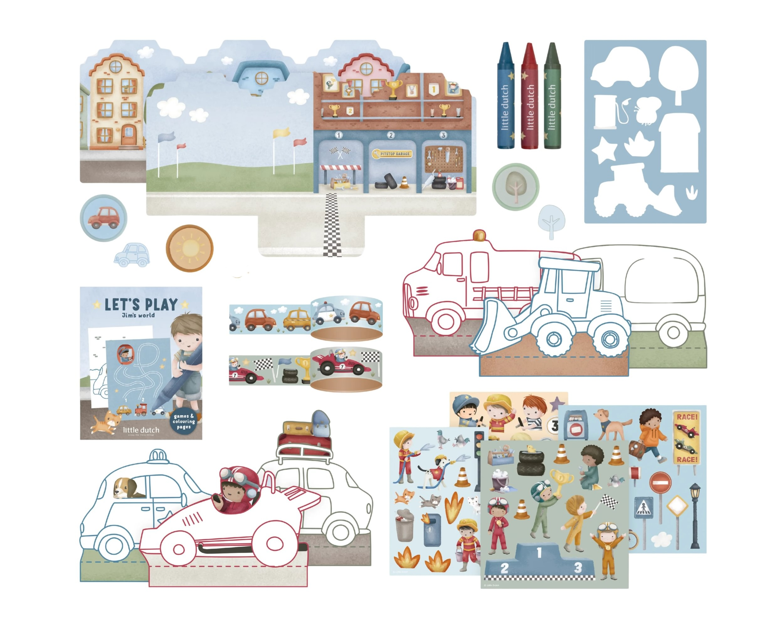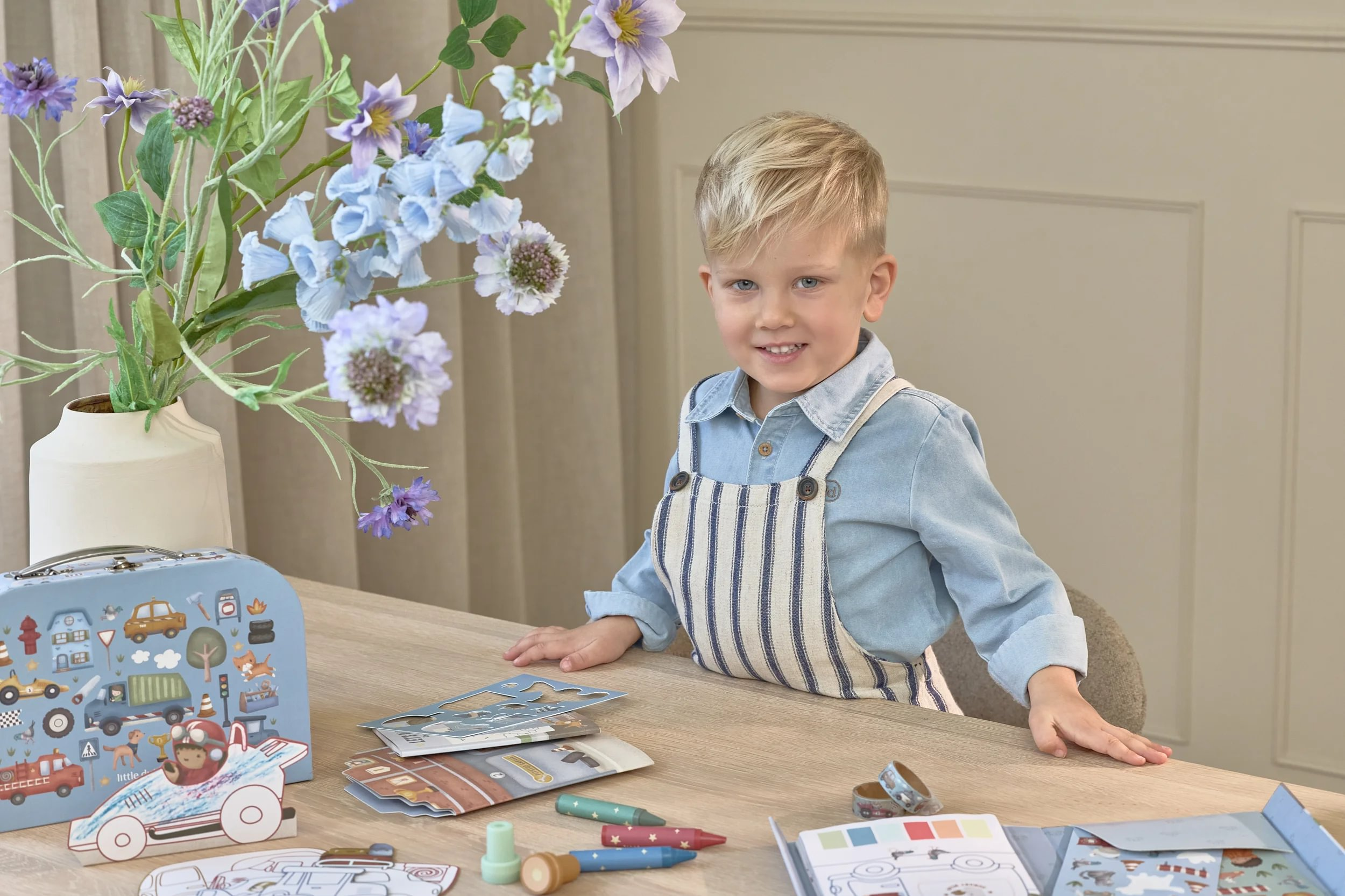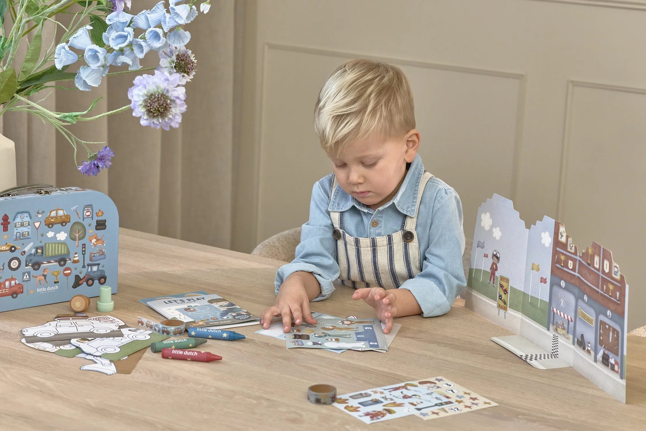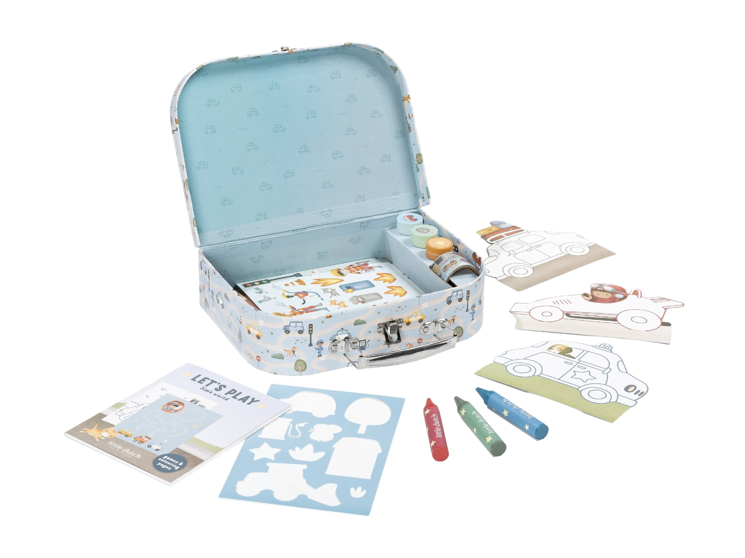 Veľká kreatívna súprava obsahuje potreby pre rôzne druhy výtvarného tvorenia vrátane pasteliek, samolepiek, pečiatok a pod. Motívy zo života v meste, rôzne dopravné prostriedky a profesie, to všetko nabáda k vymýšľaniu príbehov a kreatívnemu tvoreniu. Všetko je zabalené v krásnom kufríku, do ktorého všetko po skončení hry ľahko upracete.