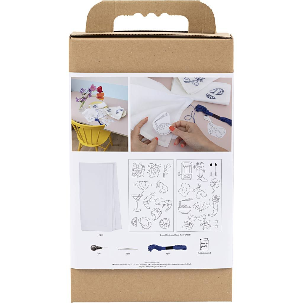 Originálna kreatívna sada na vyšívanie textilných obrúskov. Táto sada vám umožní vyšiť si vlastné látkové obrúsky a vytvoriť osobité prestieranie s elegantným detailom. V balení nájdete všetko potrebné pre štyri obrúsky vrátane návodu. Práca je jednoduchšia, než sa zdá: vyšívacie samolepky umiestnite na obrúsok, vyšijete motív podľa šablóny a po dokončení sa šablóny vo vode rozpustia. Výsledkom sú štyri jedinečné obrúsky, ktoré dodajú stolovaniu osobný štýl a urobia dojem na hostí.