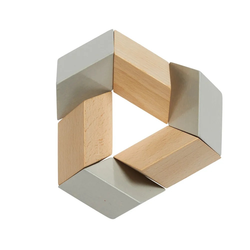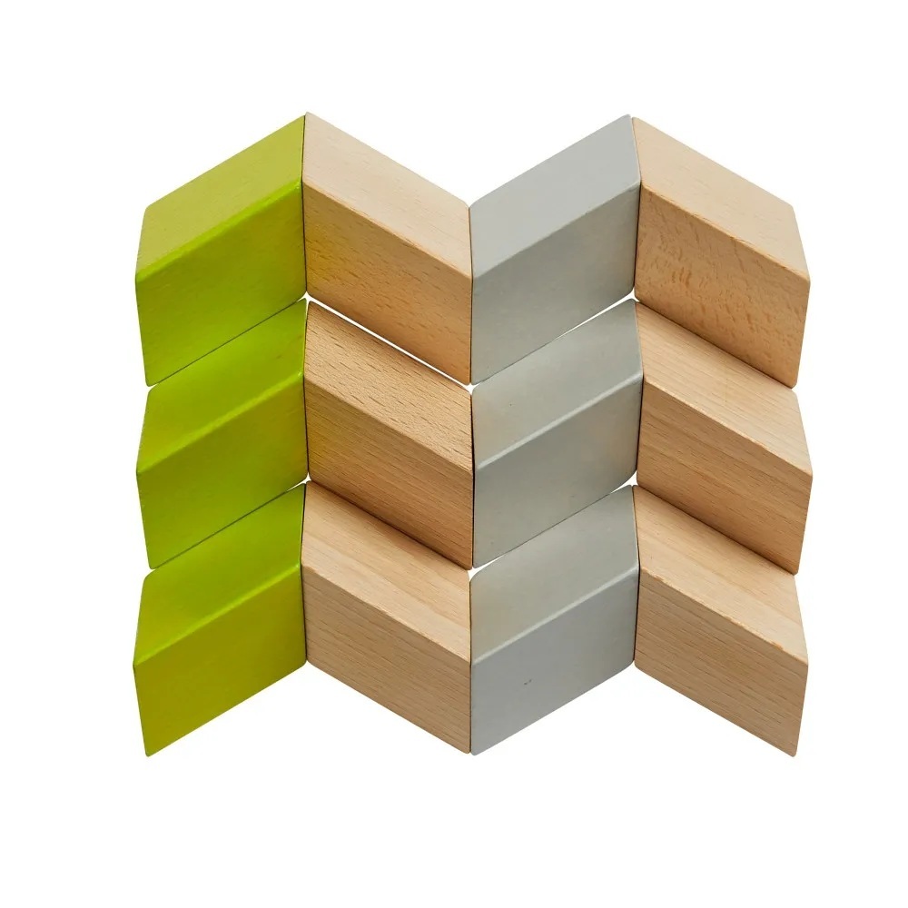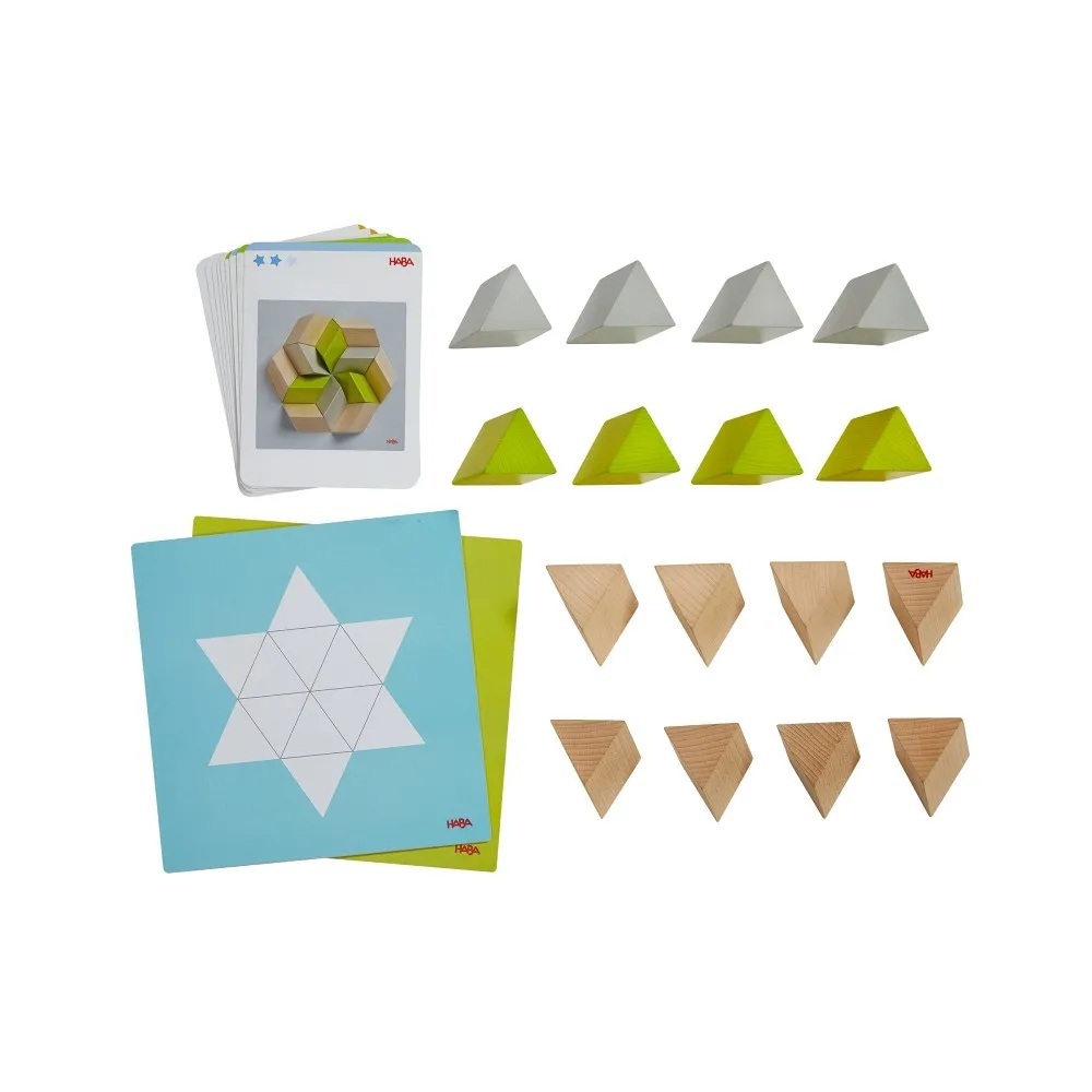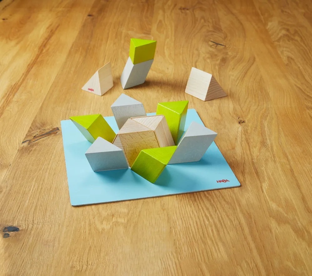 Kreatívna stavebnica pre deti od 5 rokov. Kocky sa síce skladajú neobvyklým spôsobom, ale deti rýchlo prídu na to, ktorá zo strán stavebných dielikov s rôznymi uhlami k sebe patrí, tak aby reprodukovali vzor podľa šablóny. Kocky možno skladať aj podľa vlastnej fantázie a vytvárať tak neobvyklé obrazce. Stavebnica umožňuje skladať obrazce v početných variáciách. Hra podporuje logické myslenie, jemnú motoriku a priestorovú predstavivosť. Obsah balenia: 16 stavebných blokov, 10 obojstranných šablón (3 úrovne náročnosti), 2 obojstranné dosky potlačené základnými tvarmi. Vyrobené v Nemecku.