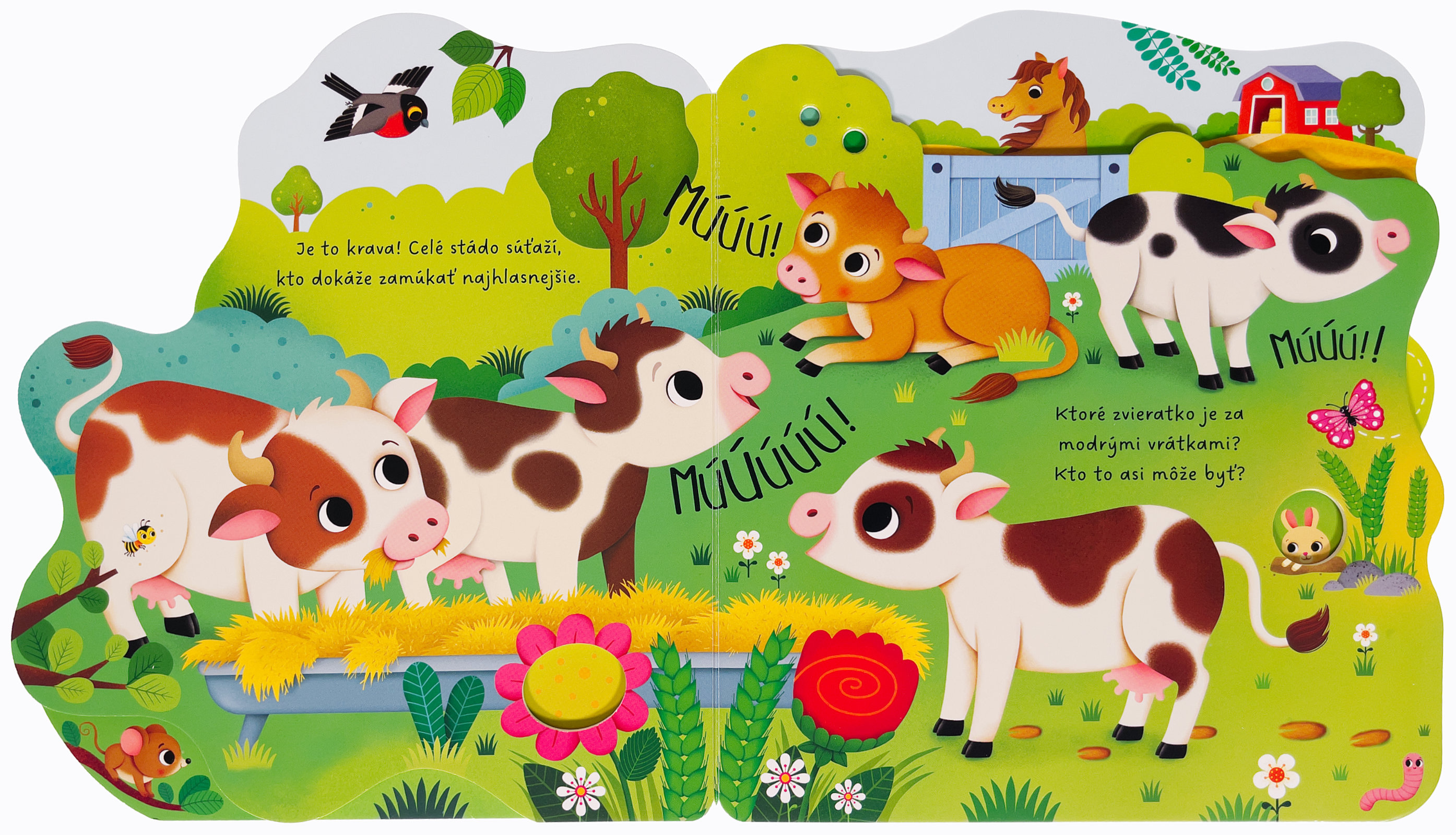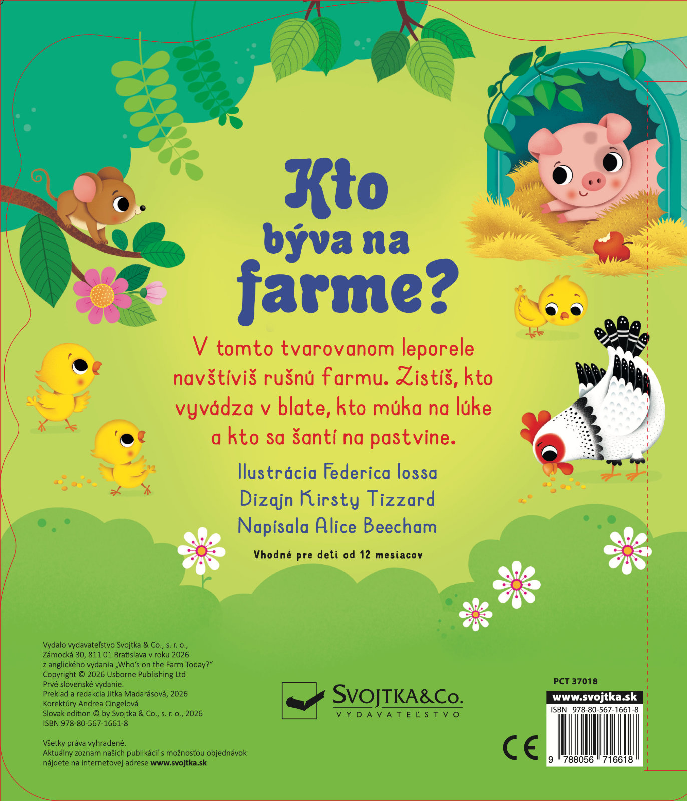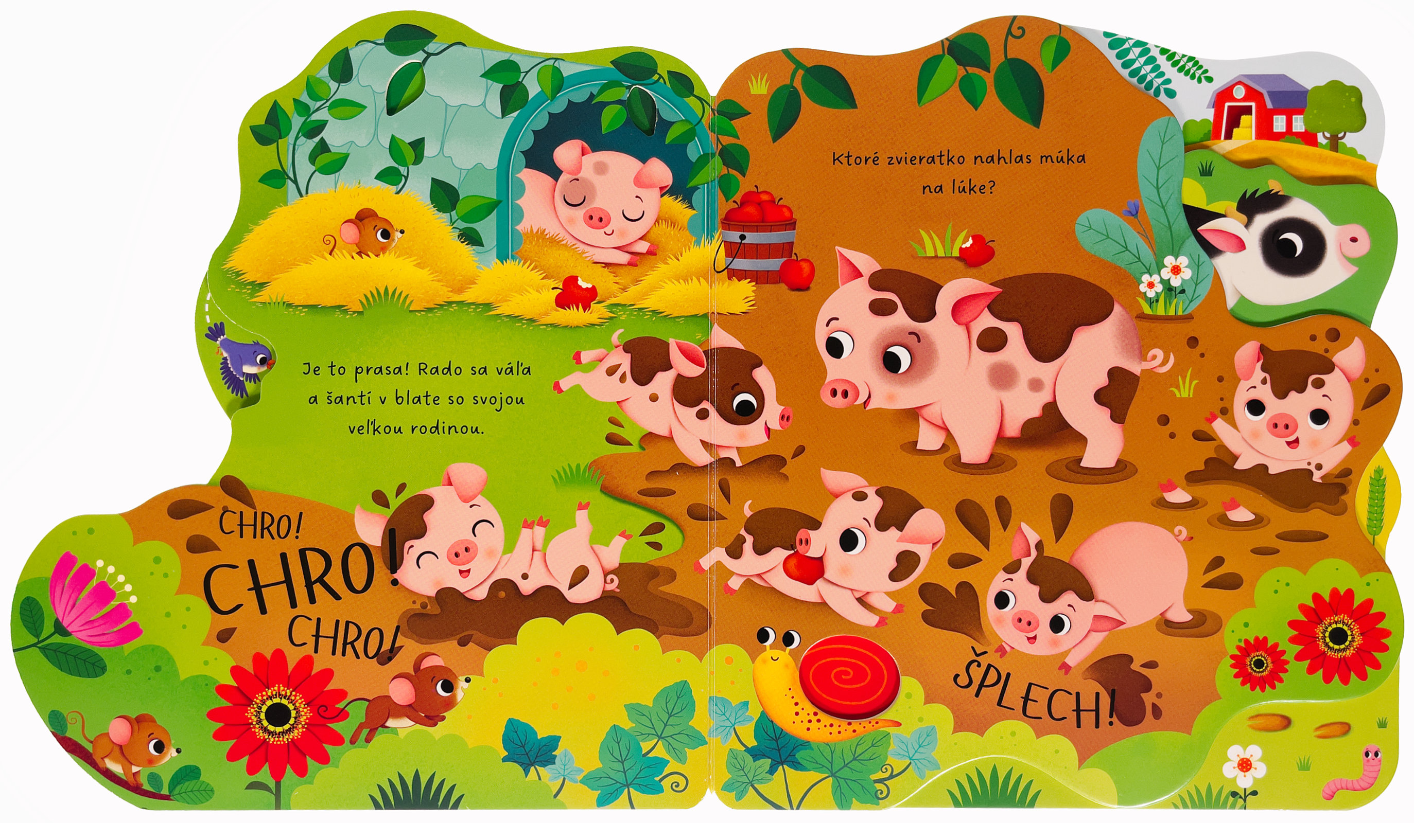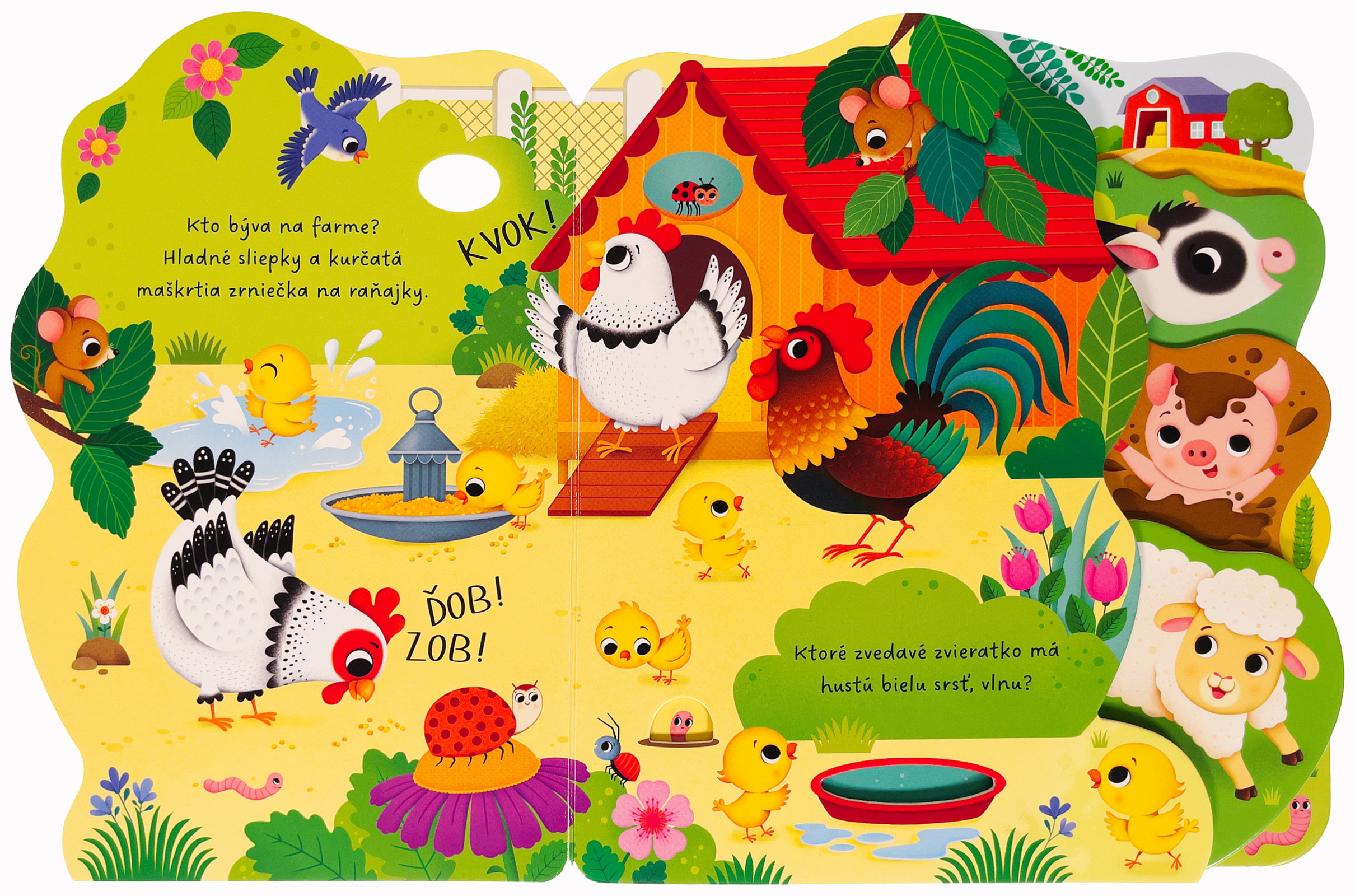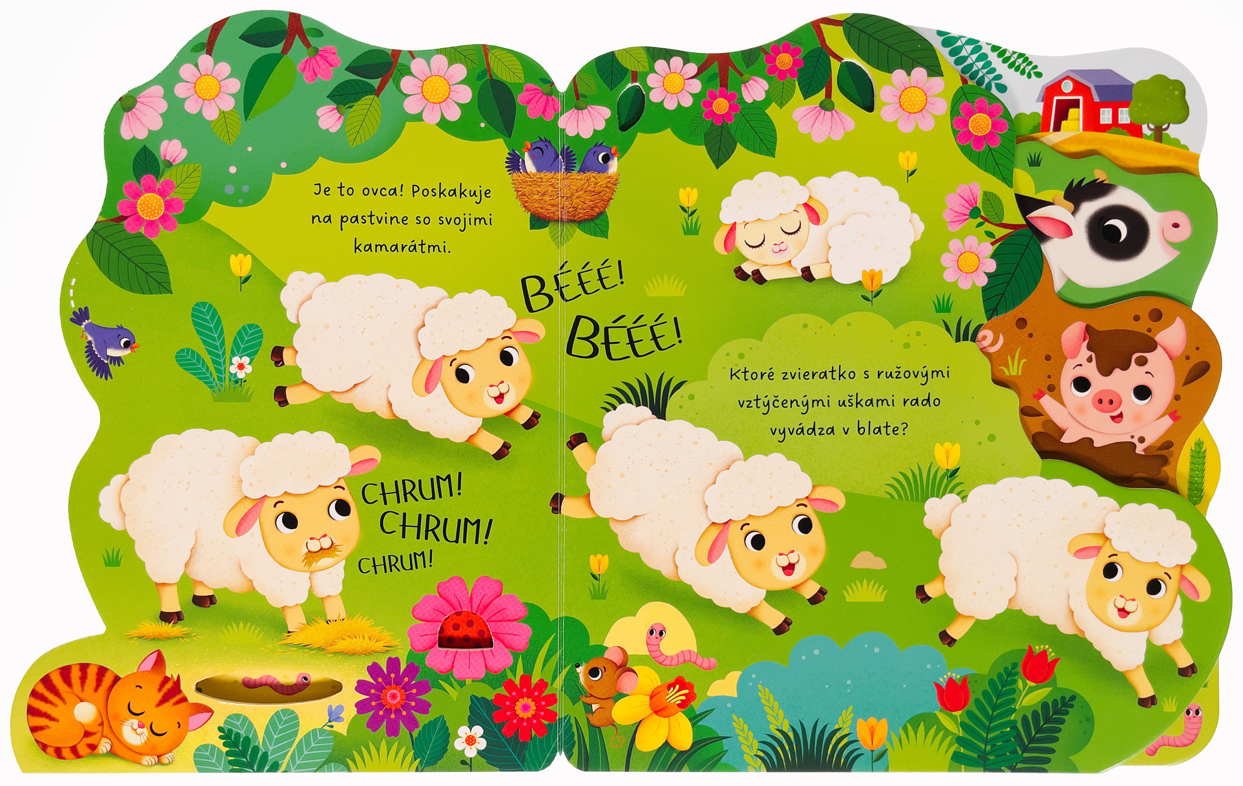 Navštív farmu a spoznaj veselé zvieratká. Leporelo má rôzne tvarované stránky, ktoré pomôžu malým detským prštekom s jednoduchým otáčaním a tiež zaujmú zvedavé hlavičky! Zo stránok vykúka kravička, prasiatko aj ovečka. Zisti, kto si pochutnáva na zrnkách, kto stojí pred stajňami alebo kto híka v ohrade. Hravo riešené leporelo s výrezmi a tvarovanými stránkami predstaví deťom farmu a najrôznejšie zvieratá.Počet strán: 10