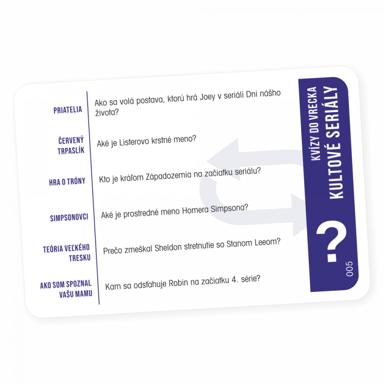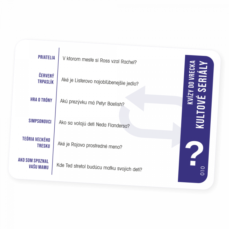 Pútavý zábavný kvíz, s ktorým si pripomeniete slávne seriály a ich protagonistov. Hra je vďaka svojmu prevedeniu vhodná aj na cesty – stačí ju vziať do vrecka a môžete začať hrať kdekoľvek. V hre nájdete 300 otázok rozdelených do 6 seriálov: Priatelia, Červený trpaslík, Hra o tróny, Simpsonovci, Teória veľkého tresku a Ako som spoznal vašu mamu. Hra obsahuje: 50 kariet, pravidlá
