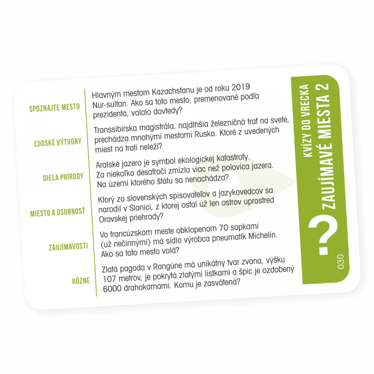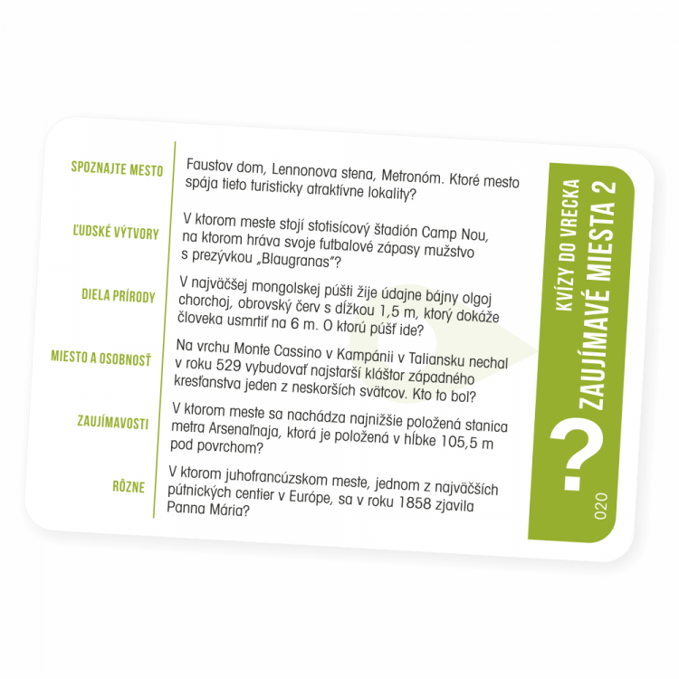 Pútavý zábavný kvíz, ktorý vás zavedie na turisticky najatraktívnejšie miesta sveta. Hra je vďaka svojmu prevedeniu vhodná aj na cesty – stačí ju vziať do vrecka a môžete začať hrať kdekoľvek. V hre nájdete 300 otázok rozdelených do 6 tematických okruhov: Spoznajte mesto, Ľudské výtvory, Diela prírody, miesto a osobnosť, Zaujímavosti a Rôzne. Hra obsahuje 50 kariet, pravidlá