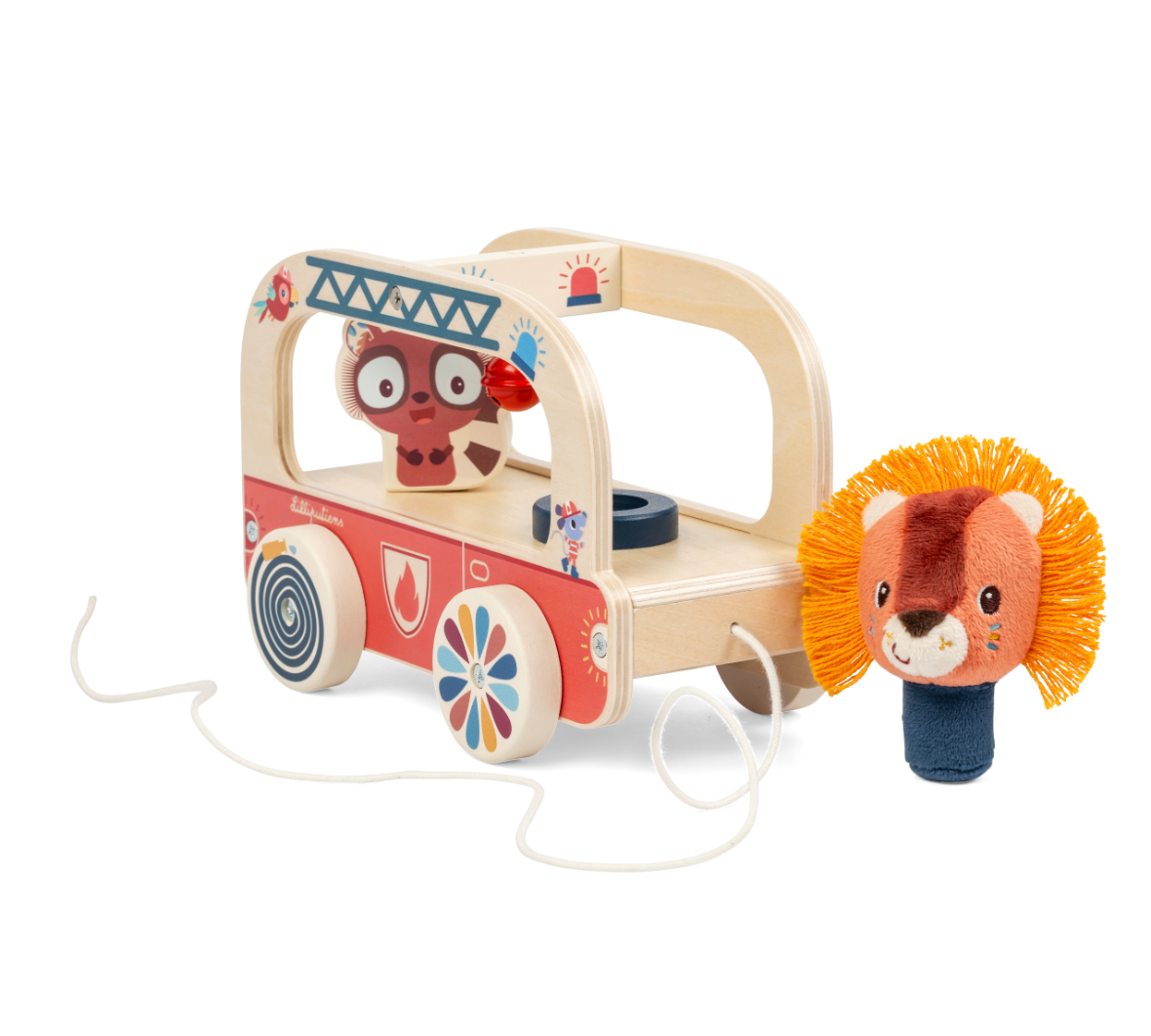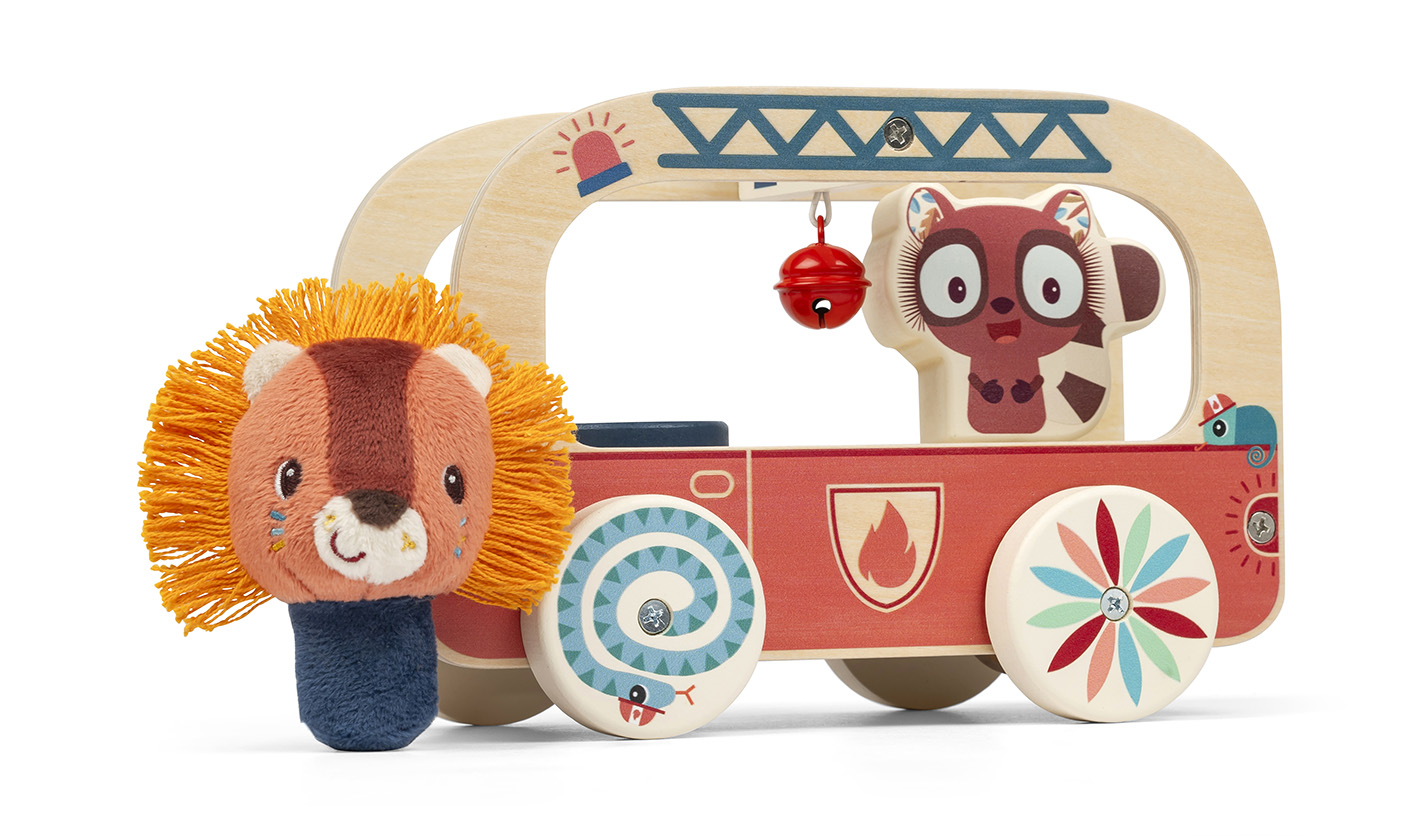 Toto hasičské auto leva Jacka je plné zábavných prvkov a je vhodné pre deti od 10 mesiacov. Keď vaše dieťa hasičským autom jazdí, aktivuje sa zábavný mechanizmus: vo vnútri sa otáča lemur Elvis, ktorý je v kontakte so zavesenou rolničkou a tá veselo cinká. Je to ideálny pomocník s objavovaním pohybu, zvuku a stimuluje fantáziu vášho dieťaťa. Toto malé drevené hasičské auto sa batoľatám ľahko ovláda ťahom za šnúrku, ktorá je odnímateľná. Hračka je vyrobená z dreva, ktoré pochádza zo zodpovedne obhospodarovaných lesov a z polyesteru. Drevené časti a rolničku možno otierať na povrchu a plyšového leva možno prať v práčke na 30 °C na jemný cyklus.