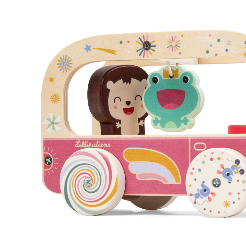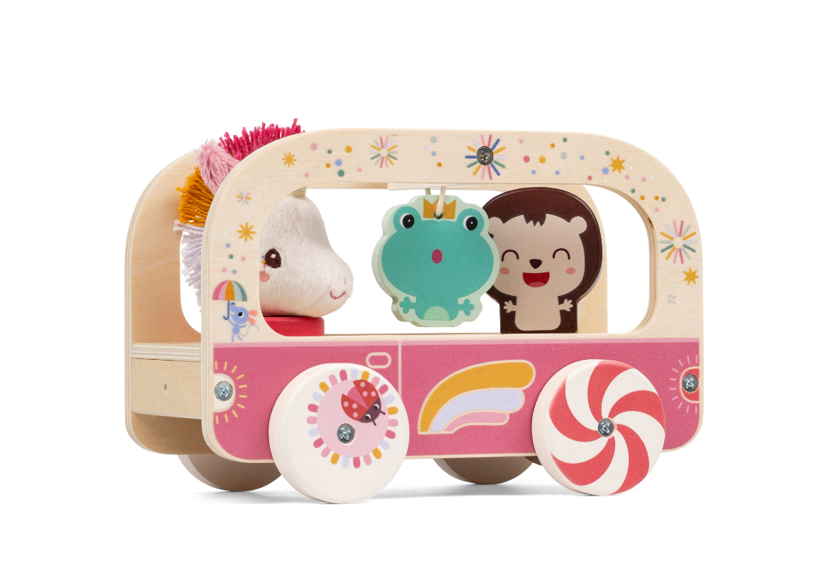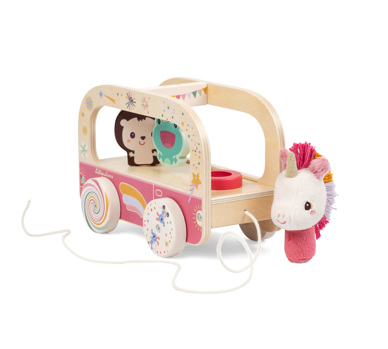 Tento čarovný autobus jednorožca Leny je plný zábavných prvkov a je vhodný pre deti od 10 mesiacov. Keď sa s autobusom jazdí, aktivuje sa zábavný mechanizmus: vo vnútri sa otáča ježko Leon, ktorý je v kontakte so zavesenou žabkou a tá sa hojdá všetkými smermi. Je to ideálny pomocník s objavovaním pohybu a stimuluje fantáziu vášho dieťaťa. Tento malý drevený autobus sa batoľatám ľahko ovláda ťahom za šnúrku, ktorá je odnímateľná. Hračka je vyrobená z dreva, ktoré pochádza zo zodpovedne obhospodarovaných lesov a z polyesteru. Drevené časti možno otierať na povrchu a jednorožca možno prať v práčke na 30 °C na jemný cyklus.