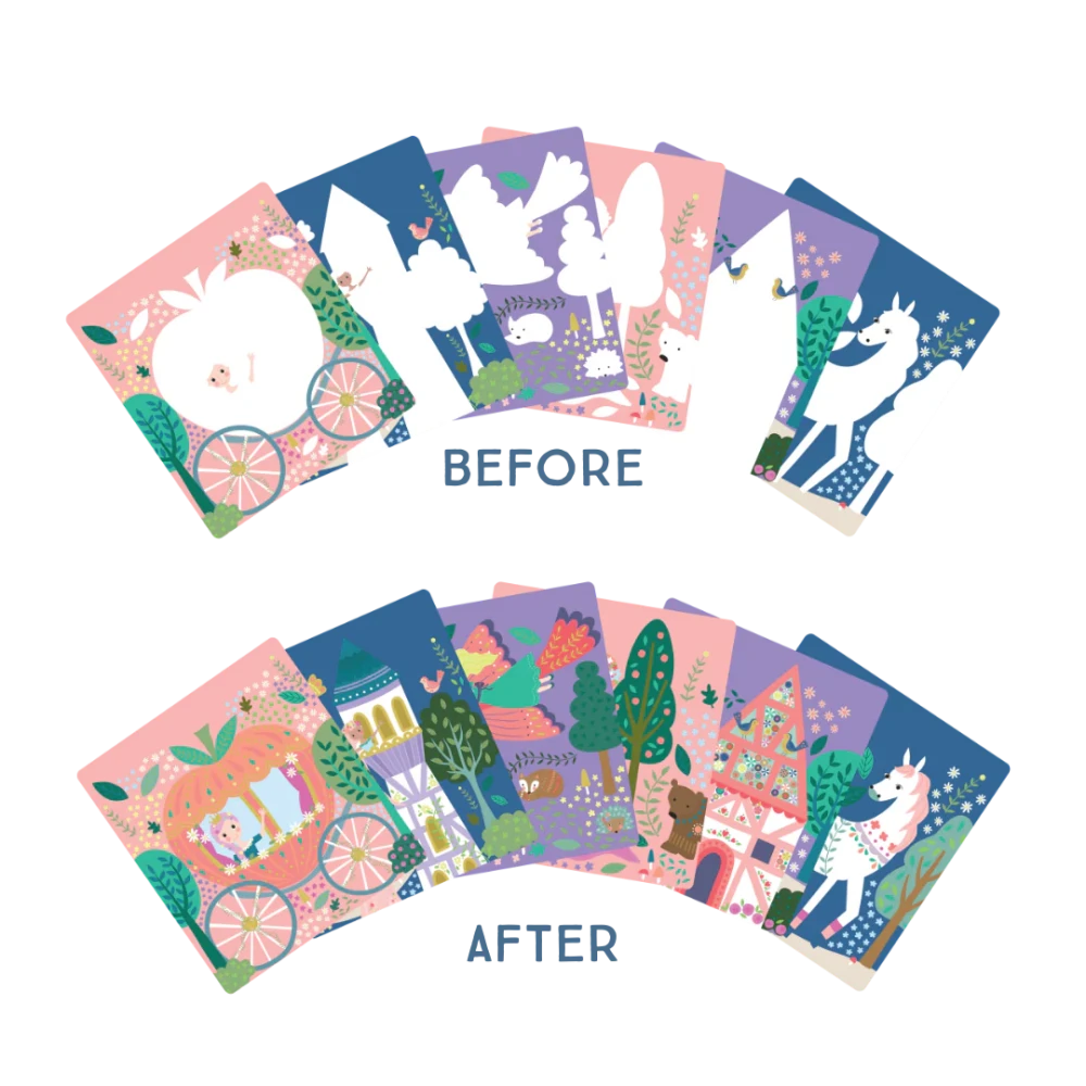Sada obsahuje 6 pevných kariet so slovami, číslami a rozprávkovými scénami, ktoré podporujú učenie hrou, jemnú motoriku aj fantáziu. Po vyschnutí sa obrázky opäť stratia a karty možno používať znova a znova.