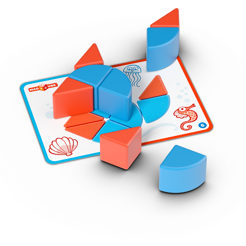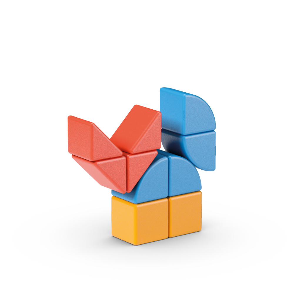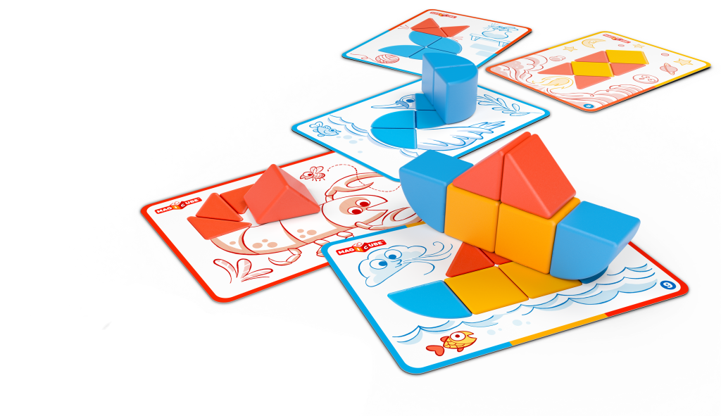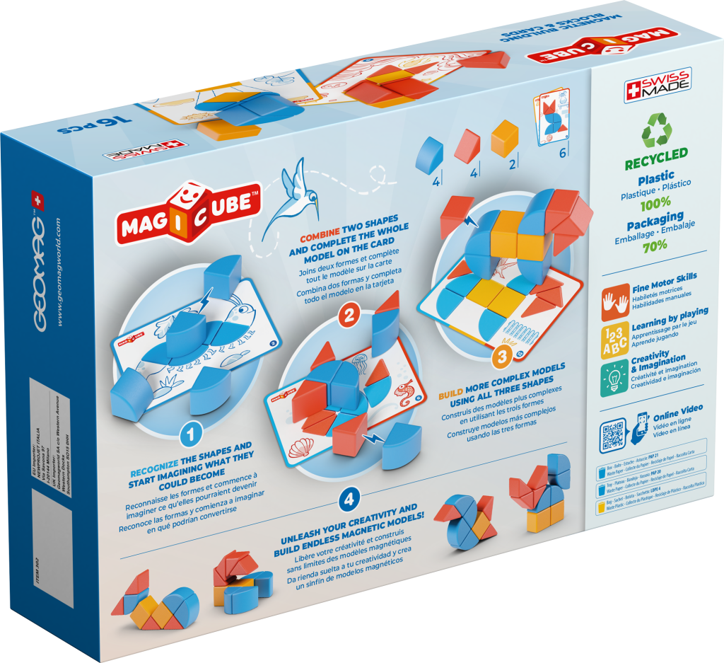 Unikátna magnetická stavebnica doplnená kartičkami pre ľahké vytváranie obrázkov. Prechádza od jednoduchých po zložitejšie varianty práce s rôznymi tvarmi. Atraktívna zábava pre menšie deti – podporuje fantáziu a tvorivosť. Obsahuje 10 magnetických prvkov a 6 obojstranných kartičiek s 12 návodmi. Vyrobené zo 100% recyklovaného plastu. Vhodné pre deti od 2 rokov.