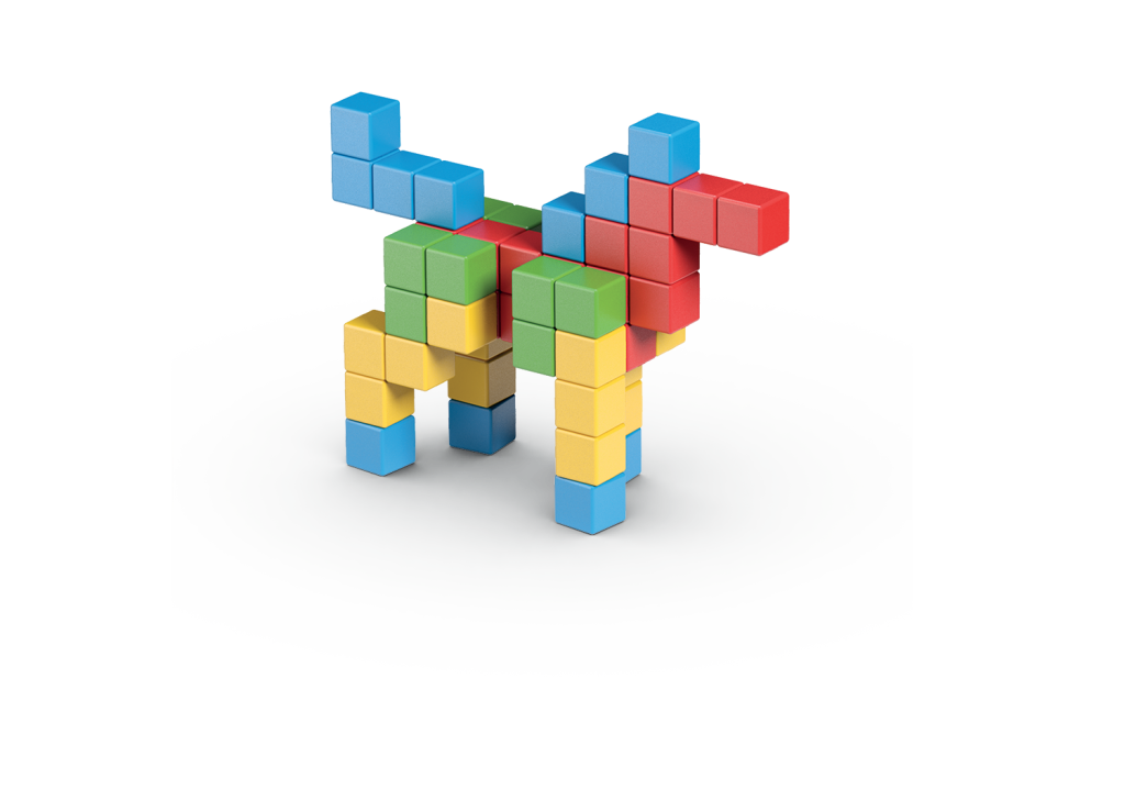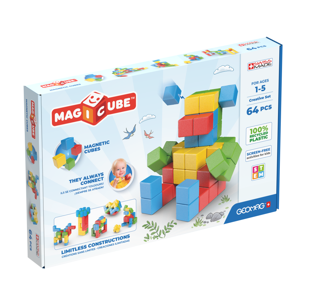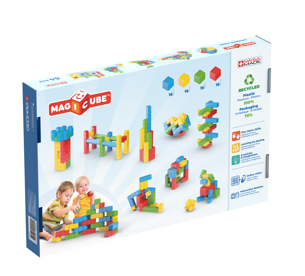 Díky speciální vnitřní konstrukci se magnetické kostičky přitahují ze všech šesti stran a drží i volně v prostoru - stavění ve 3D. Obsahuje 64 kostek ve čtyřech barvách. Vyrobeno ve Švýcarsku ze 100% recyklovaného plastu. Vhodné od 1 roku.