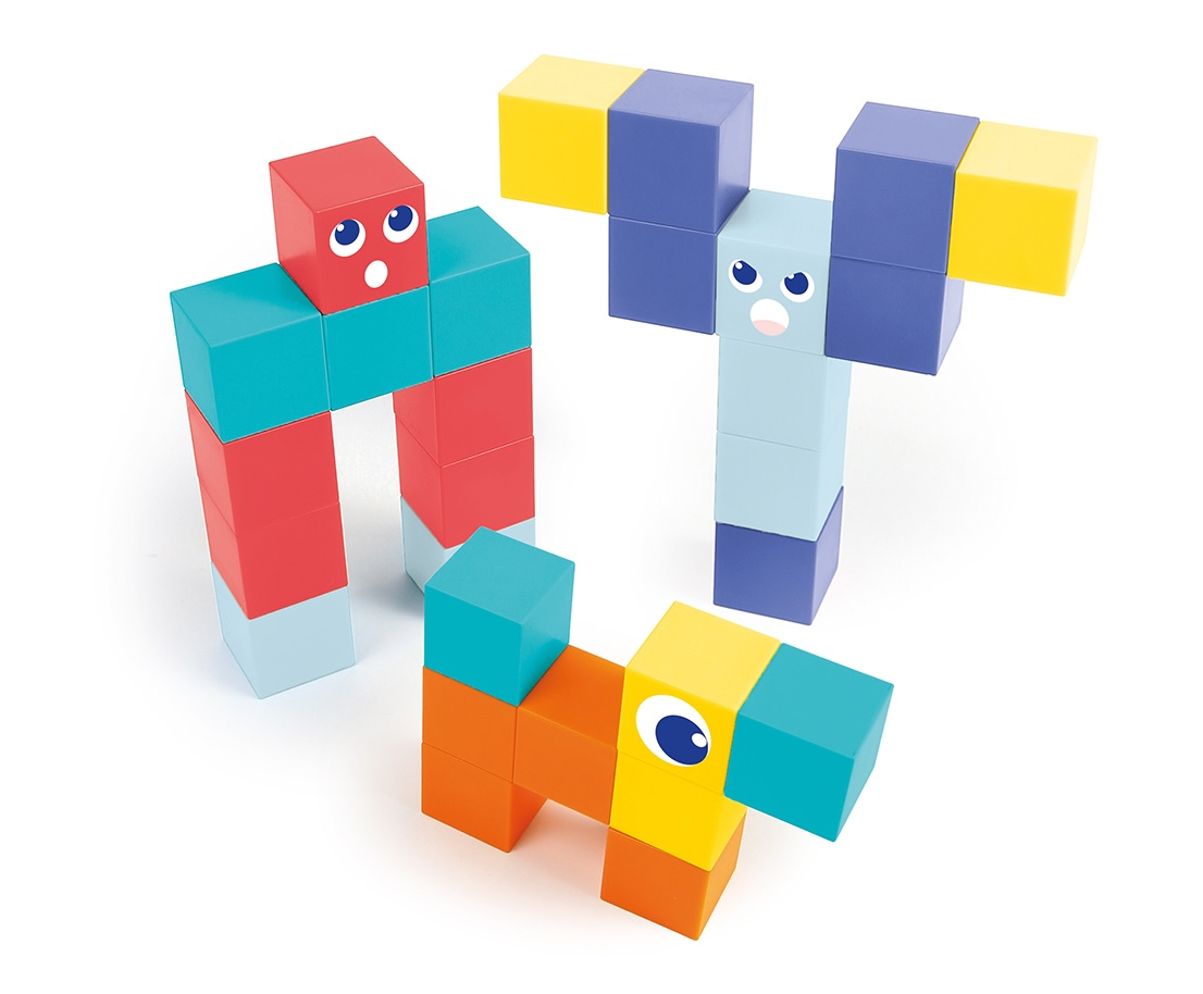 Magnetická stavebnice Ludi s kostkami je praktická cestovní sada, která zabaví děti doma i na cestách. Obsahuje 28 magnetických kostek, některé s motivy očí a obličejů, díky kterým děti snadno vytvářejí postavičky, zvířátka i malé stavby. Kostky se skládají intuitivně a magnety podporují zkoušení různých kombinací, rovnováhy a prostorového uspořádání. Součástí je kovová krabička, která slouží jako úložiště i magnetická hrací plocha, takže je stavebnice ideální do auta, do restaurace nebo na cesty. Hra rozvíjí jemnou motoriku, koordinaci oko ruka, logické uvažování i vyprávění příběhů.