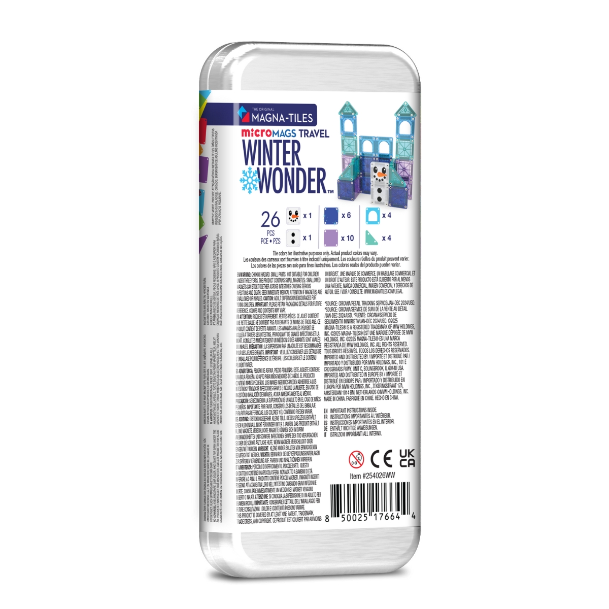 Magnetická stavebnica microMAGS Winter Wonderland Travel Set 26 dielovCestovná sada MAGNA-TILES na každý výletMagnetická stavebnica microMAGS Travel Set je ideálny spoločník na cesty. Obsahuje praktickosť a zábavu v jednom kompaktnom balení. Zimná tématika prinesie deťom do magnetickej hry záplavu zábavy a mrazivej mágie! Vďaka sviežim zimným farbám, ktoré sa trblietajú ako snehové vločky, táto sada umožňuje mladým staviteľom vytvárať ľadové hrady, postavičky a zasnežené scény.Čím je tento set špeciálny?V balené je 26 magnetických dielikov, ktoré sú o 75 % menšie ako tradičné MAGNA-TILES, čo umožňuje ešte detailnejšie stavby.Kovový plechový obal poskytuje pohodlné skladovanie, vďaka ktorému je tento set dokonalým spoločníkom na rodinné výlety - zmestí sa do batohu, kabelky alebo cestovnej tašky, takže deti môžu mať svoje obľúbené stavebné diely vždy so sebou.Magnety microMAGS sú plne kompatibilné so všetkými ostatnými stavebnicami MAGNA-TILES, čo z nich robí skvelý doplnok k existujúcim sadám.Zmysluplná stavebnica pre malých staviteľovStavebnica je nielen praktická, ale aj vysoko kvalitná a bezpečná. Dieliky sú vyrobené z potravinárskeho, netoxického plastu, ktorý neobsahuje BPA, ftaláty ani latex. Silné magnety a pevná konštrukcia zabezpečujú dlhú životnosť a nekonečné hodiny tvorivej zábavy. Táto stavebnica podporuje rozvoj jemných motorických zručností, koordinácie ruka-oko a kreativity, čo z nej robí ideálny darček pre deti vo veku už od 3 rokov.Sada obsahuje 26 magnetických dielikov microMAGS:4x pravý trojuholník,4x rovnoramenný trojuholník,6x rovnostranný trojuholník,12x štvorec.