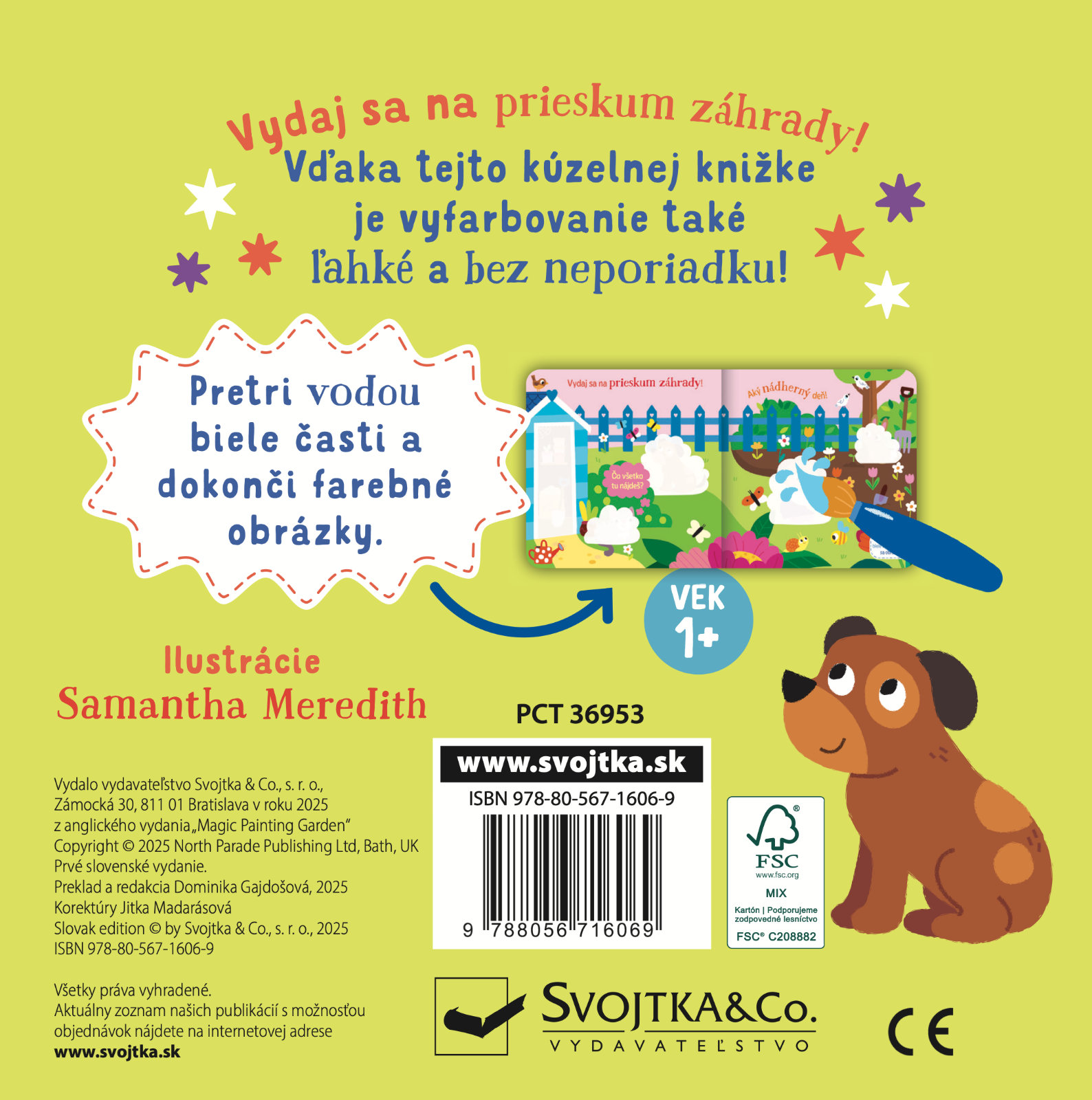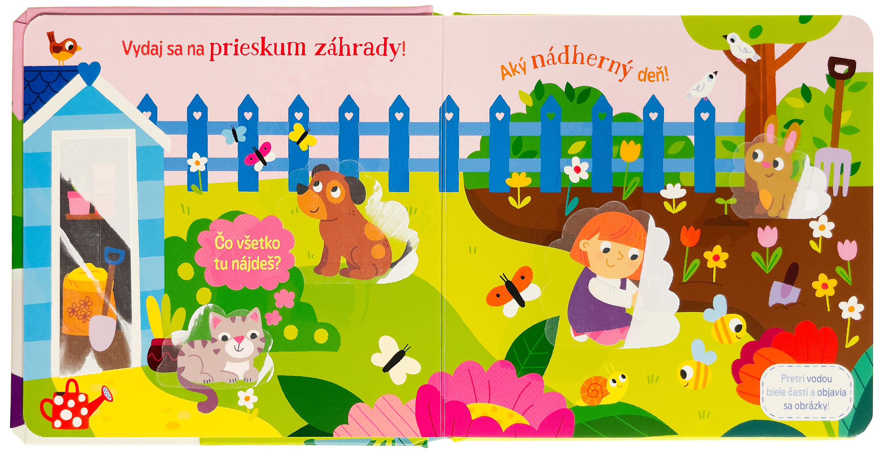 Táto knižka s pevnými stránkami s témou záhrady a čiastočne farebnými stránkami je ideálnou pre menšie deti. Biele časti stačí pretrieť vodou a obrázky sa samy vyfarbia. Použiť môžete štetec (nie je súčasťou knihy), hubku alebo len mokré prsty. Predstavivosti sa medze nekladú! Maľovanie vodou je vhodná forma na trénovanie jemnej motoriky bez neporiadku či bez zbytočného strachu z preťaženia. Počkajte, nech stránky uschnú, a môžete sa do "vyfarbovania" pustiť znovu!Počet strán: 10