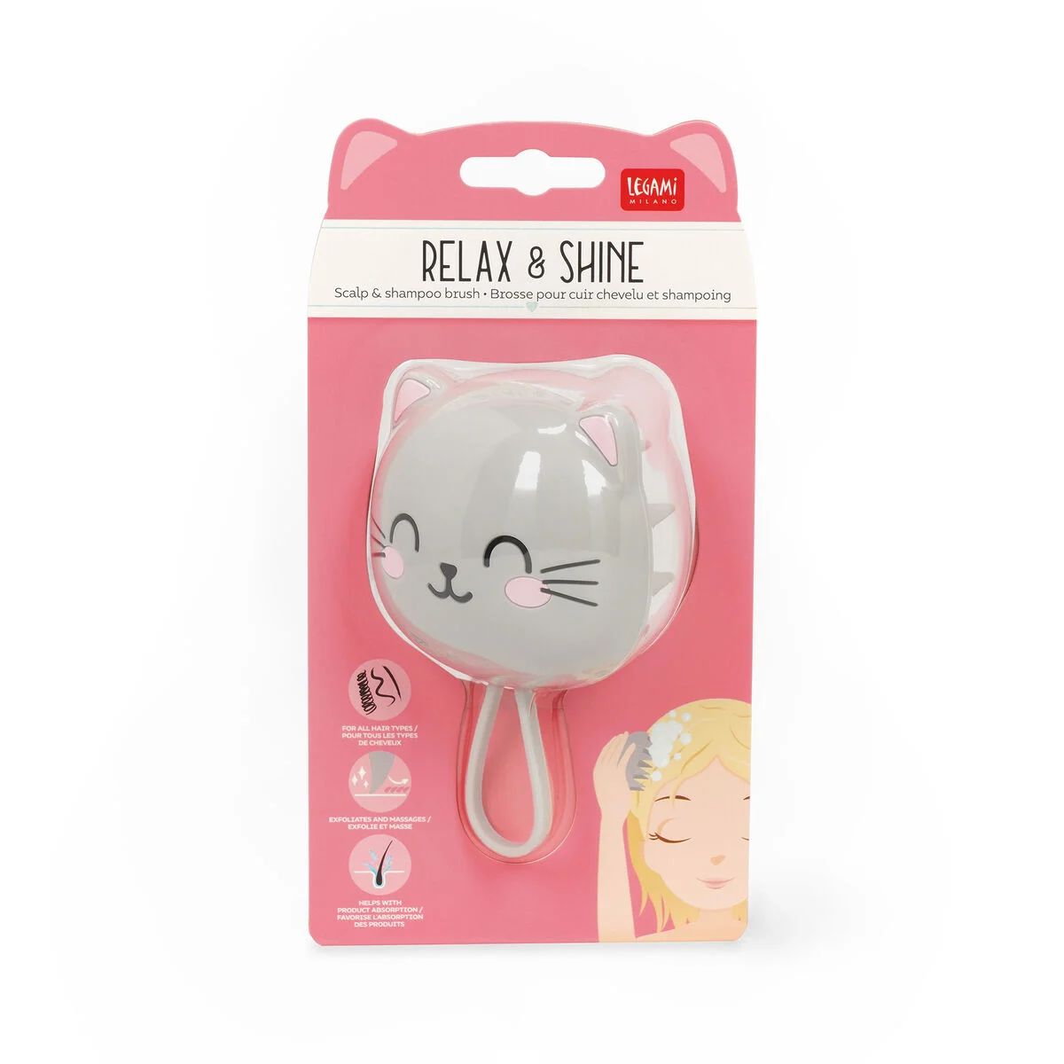 Je čas na mňaukanie: s kefou na masáž pokožky hlavy Relax & Shine od Legami si môžete užiť kúpeľnú procedúru jednoduchým prečesávaním vlasov niekoľkými krúživými pohybmi. Vďaka masážnemu pôsobeniu mäkkých silikónových štetín jemne odlupuje odumreté bunky a pomáha vstrebávať prípravky, čím zvyšuje účinnosť šampónu.