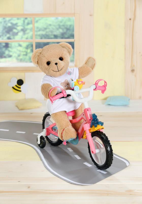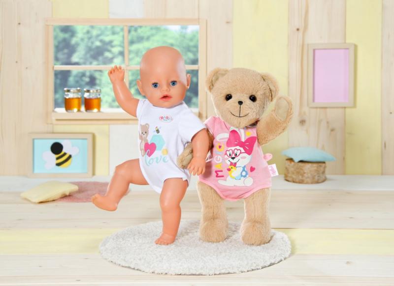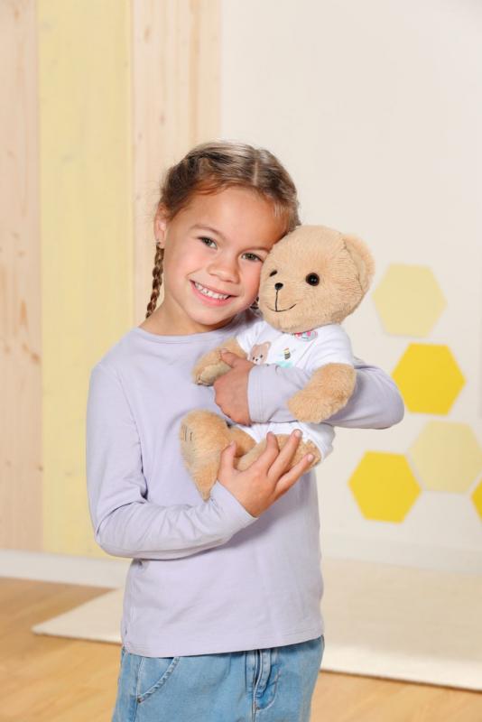 Nový kamarát pre bábiky BABY born a pre všetkých fanúšikov BABY born. Alebo je to kamarátka? Na tom nezáleží, medvedík môže byť čímkoľvek: dievčatkom, chlapčekom, bábätkom, plyšovým medvedíkom, kamarátom na hranie, maznáčikom, princeznou alebo napríklad jazdcom na skútri – od útleho veku až do doby, keď už je detstvo len vzdialenou spomienkou. Malý medvedík so sladkým úsmevom má mäkké telíčko. Je oblečený do krásneho bieleho oblečku. Má svoju vlastnú módnu kolekciu a medvedie doplnky, ale môže nosiť aj takmer čokoľvek, čo nosí bábika BABY born. Môže používať aj jej doplnky. Medvedík je navrhnutý tak, aby mu sedelo takmer všetko oblečenie pre BABY born veľkosti 43 cm. Len jej topánočky neobuje. Ale ktorý medvedík by potreboval topánočky? Vďaka pohyblivým ručičkám a nožičkám a otáčacej hlavičke ho možno ľahko prezliekať. Je veľmi pohyblivý, a preto je skvelým spoločníkom na hranie rôznych hier. Kto ako prvý niečo napíše do knižky priateľstva? Súčasťou knižky priateľstva je aj hárok samolepiek. • Medvedík BABY born. • Kamarát alebo kamarátka na hranie a maznanie na celý život. • Môže si obliecť (takmer) všetko pre BABY born. Plyšový Macko BABY born veľkosti 36 cm. Súčasťou je oblečenie, knižka priateľstva a samolepky.