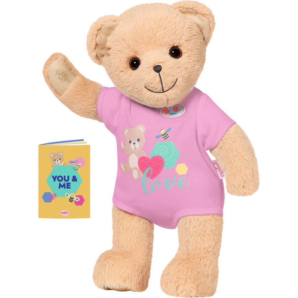 "Nový kamarát pre bábiky BABY born a pre všetkých fanúšikov BABY born. Alebo je to kamarátka? Na tom nezáleží, medvedík môže byť čímkoľvek: dievčatkom, chlapčekom, bábätkom, plyšovým medvedíkom, kamarátom na hranie, maznáčikom, princeznou alebo napríklad jazdcom na skútri – od útleho veku až do doby, keď už je detstvo len vzdialenou spomienkou. Malý medvedík so sladkým úsmevom má mäkké telíčko. Je oblečený do pekného ružového oblečku. Má svoju vlastnú módnu kolekciu a medvedie doplnky, ale môže nosiť aj takmer čokoľvek, čo nosí bábika BABY born a taktiež môže používať jej doplnky. Medvedík je navrhnutý tak, aby mu sedelo takmer všetko oblečenie pre BABY born veľkosti 43 cm. Len jej topánočky neobuje. Ale ktorý medvedík by potreboval topánočky? Vďaka pohyblivým ručičkám a nožičkám a otáčacej hlavičke ho možno ľahko prezliekať. Je veľmi pohyblivý, a preto je skvelým spoločníkom na hranie rôznych hier. Kto ako prvý niečo napíše do knižky priateľstva? Súčasťou knižky priateľstva je aj hárok samolepiek. • Medvedík BABY born. • Kamarát alebo kamarátka na hranie a maznanie na celý život. • Môže si obliecť (takmer) všetko pre BABY born. Plyšový Macko BABY born veľkosti 36 cm. Súčasťou je oblečenie, knižka priateľstva a samolepky"